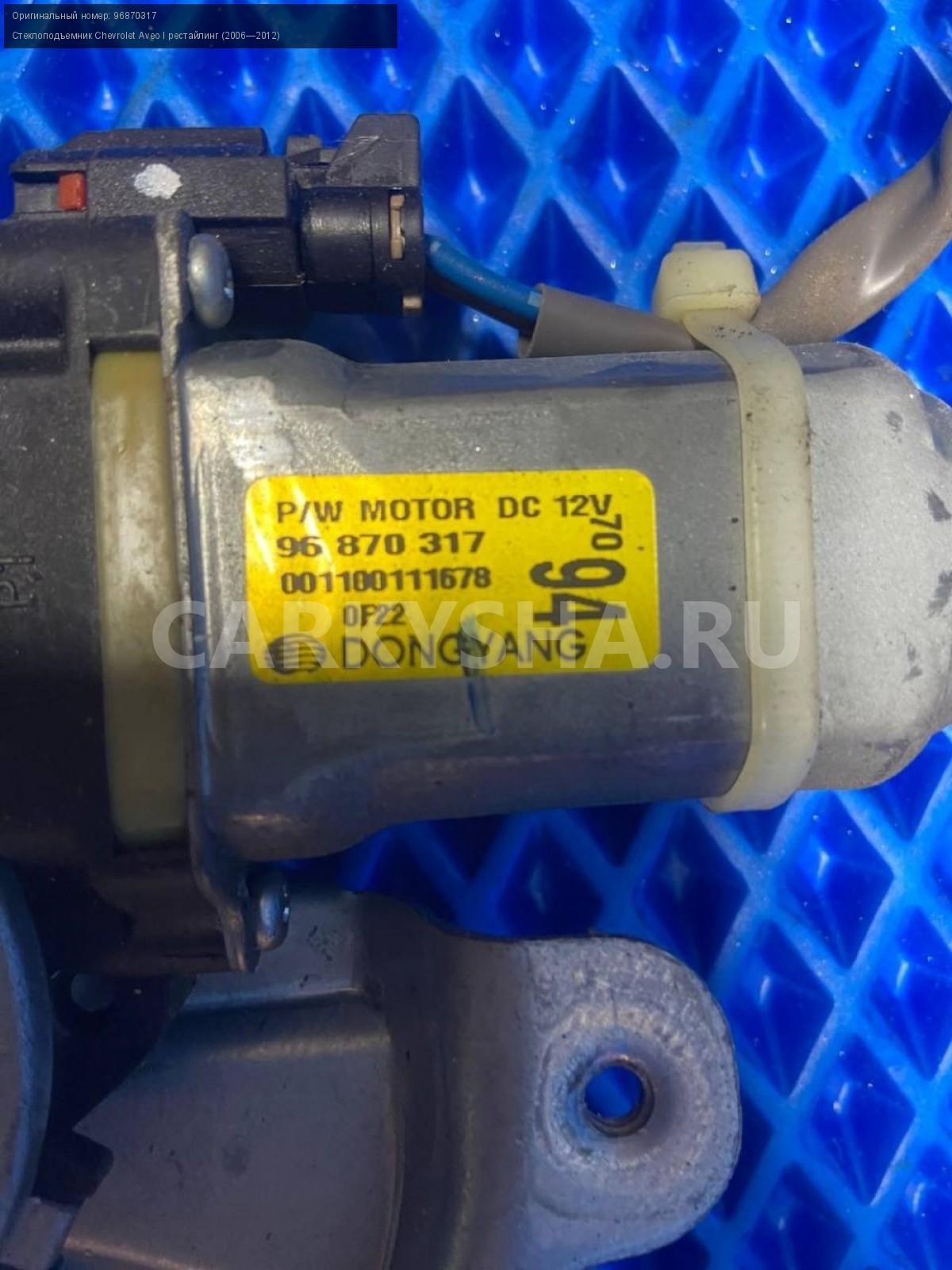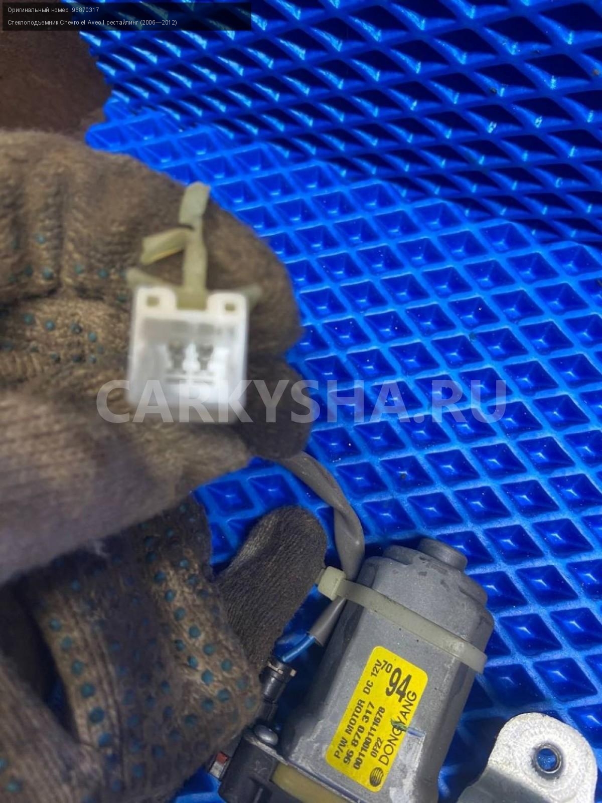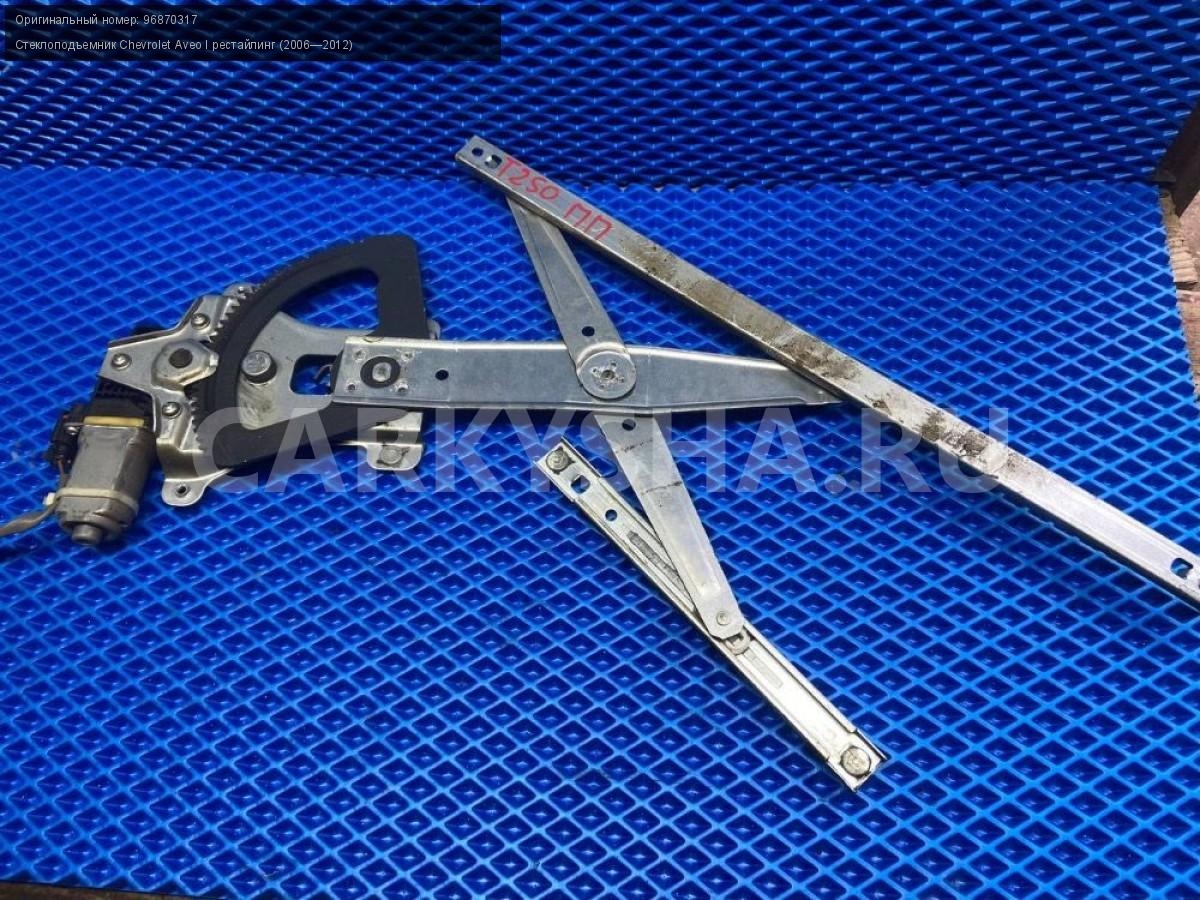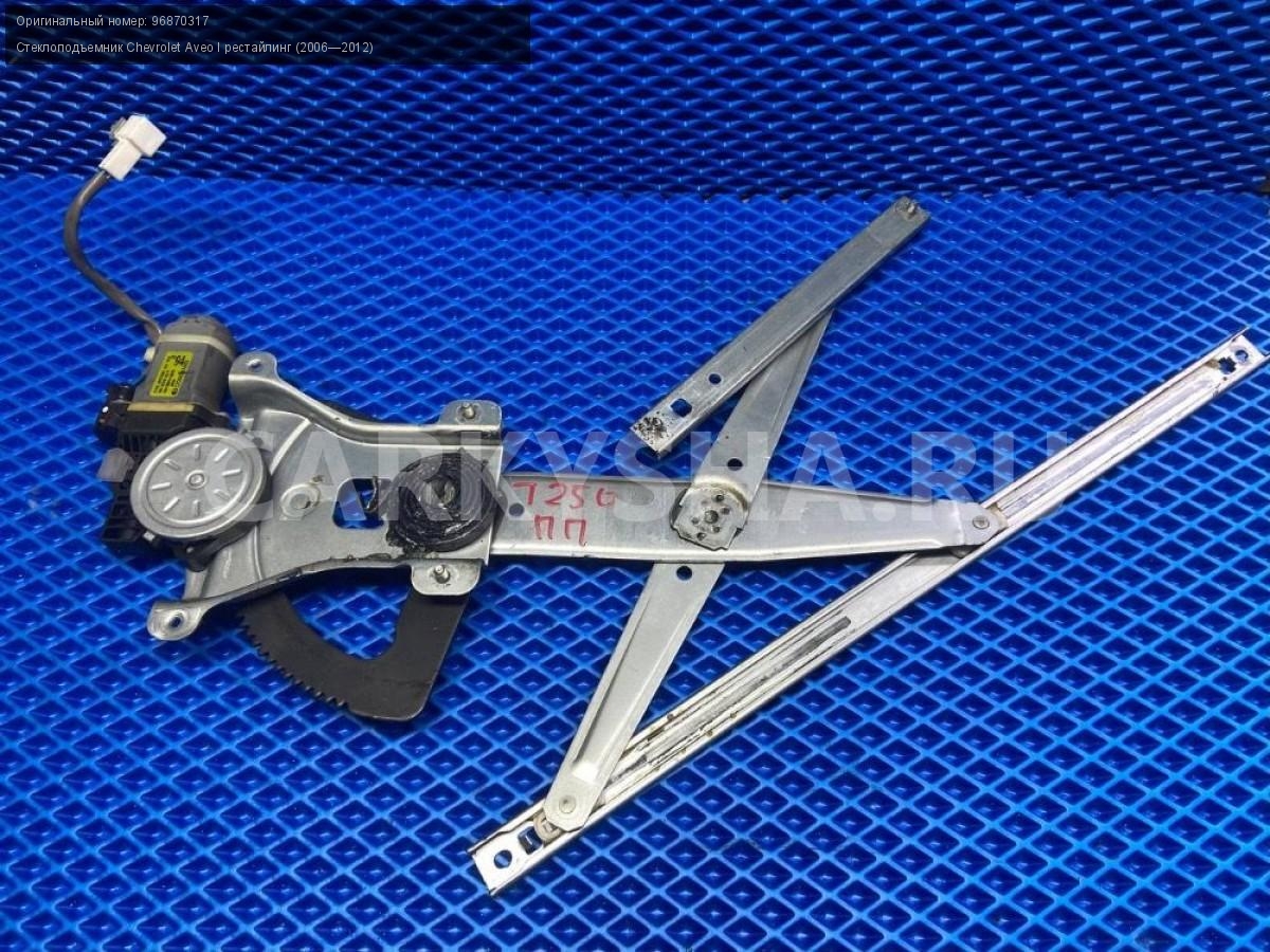 Chevrolet Aveo Т250 стеклоподъемник передн. правый\nАртикул: 7340\n\nОриг. номер: 96870317\nПроизводитель: GENERAL MOTORS\nПримечание:Шевроле Авео Т250, стеклоподъемник передней правой двери, б/у. \n\nМарка: Chevrolet\nМодель: Aveo I рестайлинг (2006—2012)\nГод выпуска: 2010\nКузов тип: Седан\nДвигатель номер: F14D4\nМодель двигателя: инжектор\nОбъем: 1.4\nТопливо: Бензин\nКоробка: Механика\nЦвет: Белый\nПраво/Лево: Право\nПеред/Зад: Перед\nСовместимости: Chevrolet Aveo I рестайлинг (2006—2012) 1.4 MT (101 л.с.)\nСовместимость: