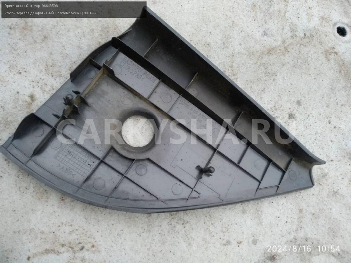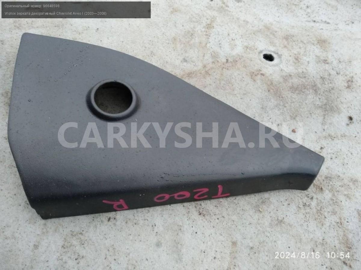 Chevrolet Aveo Т200, уголок зеркала правого.\nАртикул: 5487\n\nОриг. номер: 96648598\nПроизводитель: GENERAL MOTORS\nПримечание:Шевроле Авео Т200, внутренний уголок зеркала правого, б/у. \n\nМарка: Chevrolet\nМодель: Aveo I (2003—2008)\nГод выпуска: 2007\nКузов тип: Хетчбэк\nДвигатель номер: B12S1\nМодель двигателя: инжектор\nОбъем: 1.2\nТопливо: Бензин\nКоробка: Механика\nЦвет: Темно-серый\nПраво/Лево: Право\nСовместимости: Chevrolet Aveo I (2003—2008) 1.2 MT (72 л.с.)\nСовместимость: