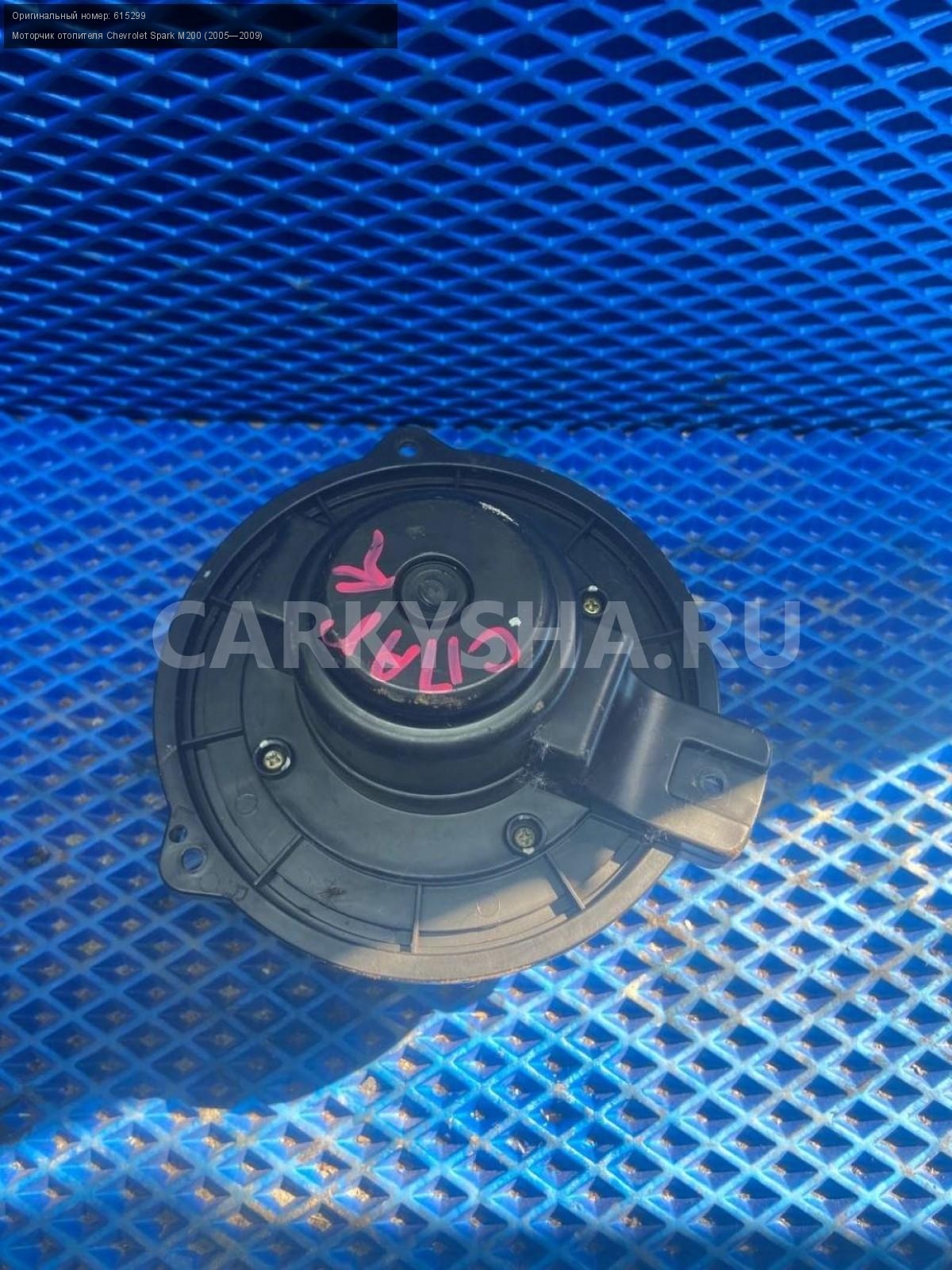 Chevrolet Spark M200, моторчик печки.\nАртикул: 7961\n\nОриг. номер: 615299\nПроизводитель: GENERAL MOTORS\nПримечание:Шевроле Спарк М200, моторчик печки , б/у. \n\nМарка: Chevrolet\nМодель: Spark M200 (2005—2009)\nГод выпуска: 2006\nКузов тип: Хетчбэк\nДвигатель номер: B10D1\nМодель двигателя: инжектор\nОбъем: 1.0\nТопливо: Бензин\nКоробка: Механика\nЦвет: Серебристый\nСовместимости: Chevrolet Spark M200 (2005—2009) 1.0 MT (66 л.с.)\nСовместимость: