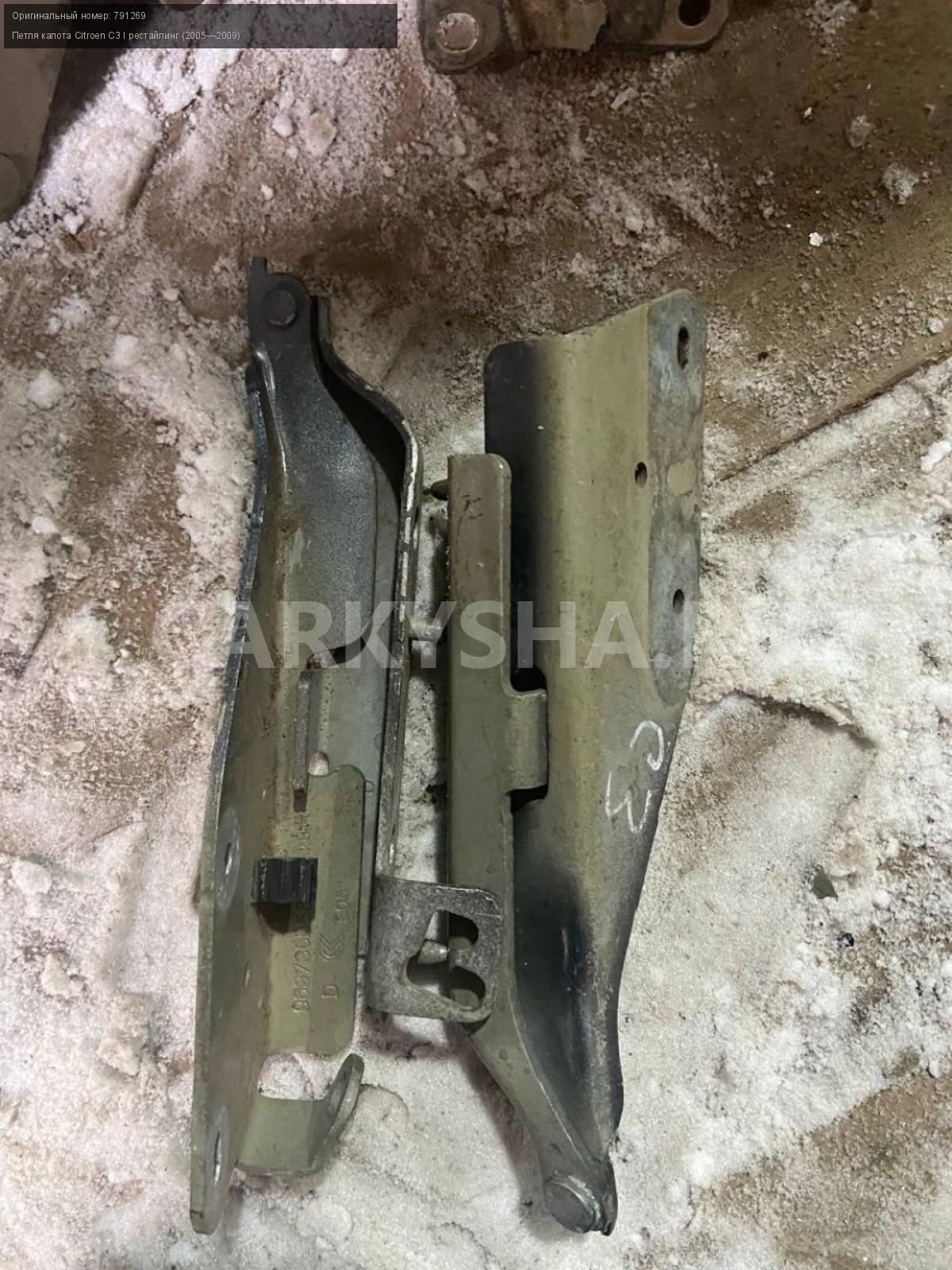 Citroen C3, петли капота.\nАртикул: 4016\n\nОриг. номер: 791269\nПроизводитель: Peugeot-Citroen\nПримечание:Ситроен С3, (до 2009гв), петли капота, цена за пару, б/у. \n\nМарка: Citroen\nМодель: C3 I рестайлинг (2005—2009)\nСовместимости: Citroen C3 I рестайлинг (2005—2009)\nСовместимость: