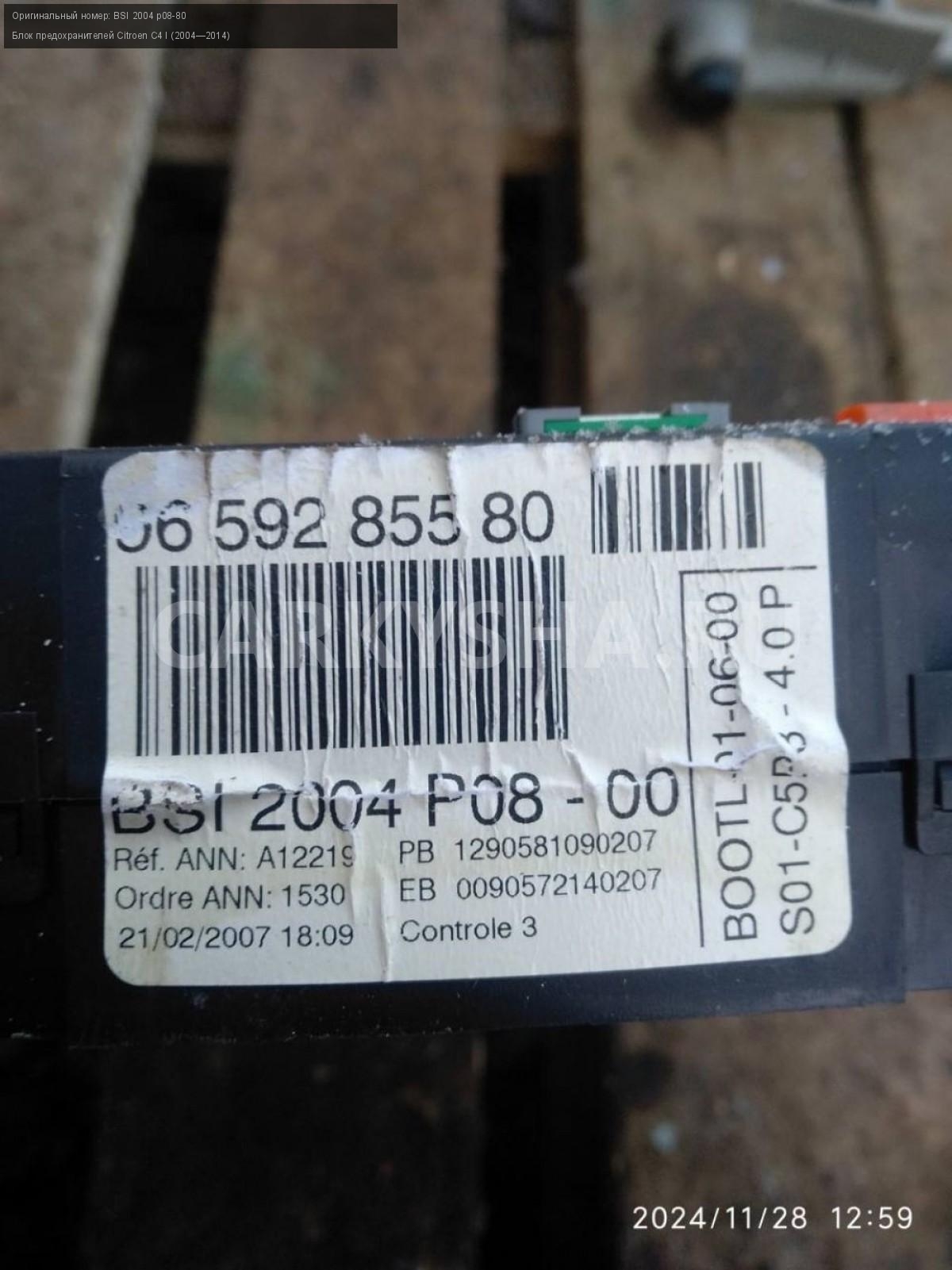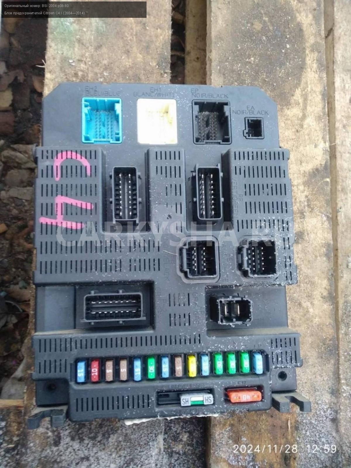 Citroen C4 купе, блок предохранителей BSI.\nАртикул: 6478\n\nОриг. номер: BSI 2004 p08-80\nПроизводитель: Peugeot-Citroen\nПримечание:Ситроен С4 купе , блок предохранителей BSI , б/у. \n\nМарка: Citroen\nМодель: C4 I (2004—2014)\nГод выпуска: 2007\nКузов тип: Купе\nДвигатель номер: TU5JP4\nМодель двигателя: инжектор\nОбъем: 1.6\nТопливо: Бензин\nКоробка: Автомат\nЦвет: Черный\nСовместимости: Citroen C4 I (2004—2014) 1.6 AT (109 л.с.)\nСовместимость: