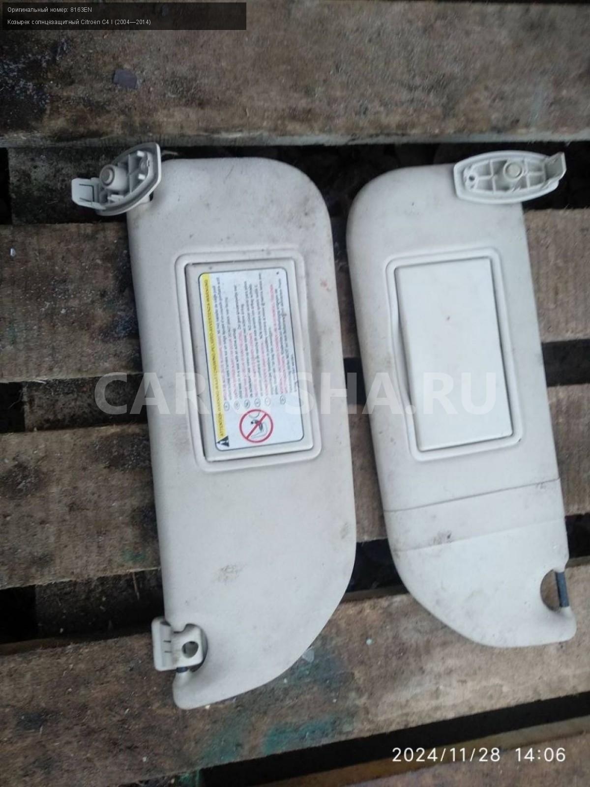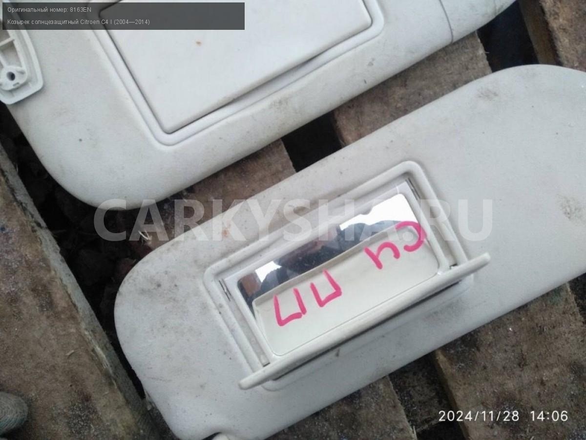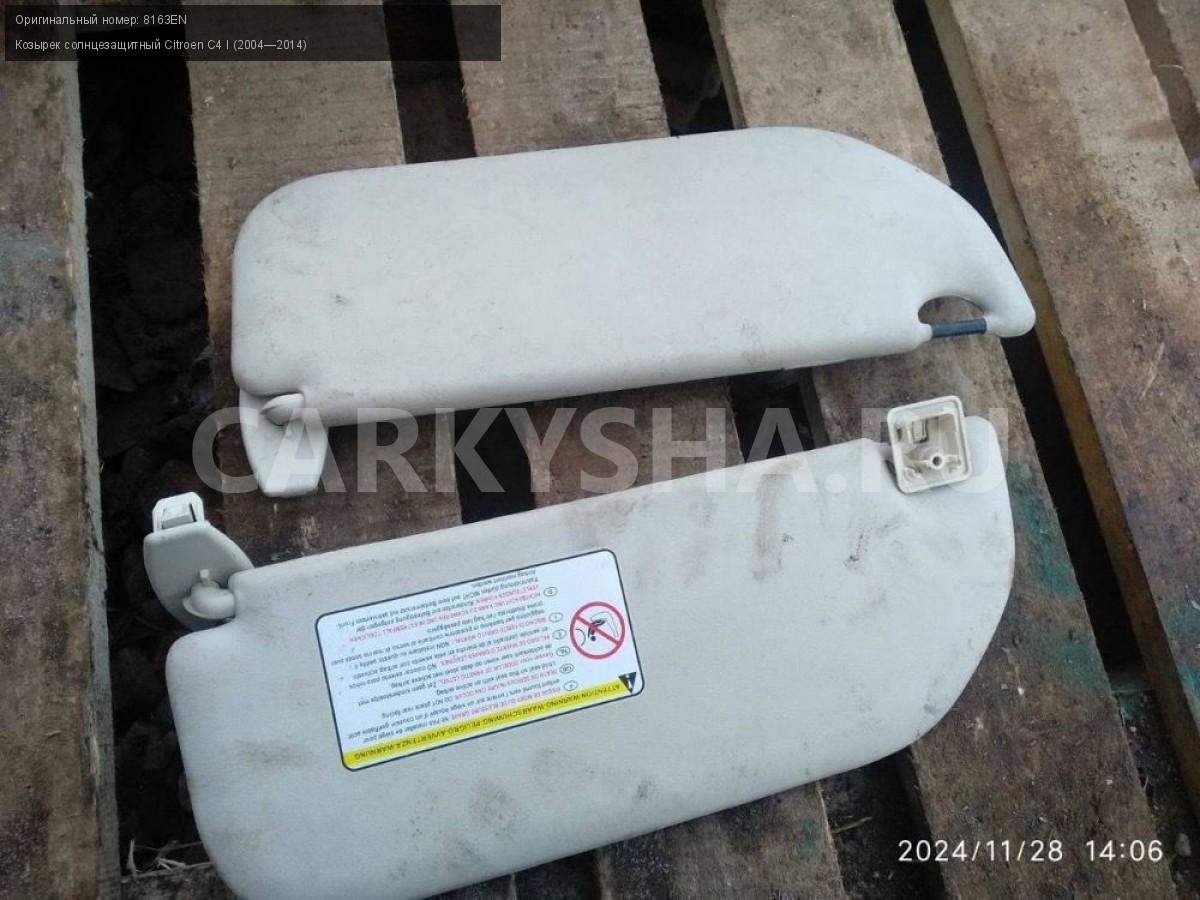 Citroen C4, купе, козырьки солнцезащитные пара.\nАртикул: 6485\n\nОриг. номер: 8163EN\nПроизводитель: Ctr\nПримечание:Ситроен С4 купе, козырьки солнцезащитные, цена за пару, б/у. \n\nМарка: Citroen\nМодель: C4 I (2004—2014)\nГод выпуска: 2007\nКузов тип: Купе\nДвигатель номер: TU5JP4\nМодель двигателя: инжектор\nОбъем: 1.6\nТопливо: Бензин\nКоробка: Автомат\nЦвет: Черный\nПраво/Лево: Право/Лево\nПеред/Зад: Перед\nСовместимости: Citroen C4 I (2004—2014) 1.6 AT (109 л.с.)\nСовместимость: