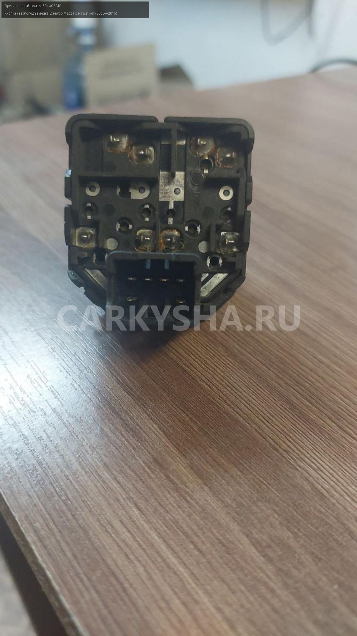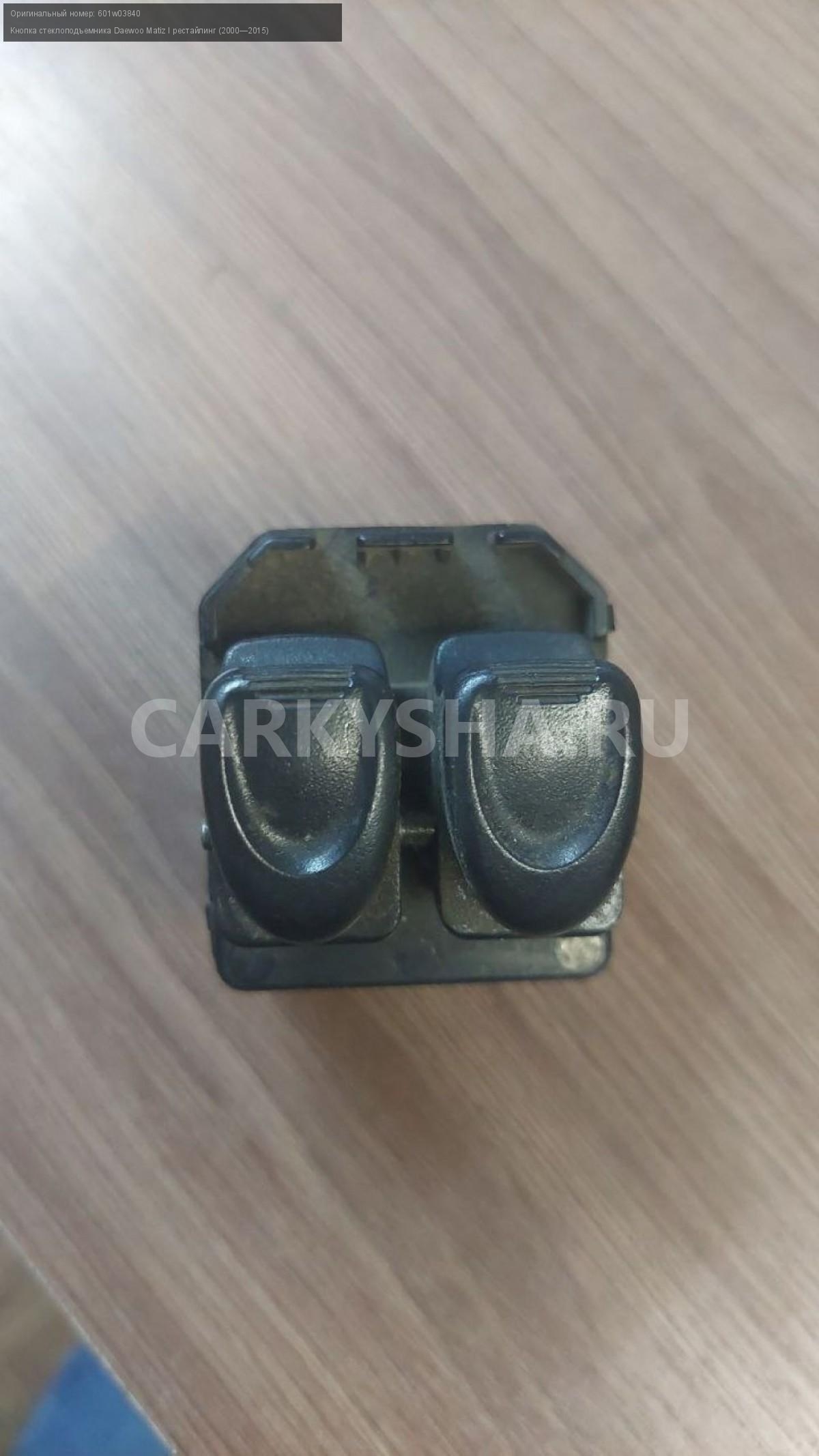 Daewoo Matiz, кнопки стеклоподъемника.\nАртикул: 4831\n\nОриг. номер: 601w03840\nПроизводитель: DAEWOO\nПримечание:Дэу Матиз, кнопки стеклоподъемника, бу. \n\nМарка: Daewoo\nМодель: Matiz I рестайлинг (2000—2015)\nСовместимости: Daewoo Matiz I рестайлинг (2000—2015)\nСовместимость: