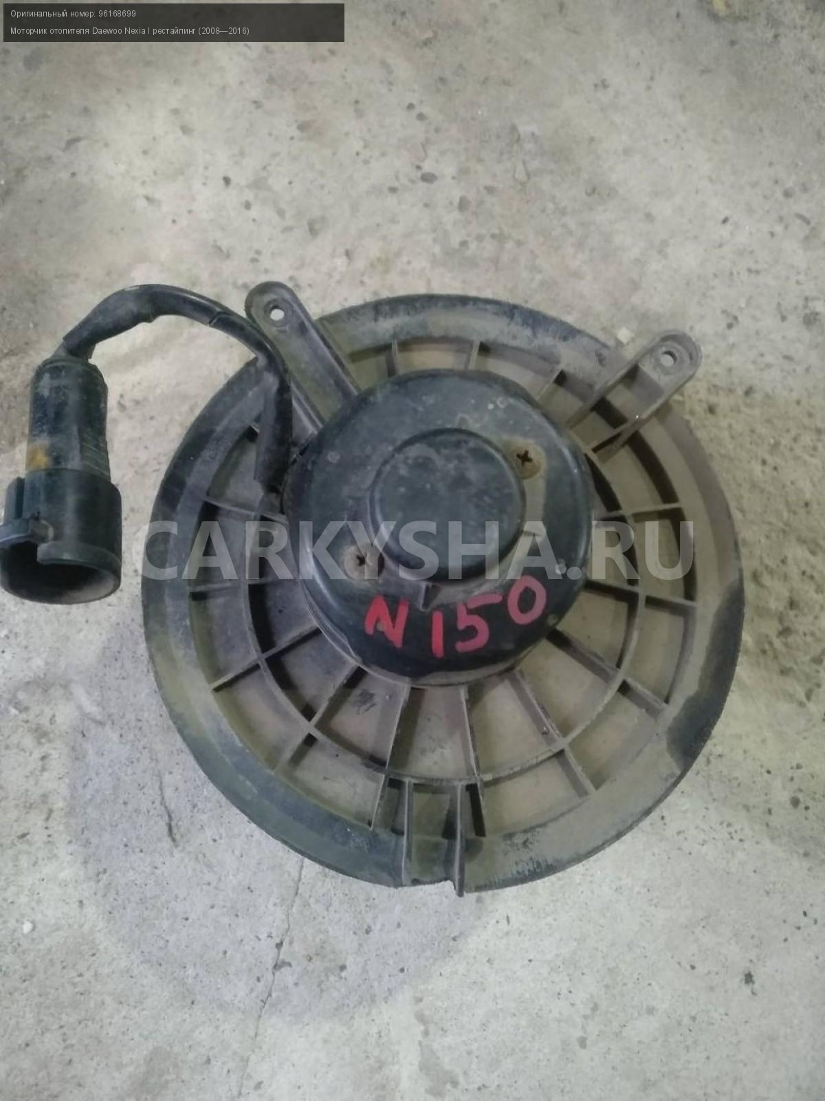 Daewoo Nexia N150 моторчик печки.\nАртикул: 6559\n\nОриг. номер: 96168699\nПроизводитель: GENERAL MOTORS\nПримечание:Дэу Нексия N150, моторчик печки, б/у. \n\nМарка: Daewoo\nМодель: Nexia I рестайлинг (2008—2016)\nГод выпуска: 2012\nКузов тип: Седан\nДвигатель номер: F16D3\nМодель двигателя: инжектор\nОбъем: 1.6\nТопливо: Бензин\nКоробка: Механика\nСовместимости: Daewoo Nexia I рестайлинг (2008—2016) 1.6 MT (109 л.с.)\nСовместимость: