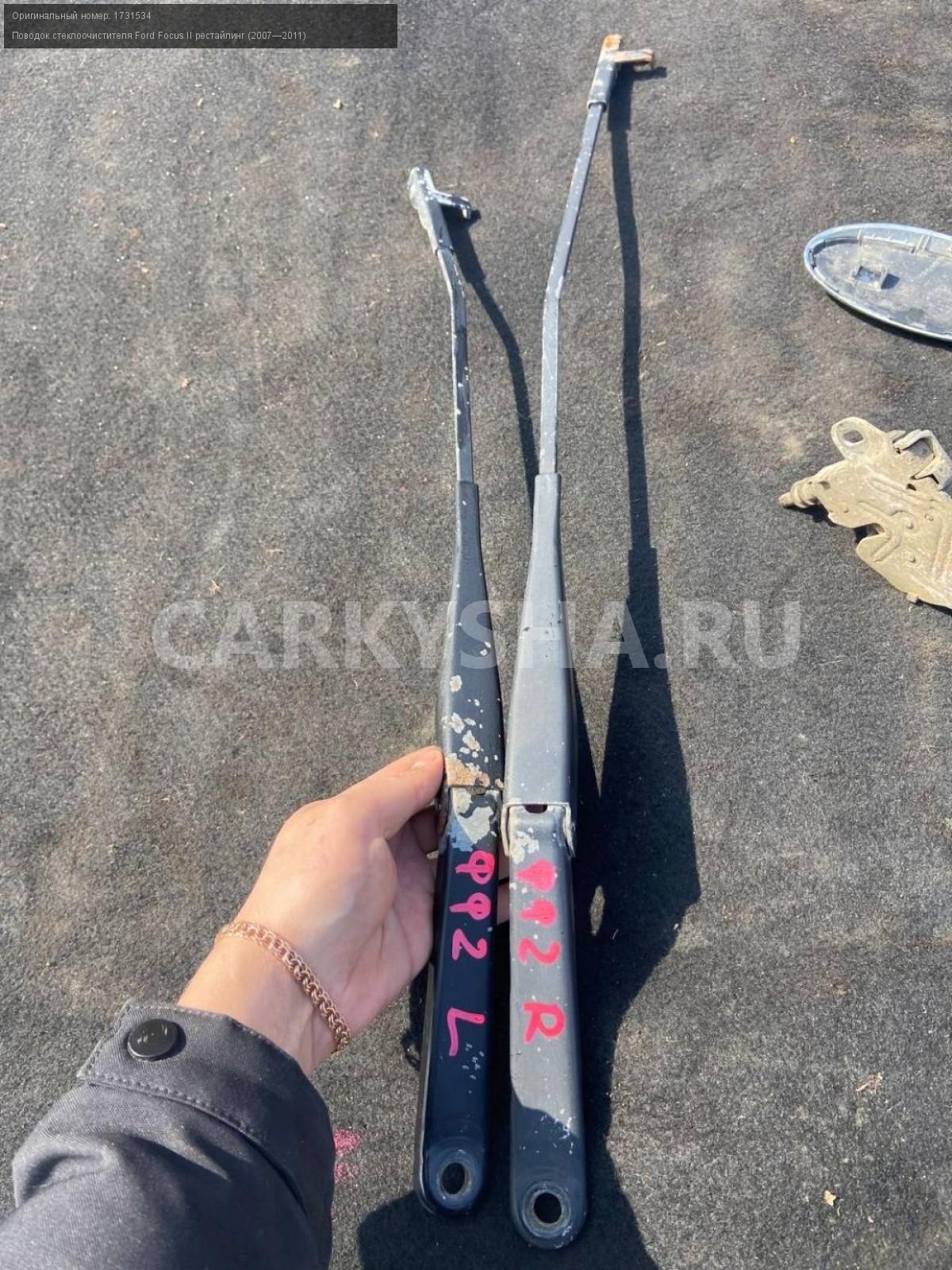 Ford Focus II рестайлинг, поводки дворников.\nАртикул: 4573\n\nОриг. номер: 1731534\nПроизводитель: FORD\nПримечание:Форд Фокус 2 рестайлинг, поводки дворников, цена за пару, бу. \n\nМарка: Ford\nМодель: Focus II рестайлинг (2007—2011)\nГод выпуска: 2010\nКузов тип: Хетчбэк\nМодель двигателя: инжектор\nОбъем: 1.6\nТопливо: Бензин\nКоробка: Автомат\nПраво/Лево: Право/Лево\nПеред/Зад: Перед\nСовместимости: Ford Focus II рестайлинг (2007—2011) 1.6 AT (100 л.с.)\nСовместимость: