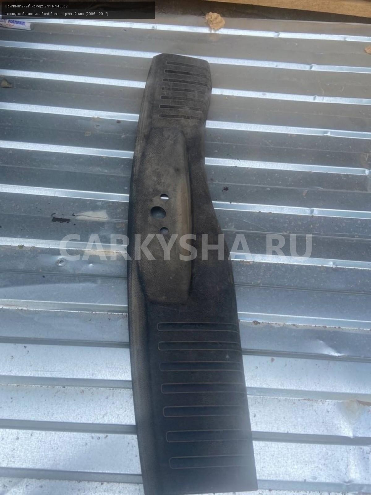 Ford Fusion I рест., накладка багажника\nАртикул: 3074\n\nОриг. номер: 2N11-N40352\nПроизводитель: FORD\nПримечание:Форд Фьюжен, накладка багажника, б/у\n\nМарка: Ford\nМодель: Fusion I рестайлинг (2005—2012)\nГод выпуска: 2010\nКузов тип: Хетчбэк\nДвигатель номер: FXJA\nМодель двигателя: инжектор\nОбъем: 1.4\nТопливо: Бензин\nКоробка: Механика\nЦвет: Черный\nВерх/Низ: Низ\nПеред/Зад: Зад\nСовместимости: Ford Fusion I рестайлинг (2005—2012) 1.4 MT (80 л.с.)\nСовместимость: