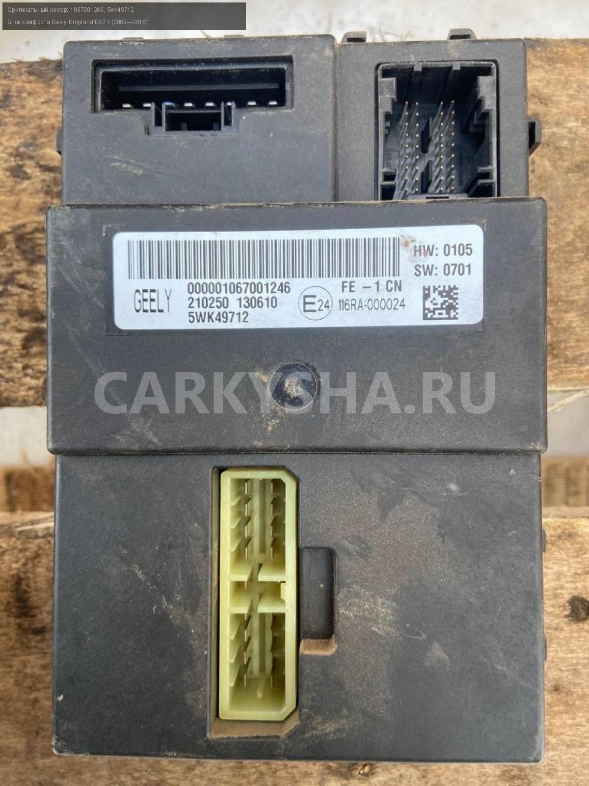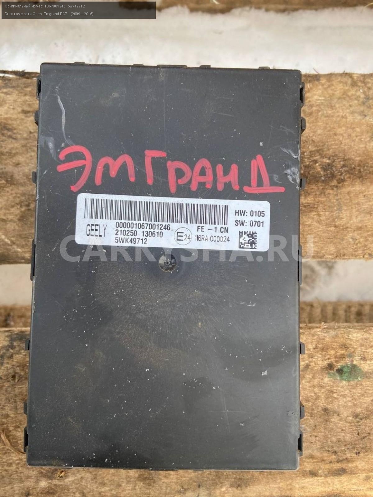 Geely Emgrand EC7, Блок комфорта.\nАртикул: 7011\n\nОриг. номер: 1067001246\nНомера замен: 5wk49712\nПроизводитель: GEELY\nПримечание:Джили Эмгранд ЕС7, блок комфорта, б/у. \n\nМарка: Geely\nМодель: Emgrand EC7 I (2009—2016)\nГод выпуска: 2013\nКузов тип: Седан\nДвигатель номер: JL4G15D\nМодель двигателя: инжектор\nОбъем: 1.5\nТопливо: Бензин\nКоробка: Механика\nЦвет: Черный\nСовместимости: Geely Emgrand EC7 I (2009—2016) 1.5 MT (98 л.с.)\nСовместимость: