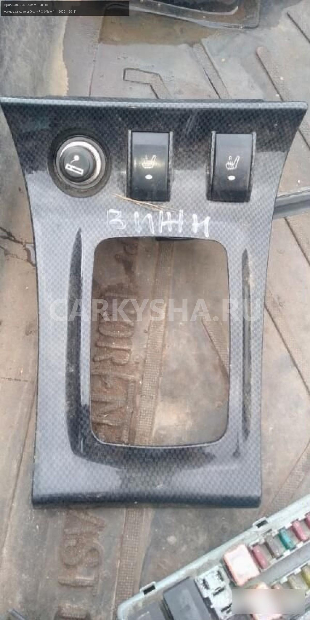 Geely vision накладка кулисы\nАртикул: 1855\n\nОриг. номер: JL4G18\nПроизводитель: GEELY\nПримечание:Geely vision накладка кулисы в сборе.НАЛИЧИЕ ЗАПЧАСТИ УТОЧНИТЕ ПО ТЕЛЕФОНУ ИЛИ В СООБЩЕНИЯХ,б/у, а так же множество авто в разборе, работаем с регионами отправка тк, выкуп авто после дтп по всей России, отправка тк осуществляется после 100% оплаты, наложенным платежом не работаем, стоимость доставки не рассчитываем\n\nМарка: Geely\nМодель: FC (Vision) I (2006—2011)\nКузов тип: Седан\nОбъем: 1.8\nТопливо: Бензин\nКоробка: Механика\nСовместимости: Geely FC (Vision) I (2006—2011) 1.8 MT (133 л.с.)\nСовместимость: