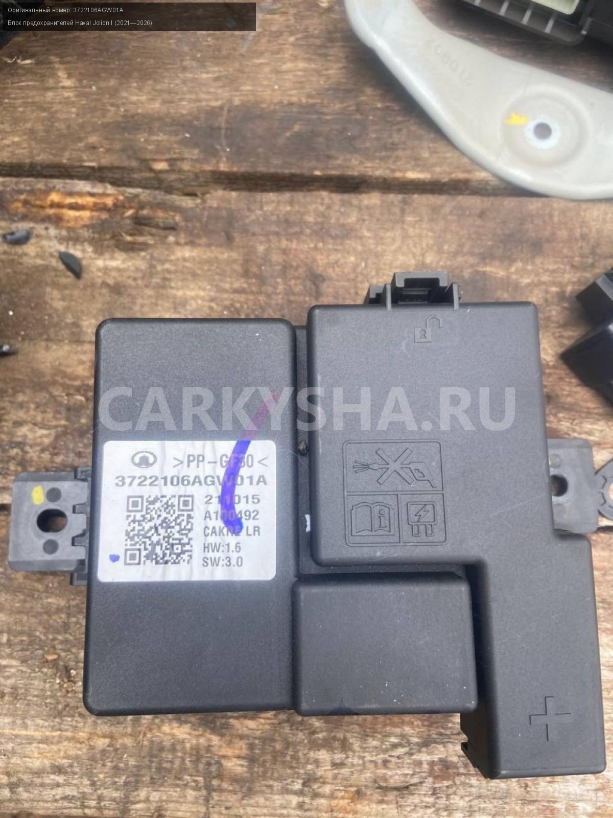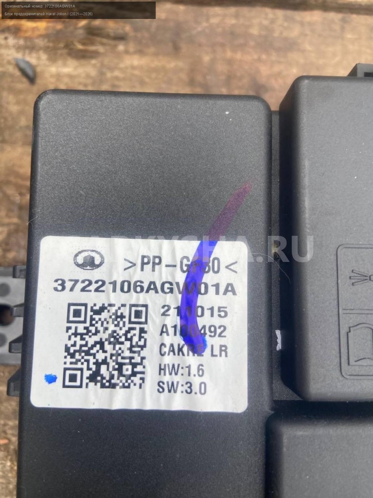 Haval Jolion, Блок предохранителей в багажнике.\nАртикул: 8350\n\nОриг. номер: 3722106AGW01A\nПроизводитель: Haval\nПримечание:Хавал Джулион , блок предохранителей в багажнике, б/у. \n\nМарка: Haval\nМодель: Jolion I (2021—2026)\nГод выпуска: 2022\nКузов тип: Внедорожник\nМодель двигателя: инжектор\nОбъем: 1.5\nТопливо: Бензин\nКоробка: Робот\nСовместимости: Haval Jolion I (2021—2026) 1.5 AMT (143 л.с.)\nСовместимость: