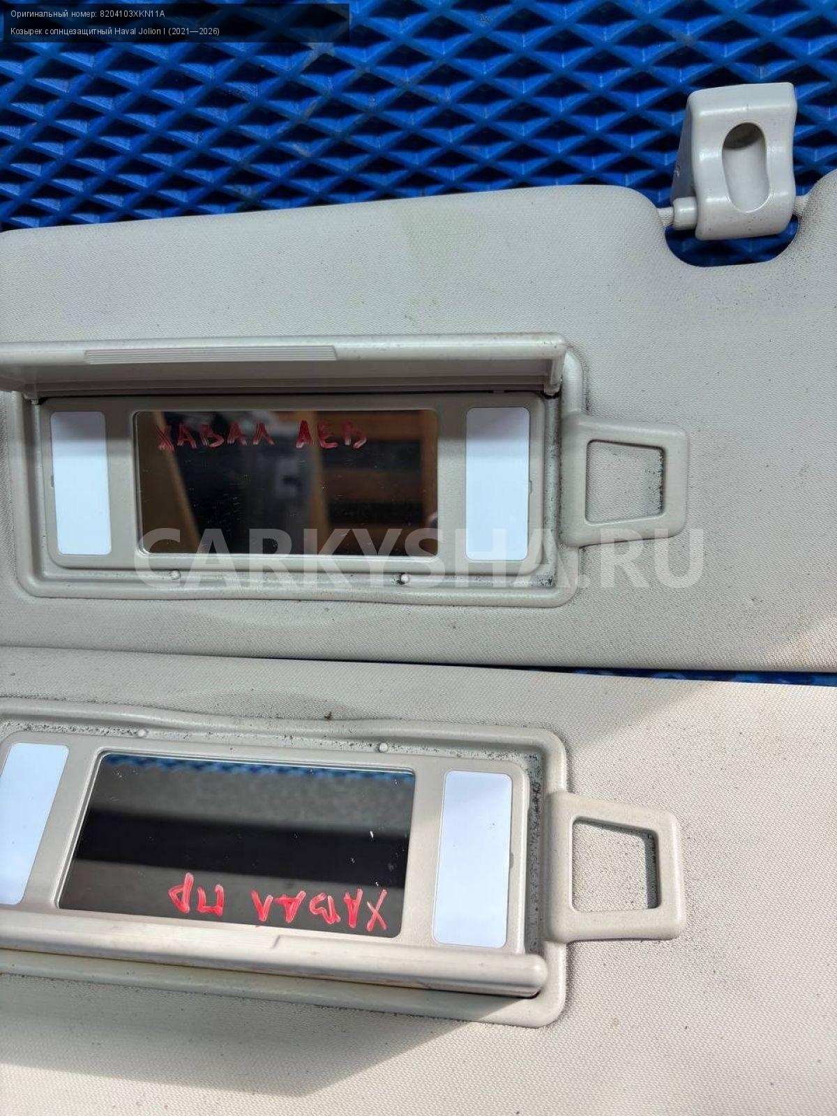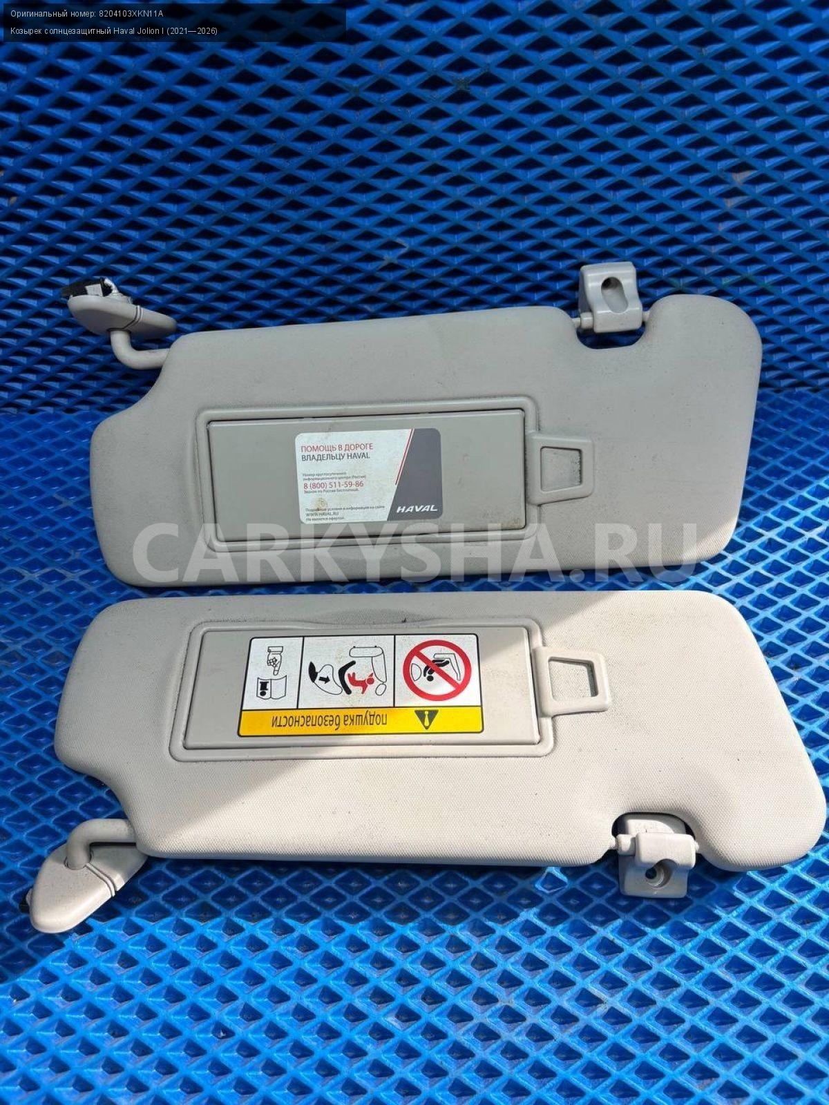 Haval Jolion, козырьки солнцезащитные пара.\nАртикул: 8551\n\nОриг. номер: 8204103XKN11A\nПроизводитель: Haval\nПримечание:Хавал Джулион, козырьки солнцезащитные, цена за пару, б/у. \n\nМарка: Haval\nМодель: Jolion I (2021—2026)\nГод выпуска: 2022\nКузов тип: Внедорожник\nМодель двигателя: инжектор\nОбъем: 1.5\nТопливо: Бензин\nКоробка: Робот\nПраво/Лево: Право/Лево\nСовместимости: Haval Jolion I (2021—2026) 1.5 AMT (143 л.с.)\nСовместимость: