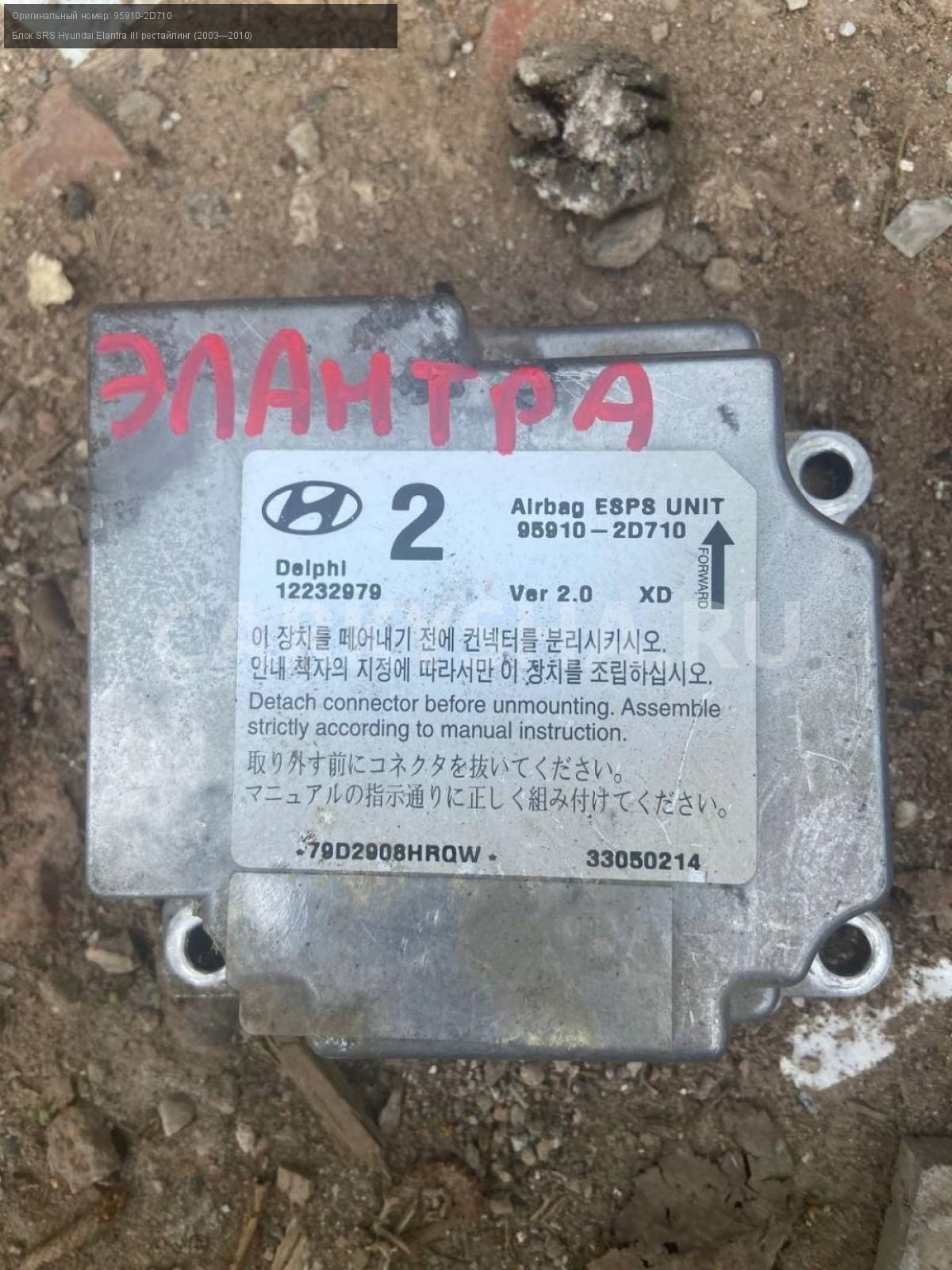 Hyundai Elantra III, Блок SRS\nАртикул: 5132\n\nОриг. номер: 95910-2D710\nПроизводитель: Hyundai-KIA\nПримечание:Хендай Элантра 3, блок срс, б/у. \n\nМарка: Hyundai\nМодель: Elantra III рестайлинг (2003—2010)\nГод выпуска: 2005\nКузов тип: Седан\nДвигатель номер: G4ED\nМодель двигателя: турбо\nОбъем: 1.6\nТопливо: Бензин\nКоробка: Автомат\nЦвет: Серебристый\nСовместимости: Hyundai Elantra III рестайлинг (2003—2010) 1.6 AT (105 л.с.)\nСовместимость: