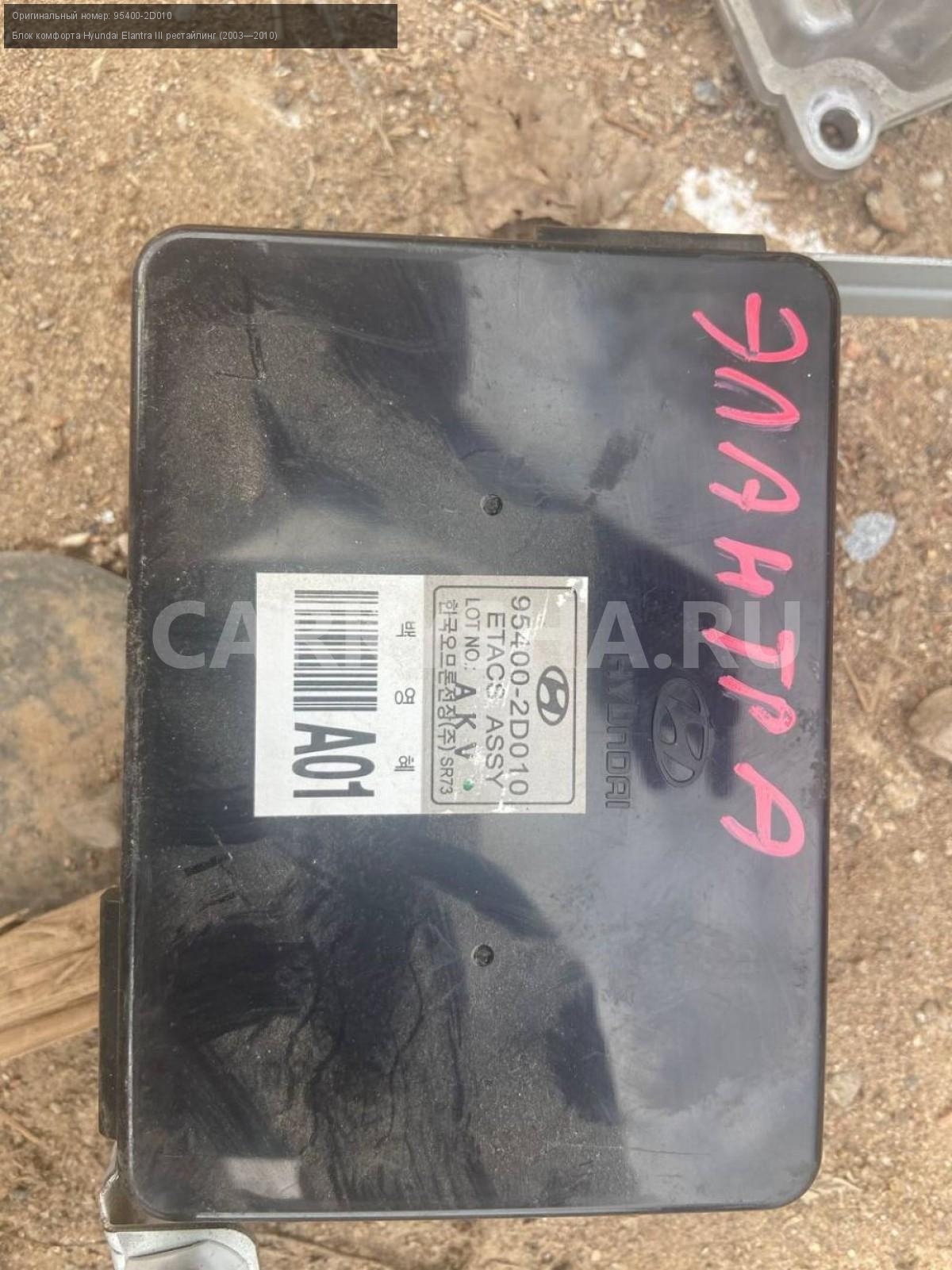 Hyundai Elantra III, Блок комфорта.\nАртикул: 5109\n\nОриг. номер: 95400-2D010\nПроизводитель: Hyundai-KIA\nПримечание:Хендай Элантра 3, блок комфорта, б/у. \n\nМарка: Hyundai\nМодель: Elantra III рестайлинг (2003—2010)\nГод выпуска: 2005\nКузов тип: Седан\nДвигатель номер: G4ED\nМодель двигателя: турбо\nОбъем: 1.6\nТопливо: Бензин\nКоробка: Автомат\nЦвет: Серебристый\nСовместимости: Hyundai Elantra III рестайлинг (2003—2010) 1.6 AT (105 л.с.)\nСовместимость: