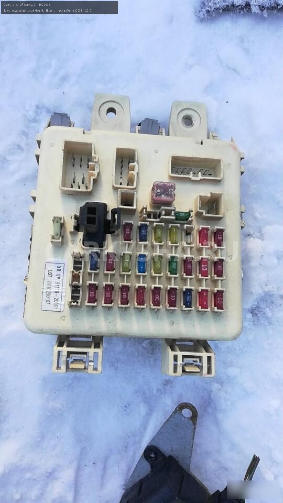 Hyundai elantra xd 2.0 блок предохранителей\nАртикул: 162\n\nОриг. номер: 911102D001\nПроизводитель: Hyundai-KIA\nПримечание:Hyundai elantra xd 2.0 АКПП блок предохранителей.НАЛИЧИЕ ЗАПЧАСТИ УТОЧНИТЕ ПО ТЕЛЕФОНУ ИЛИ В СООБЩЕНИЯХ,б/у, а так же множество авто в разборе, работаем с регионами отправка тк, выкуп авто после дтп по всей России, отправка тк осуществляется после 100% оплаты, наложенным платежом не работаем, стоимость доставки не рассчитываем\n\nМарка: Hyundai\nМодель: Elantra III рестайлинг (2003—2010)\nКузов тип: Седан\nОбъем: 1.6\nТопливо: Бензин\nКоробка: Механика\nСовместимости: Hyundai Elantra III рестайлинг (2003—2010) 1.6 MT (105 л.с.)\nСовместимость: