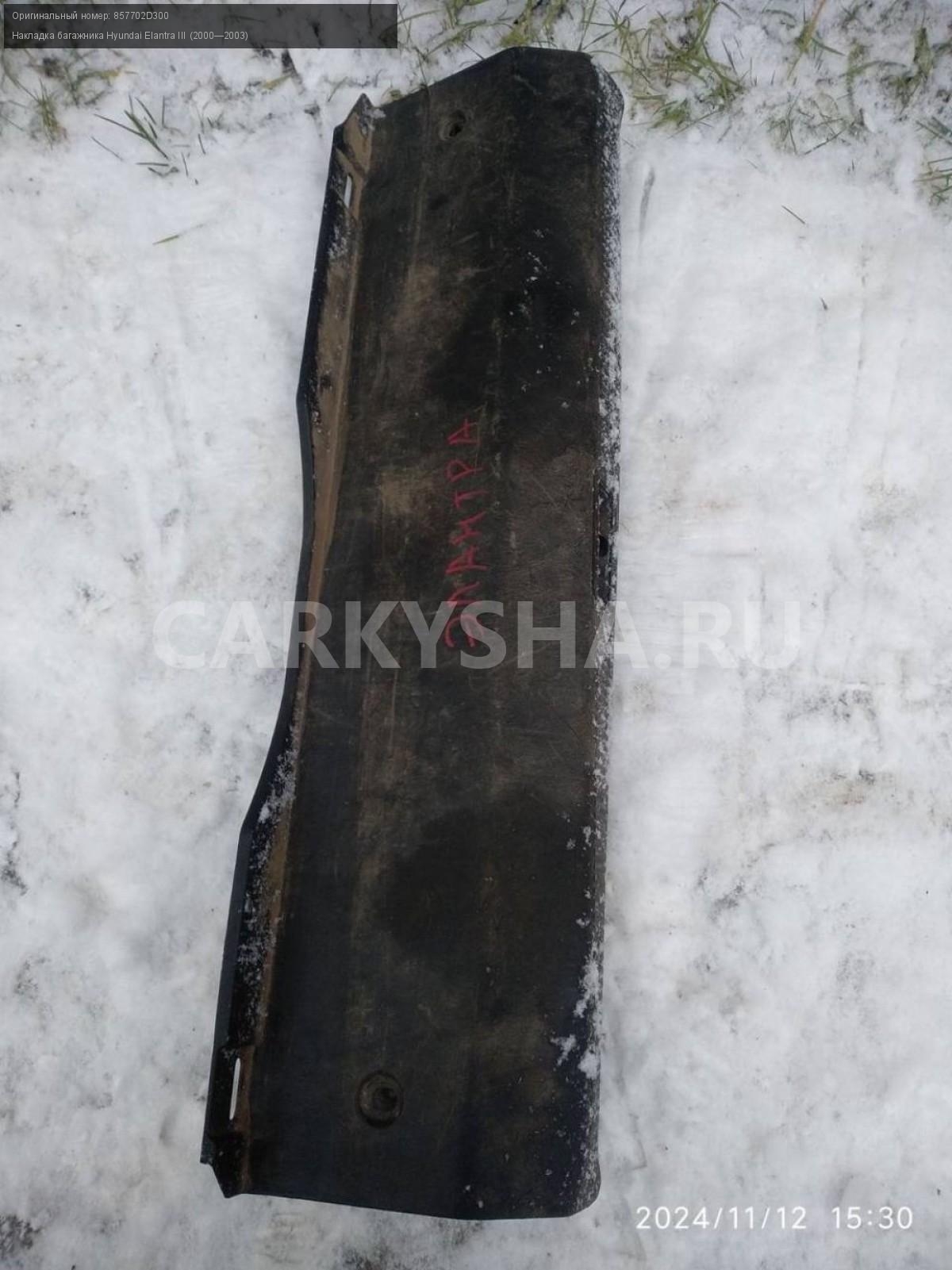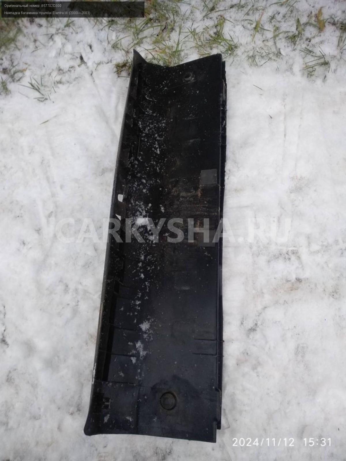 Hyundai Elantra III, замковая панель багажника.\nАртикул: 6254\n\nОриг. номер: 857702D300\nПроизводитель: Hyundai-KIA\nПримечание:Хендай Элантра 3, замковая панель багажника, (накладка багажника), б/у. \n\nМарка: Hyundai\nМодель: Elantra III (2000—2003)\nГод выпуска: 2003\nКузов тип: Седан\nДвигатель номер: G4GC\nМодель двигателя: инжектор\nОбъем: 2.0\nТопливо: Бензин\nКоробка: Автомат\nЦвет: Серебро\nСовместимости: Hyundai Elantra III (2000—2003) 2.0 AT (139 л.с.)\nСовместимость: