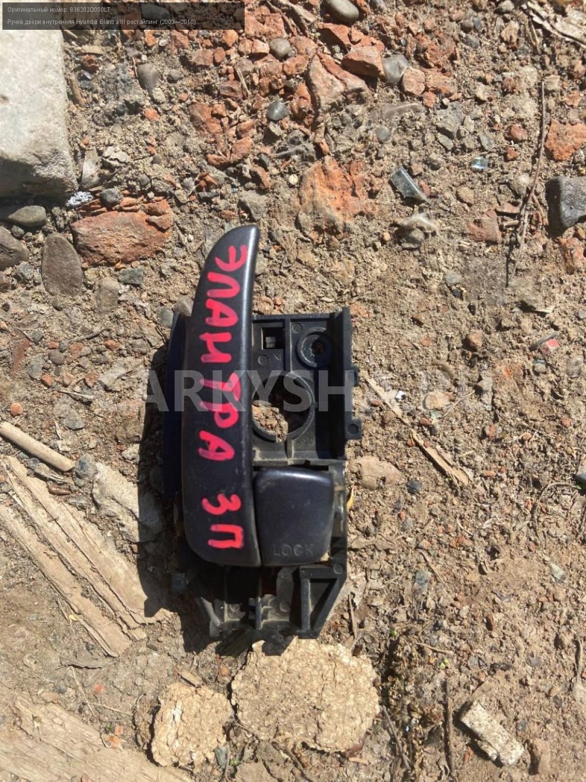 Hyundai Elantra III, ручка задняя правая внутрен.\nАртикул: 5111\n\nОриг. номер: 836202D000LT\nПроизводитель: Hyundai-KIA\nПримечание:Хендай Элантра 3, ручка двери задней правой внутренняя, б/у. \n\nМарка: Hyundai\nМодель: Elantra III рестайлинг (2003—2010)\nГод выпуска: 2005\nКузов тип: Седан\nДвигатель номер: G4ED\nМодель двигателя: турбо\nОбъем: 1.6\nТопливо: Бензин\nКоробка: Автомат\nЦвет: Серебристый\nПраво/Лево: Право\nПеред/Зад: Зад\nСовместимости: Hyundai Elantra III рестайлинг (2003—2010) 1.6 AT (105 л.с.)\nСовместимость: