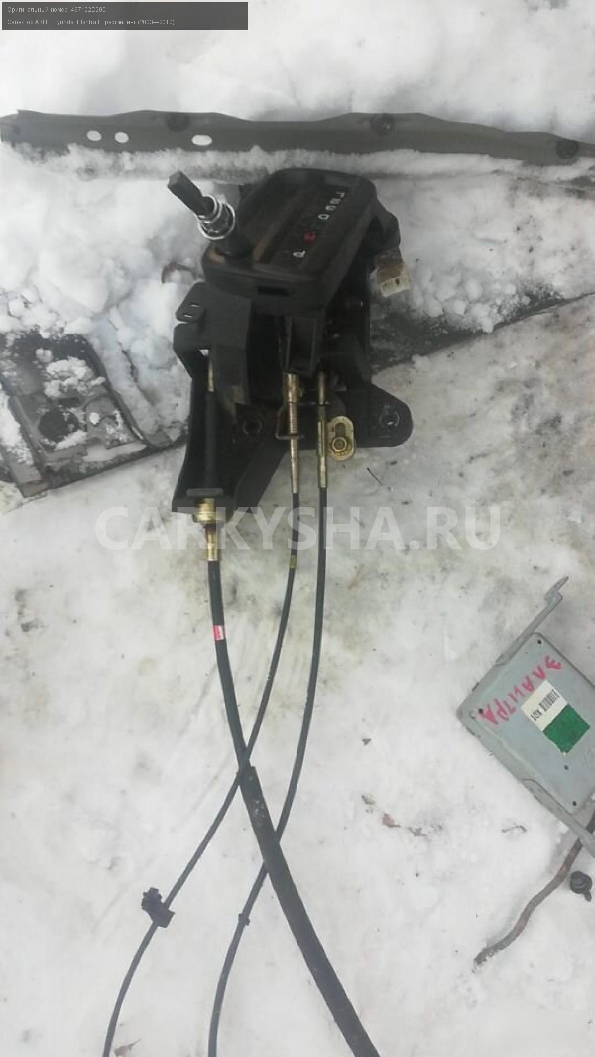 Hyundai elantra xd селектор АКПП\nАртикул: 403\n\nОриг. номер: 467102D200\nПроизводитель: Hyundai-KIA\nПримечание:Hyundai elantra xd селектор акпп в сборе.\n\nМарка: Hyundai\nМодель: Elantra III рестайлинг (2003—2010)\nКузов тип: Седан\nОбъем: 2.0\nТопливо: Бензин\nКоробка: Автомат\nСовместимости: Hyundai Elantra III рестайлинг (2003—2010) 2.0 AT (143 л.с.)\nСовместимость: