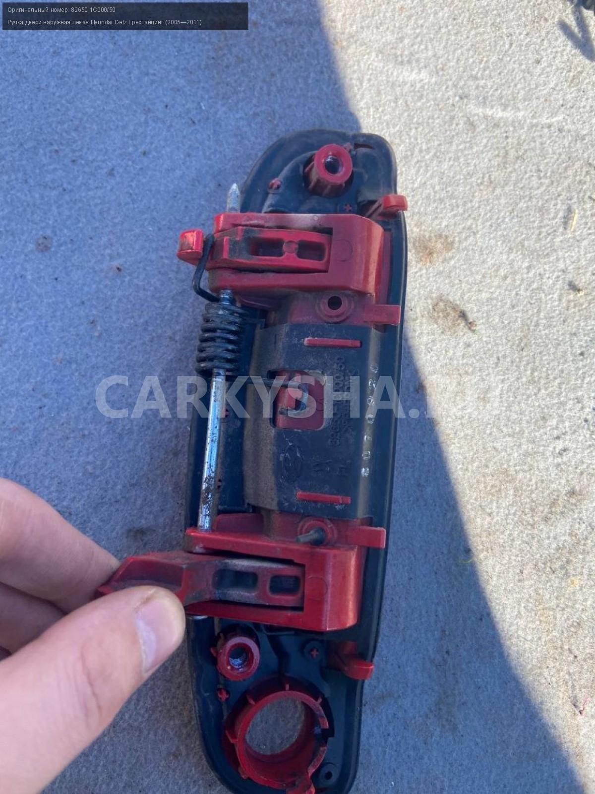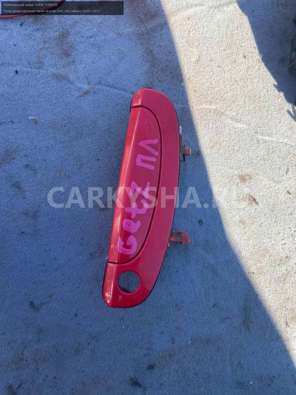 Hyundai Getz, ручка наружная передняя левая.\nАртикул: 4481\n\nОриг. номер: 82650 1С000/50\nПроизводитель: Hyundai-KIA\nПримечание:Хендай Гетц, ручка двери наружная, передняя левая, бу. \n\nМарка: Hyundai\nМодель: Getz I рестайлинг (2005—2011)\nГод выпуска: 2007\nКузов тип: Хетчбэк\nДвигатель номер: G4EE\nМодель двигателя: инжектор\nОбъем: 1.4\nТопливо: Бензин\nКоробка: Механика\nЦвет: Красный\nПраво/Лево: Лево\nПеред/Зад: Перед\nСовместимости: Hyundai Getz I рестайлинг (2005—2011) 1.4 MT (97 л.с.)\nСовместимость: