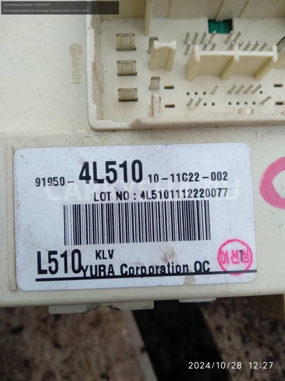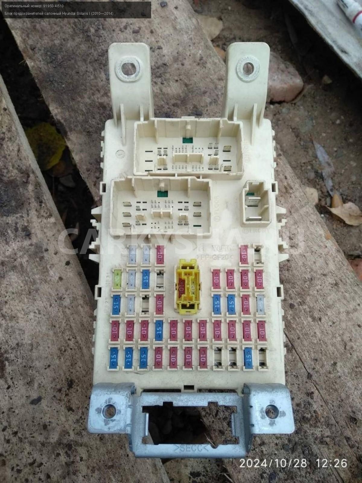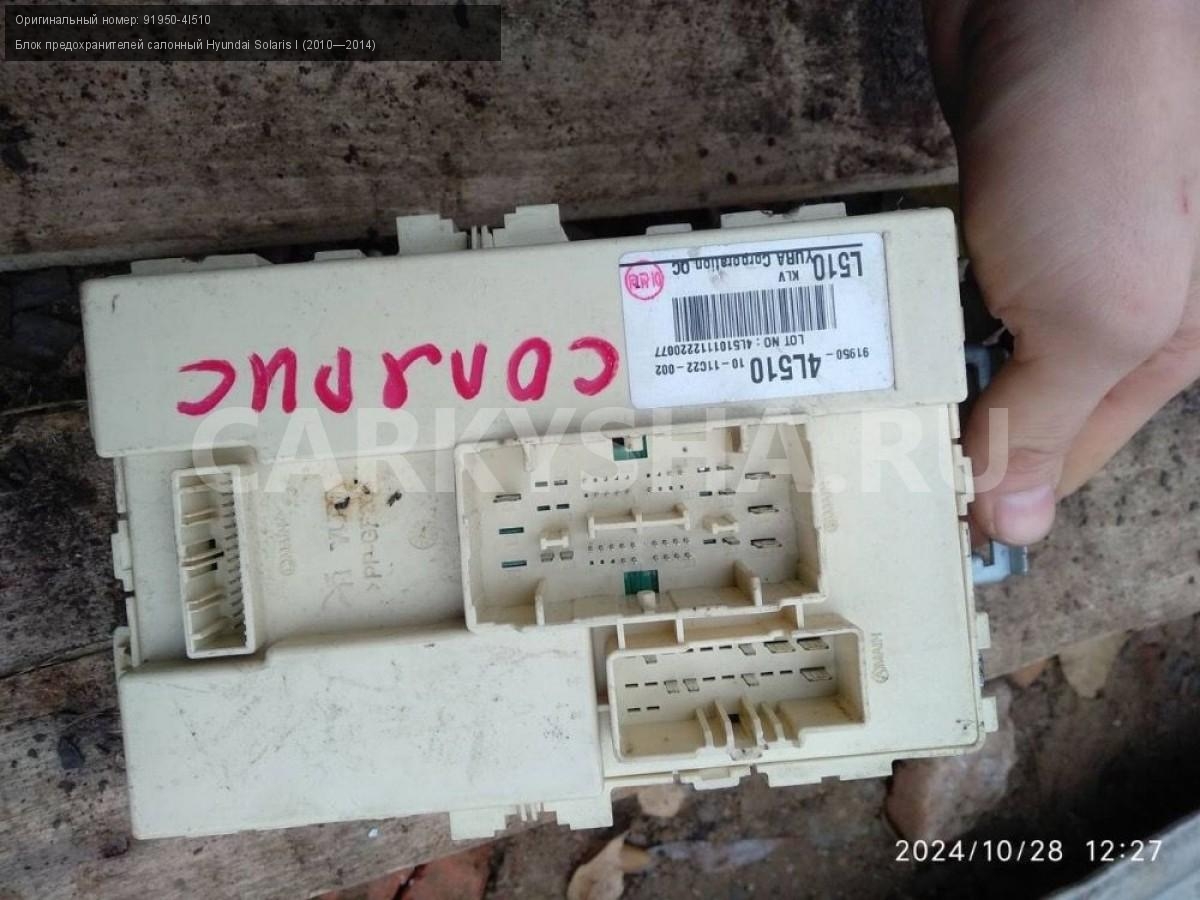 Hyundai Solaris I, блок предохранителей салонный.\nАртикул: 6103\n\nОриг. номер: 91950-4l510\nПроизводитель: Hyundai-KIA\nПримечание:Хендай Солярис 1, блок предохранителей салонный, б/у. \n\nМарка: Hyundai\nМодель: Solaris I (2010—2014)\nГод выпуска: 2012\nКузов тип: Седан\nДвигатель номер: G4FA\nМодель двигателя: инжектор\nОбъем: 1.4\nТопливо: Бензин\nКоробка: Механика\nЦвет: Черный\nСовместимости: Hyundai Solaris I (2010—2014) 1.4 MT (107 л.с.)\nСовместимость: