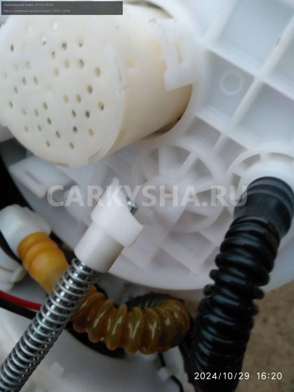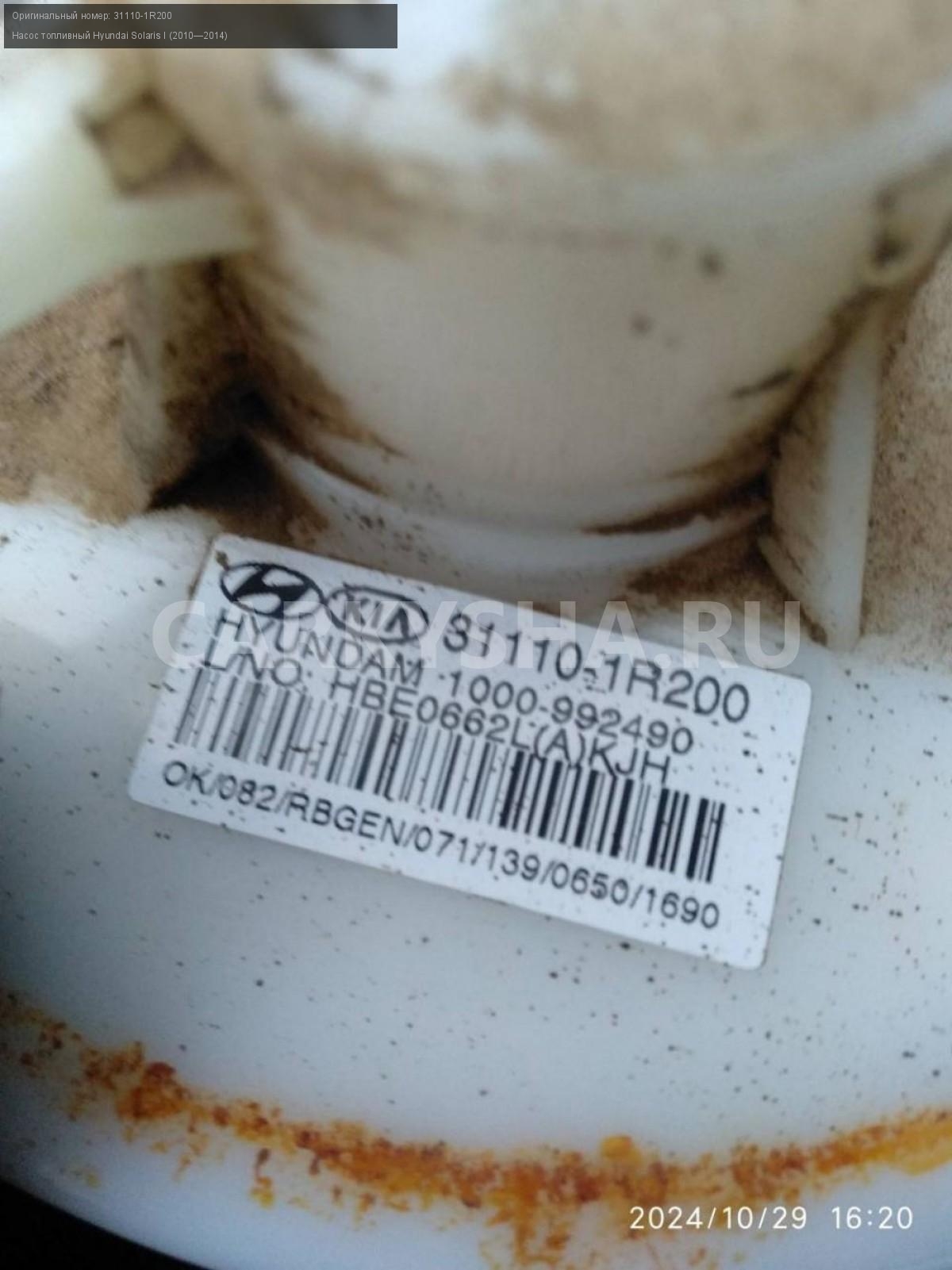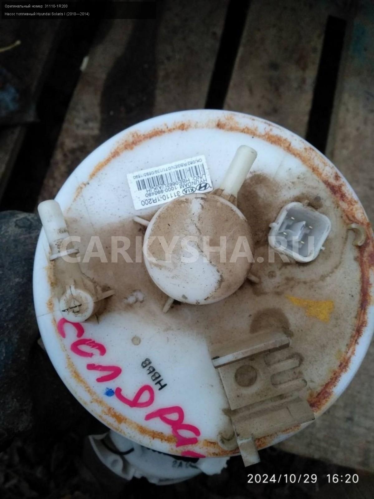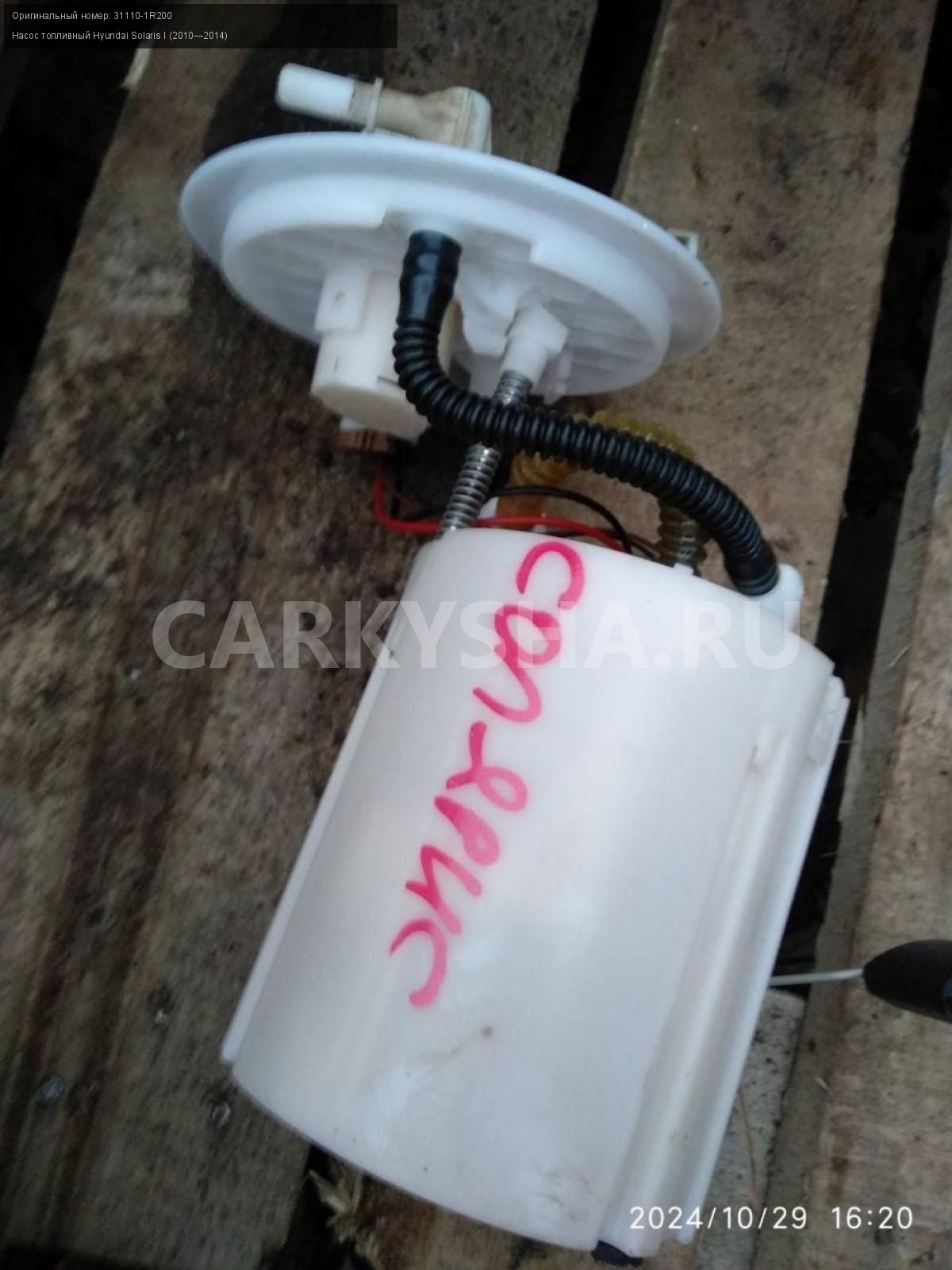 Hyundai Solaris I , насос топливный.\nАртикул: 6143\n\nОриг. номер: 31110-1R200\nПроизводитель: Hyundai-KIA\nПримечание:Хендай Солярис 1, насос топливный с дефектом, б/у. \n\nМарка: Hyundai\nМодель: Solaris I (2010—2014)\nГод выпуска: 2012\nКузов тип: Седан\nДвигатель номер: G4FA\nМодель двигателя: инжектор\nОбъем: 1.4\nТопливо: Бензин\nКоробка: Механика\nЦвет: Черный\nСовместимости: Hyundai Solaris I (2010—2014) 1.4 MT (107 л.с.)\nСовместимость: