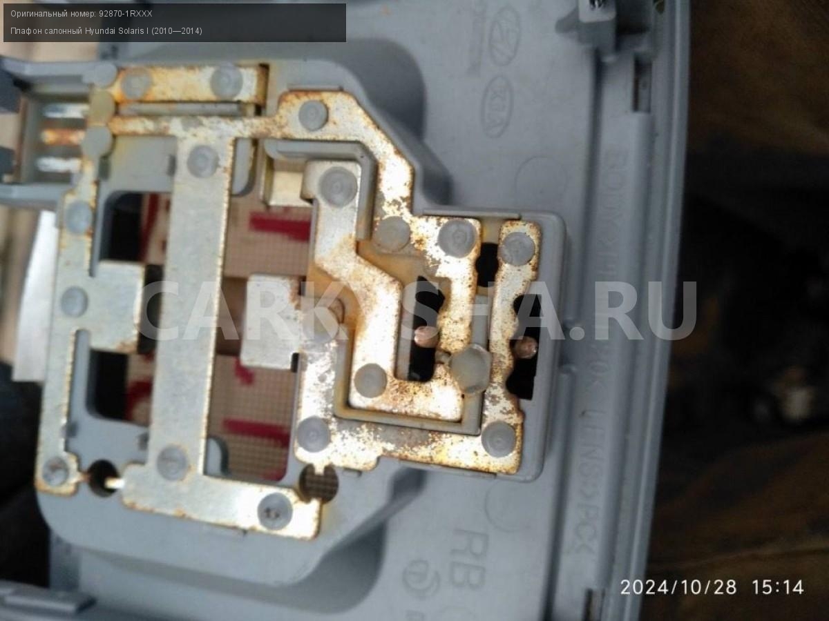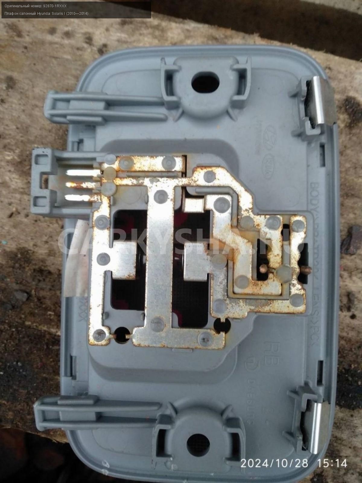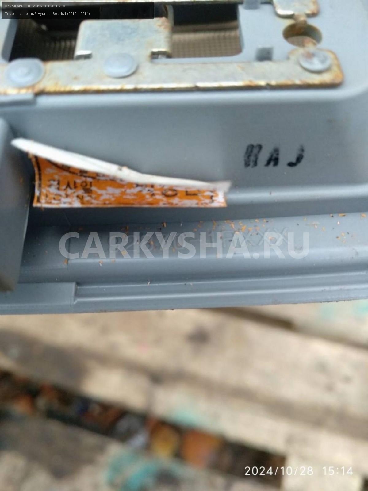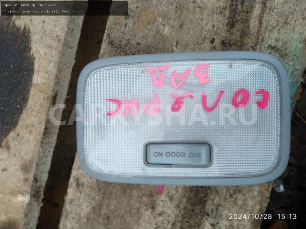 Hyundai Solaris I, плафон салонный задний.\nАртикул: 6116\n\nОриг. номер: 92870-1RXXX\nПроизводитель: Hyundai-KIA\nПримечание:Хендай Солярис 1, плафон освещения салонный задний, б/у. \n\nМарка: Hyundai\nМодель: Solaris I (2010—2014)\nГод выпуска: 2012\nКузов тип: Седан\nДвигатель номер: G4FA\nМодель двигателя: инжектор\nОбъем: 1.4\nТопливо: Бензин\nКоробка: Механика\nЦвет: Черный\nСовместимости: Hyundai Solaris I (2010—2014) 1.4 MT (107 л.с.)\nСовместимость: