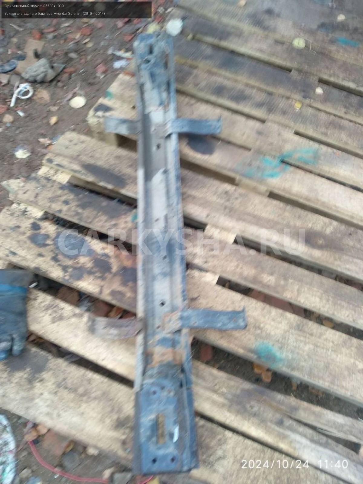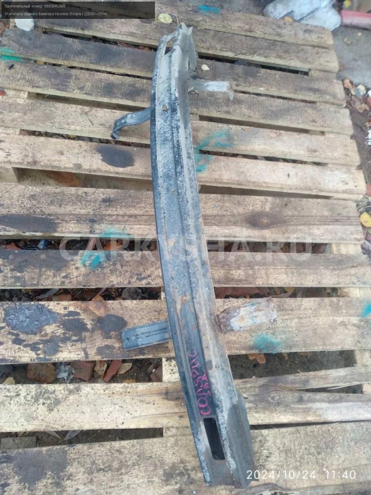Hyundai Solaris I седан, усилитель заднего бампера\nАртикул: 6066\n\nОриг. номер: 866304L000\nПроизводитель: Hyundai-KIA\nПримечание:Хендай Солярис 1 седан, усилитель заднего бампера, бу. \n\nМарка: Hyundai\nМодель: Solaris I (2010—2014)\nГод выпуска: 2012\nКузов тип: Седан\nДвигатель номер: G4FA\nМодель двигателя: инжектор\nОбъем: 1.4\nТопливо: Бензин\nКоробка: Механика\nЦвет: Черный\nПеред/Зад: Зад\nСовместимости: Hyundai Solaris I (2010—2014) 1.4 MT (107 л.с.)\nСовместимость: