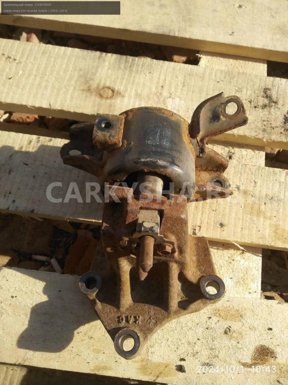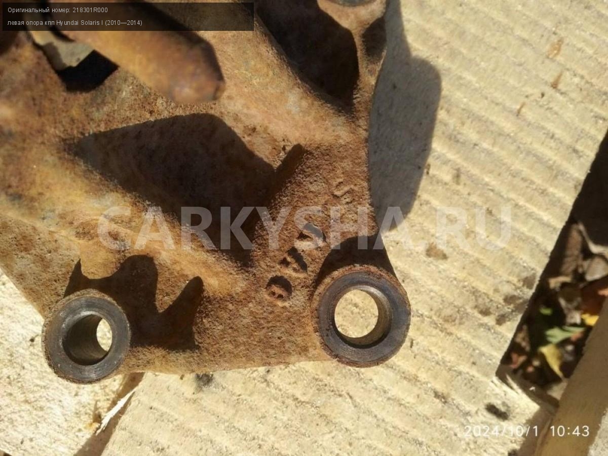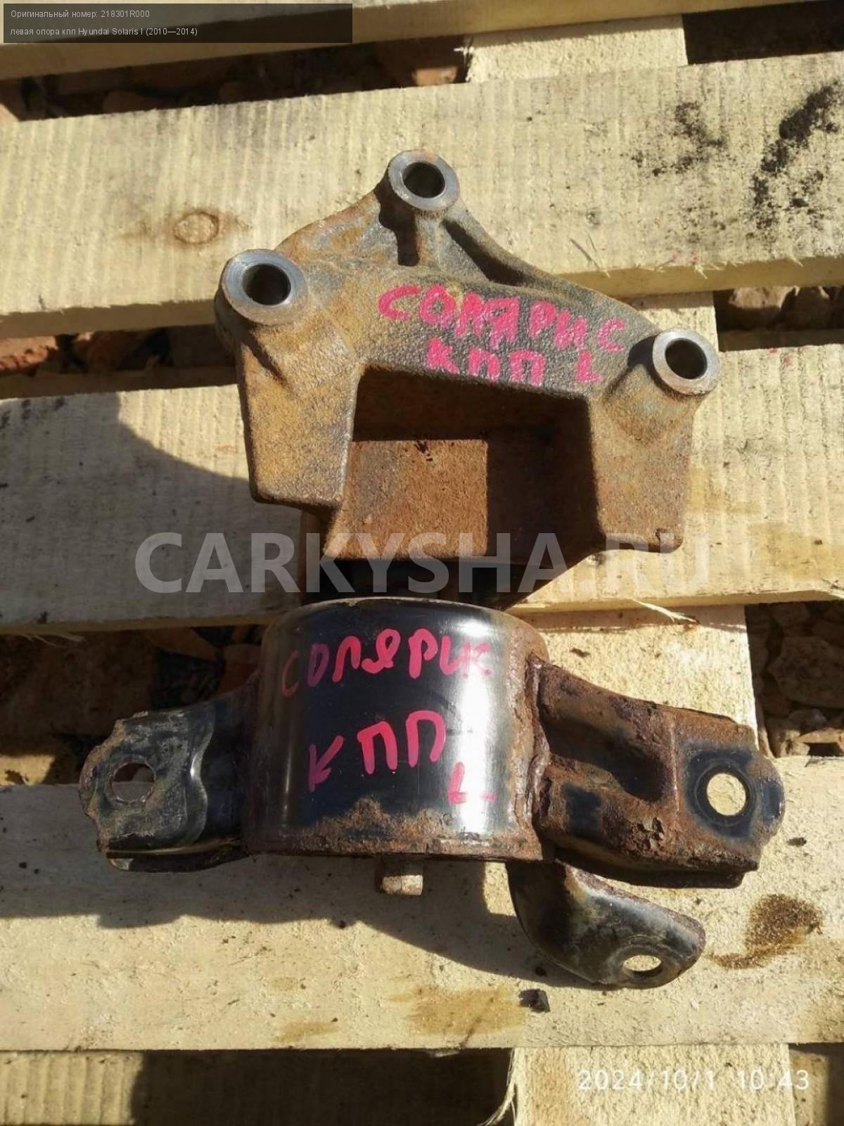 Hyundai Solaris I, опора кпп левая.\nАртикул: 5842\n\nОриг. номер: 218301R000\nПроизводитель: Hyundai-KIA\nПримечание:Хендай Солярис 1, опора кпп левая, б/у. \n\nМарка: Hyundai\nМодель: Solaris I (2010—2014)\nГод выпуска: 2012\nКузов тип: Седан\nДвигатель номер: G4FA\nМодель двигателя: инжектор\nОбъем: 1.4\nТопливо: Бензин\nКоробка: Механика\nЦвет: Черный\nПраво/Лево: Лево\nСовместимости: Hyundai Solaris I (2010—2014) 1.4 MT (107 л.с.)\nСовместимость: