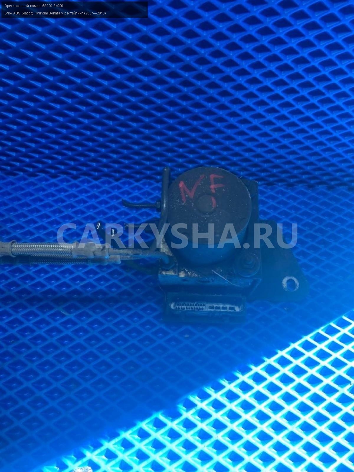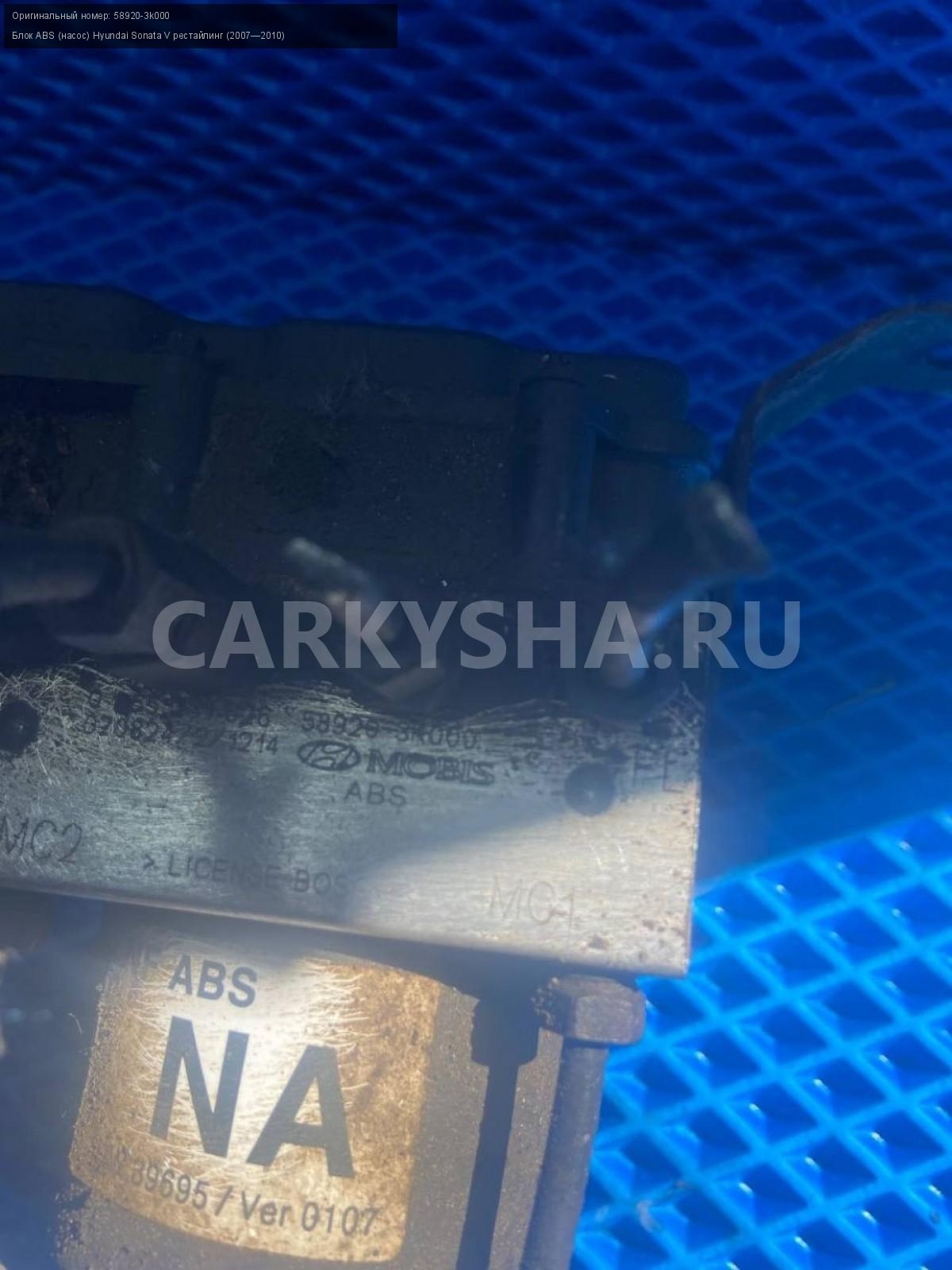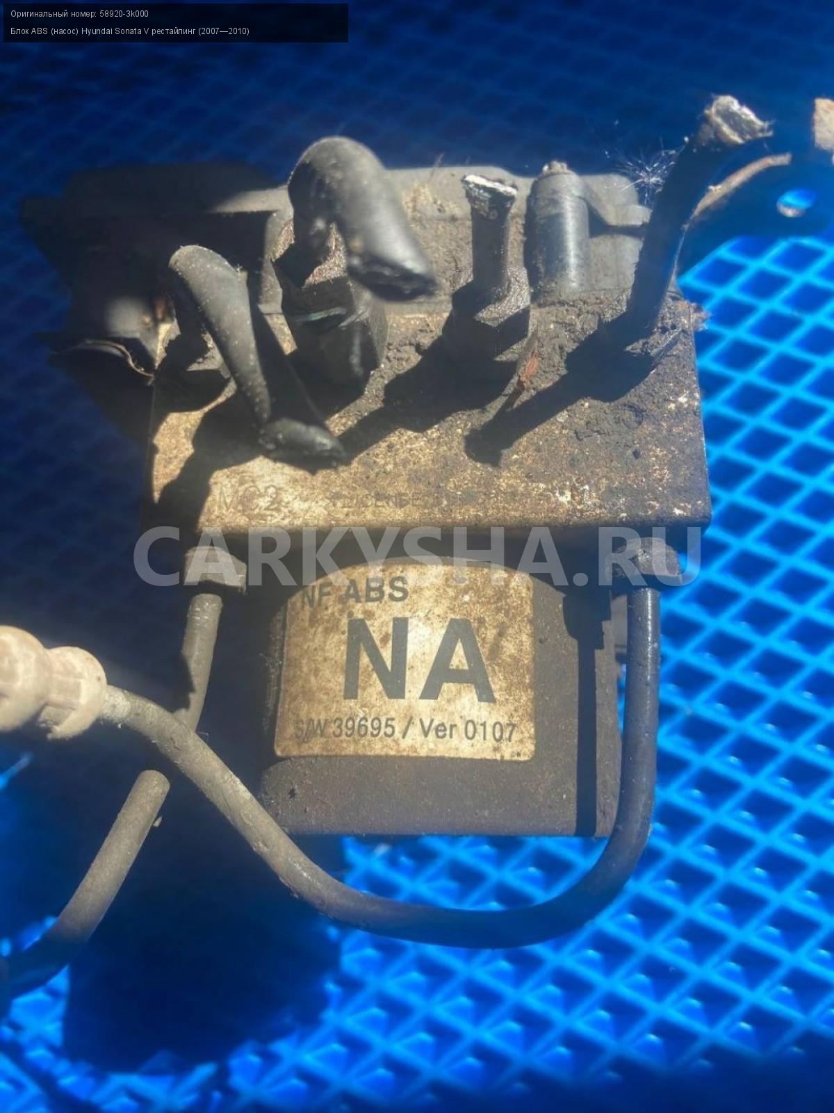 Hyundai Sonata NF G4KA блок ABS.\nАртикул: 7725\n\nОриг. номер: 58920-3k000\nПроизводитель: Hyundai-KIA\nПримечание:Хендай Соната NF, G4KA, блок АБС, б/у. \n\nМарка: Hyundai\nМодель: Sonata V рестайлинг (2007—2010)\nГод выпуска: 2006\nКузов номер: NF\nКузов тип: Седан\nДвигатель номер: G4KA\nМодель двигателя: инжектор\nОбъем: 2.0\nТопливо: Бензин\nКоробка: Механика\nЦвет: Бордовый\nСовместимости: Hyundai Sonata V рестайлинг (2007—2010) 2.0 MT (152 л.с.)\nСовместимость: