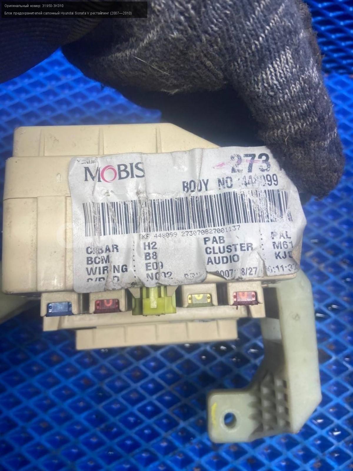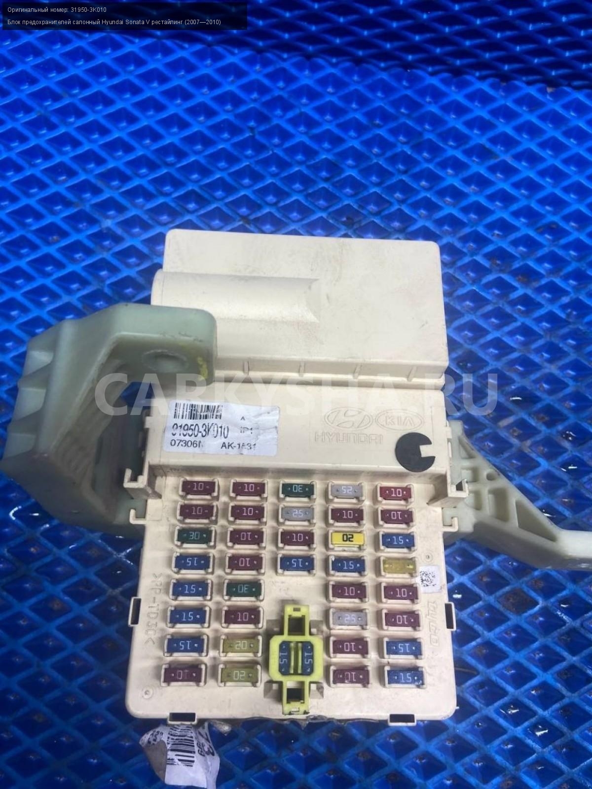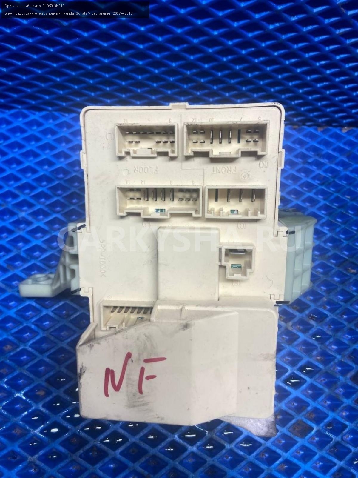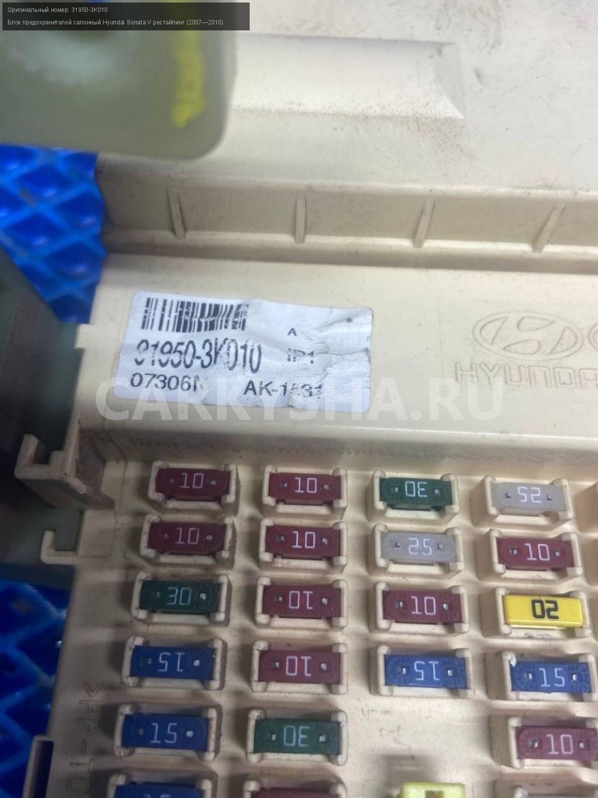 Hyundai Sonata NF, блок предохранителей в салоне.\nАртикул: 7716\n\nОриг. номер: 31950-3K010\nПроизводитель: Hyundai-KIA\nПримечание:Хендай Соната NF, блок предохранителей в салоне, б/у. \n\nМарка: Hyundai\nМодель: Sonata V рестайлинг (2007—2010)\nГод выпуска: 2006\nКузов номер: NF\nКузов тип: Седан\nДвигатель номер: G4KA\nМодель двигателя: инжектор\nОбъем: 2.0\nТопливо: Бензин\nКоробка: Механика\nЦвет: Бордовый\nСовместимости: Hyundai Sonata V рестайлинг (2007—2010) 2.0 MT (152 л.с.)\nСовместимость: