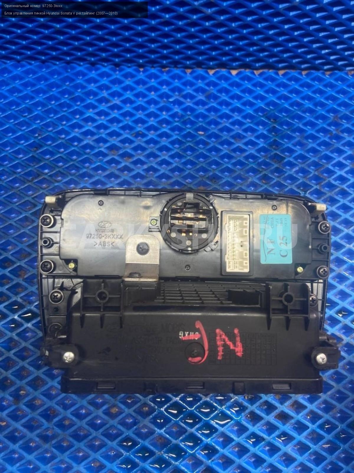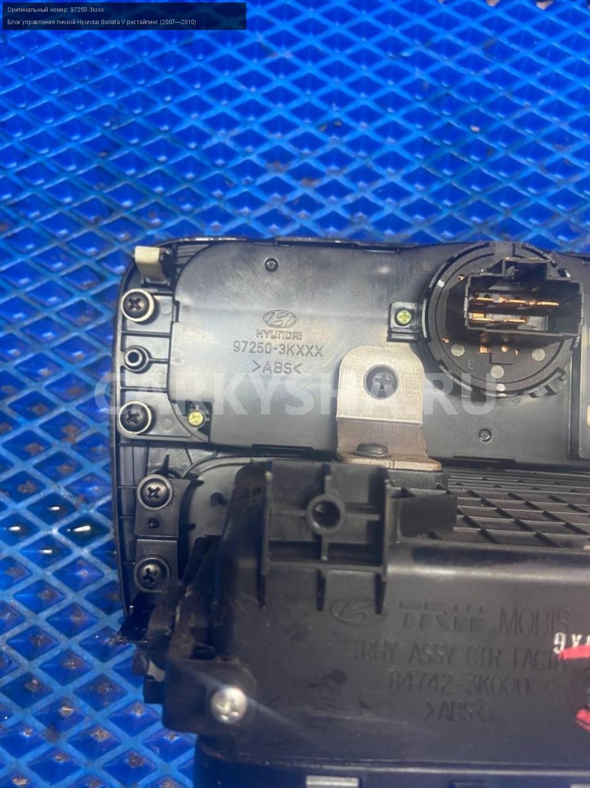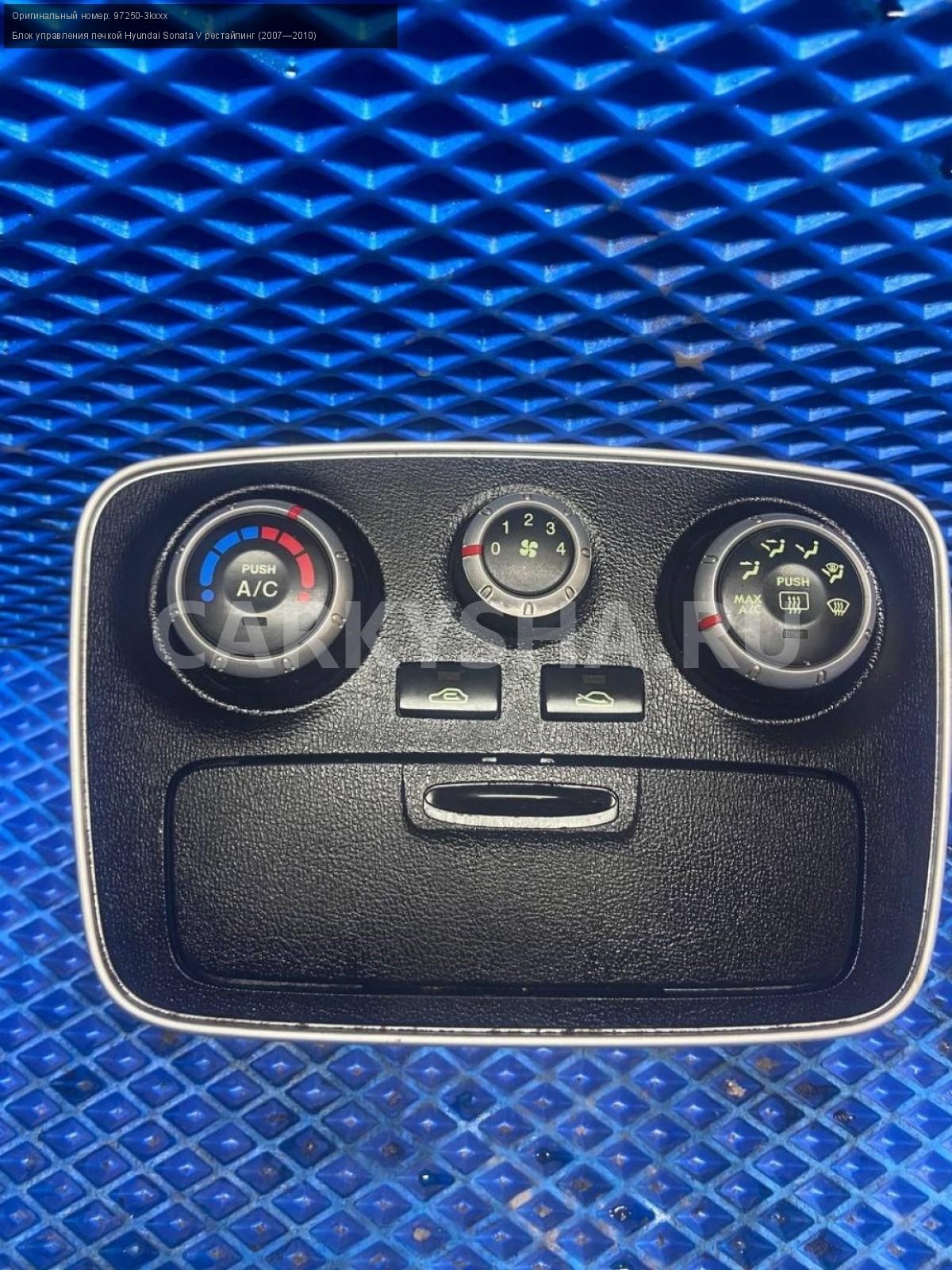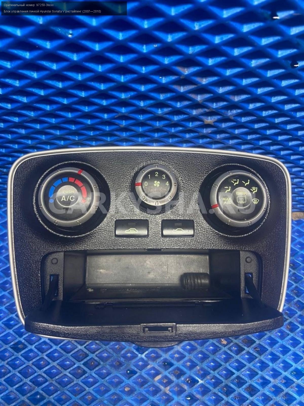 Hyundai Sonata NF, блок управления печкой.\nАртикул: 7718\n\nОриг. номер: 97250-3kxxx\nПроизводитель: Hyundai-KIA\nПримечание:Хендай Соната NF, блок управления печкой, б/у. \n\nМарка: Hyundai\nМодель: Sonata V рестайлинг (2007—2010)\nГод выпуска: 2006\nКузов номер: NF\nКузов тип: Седан\nДвигатель номер: G4KA\nМодель двигателя: инжектор\nОбъем: 2.0\nТопливо: Бензин\nКоробка: Механика\nЦвет: Бордовый\nСовместимости: Hyundai Sonata V рестайлинг (2007—2010) 2.0 MT (152 л.с.)\nСовместимость: