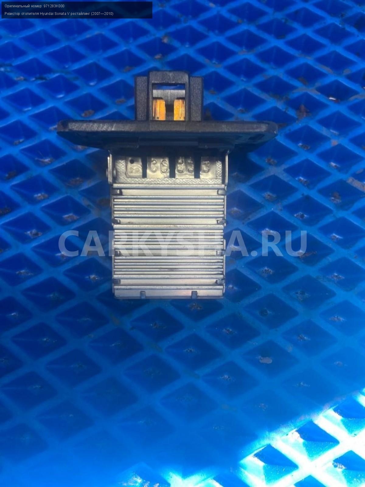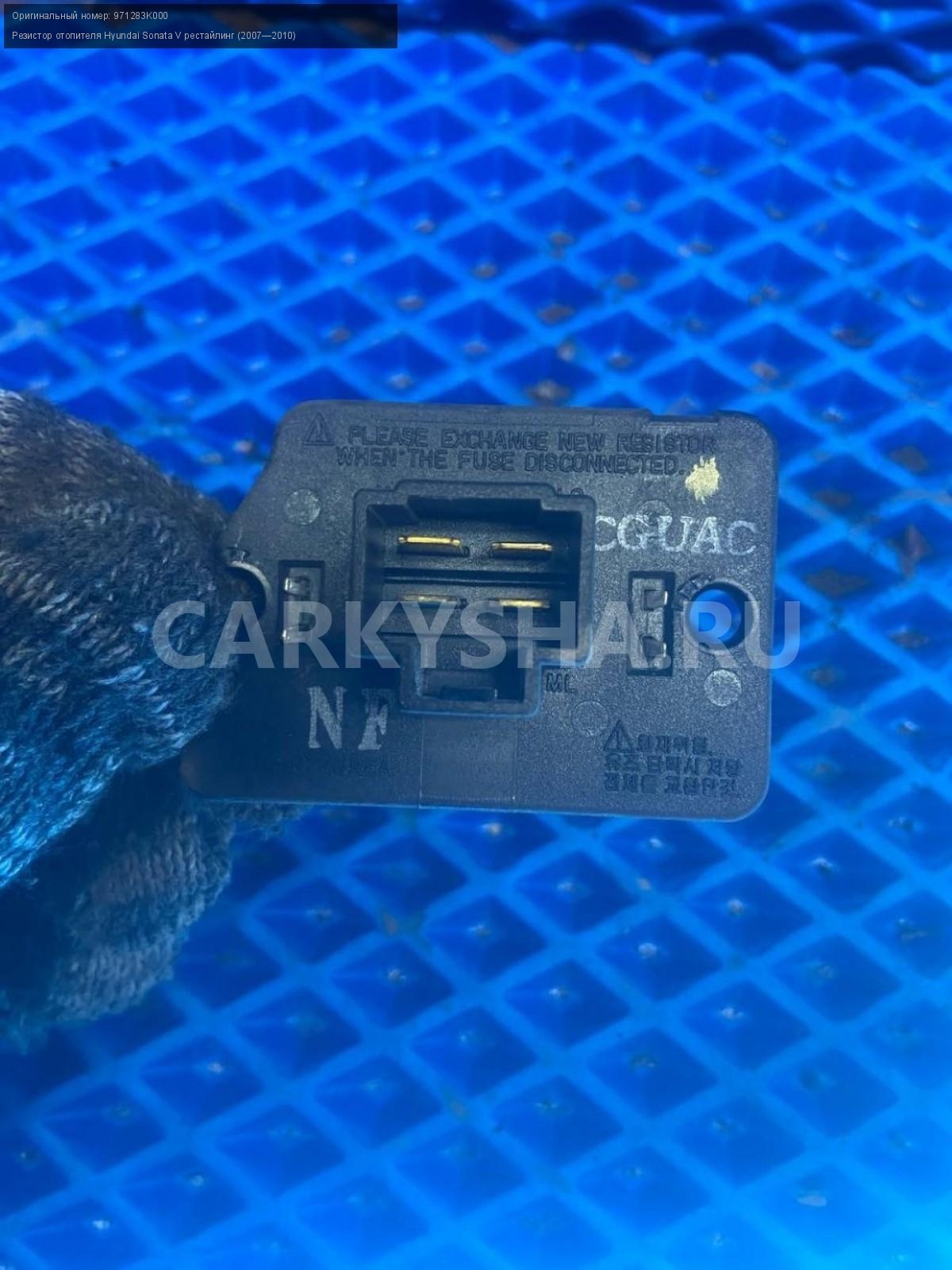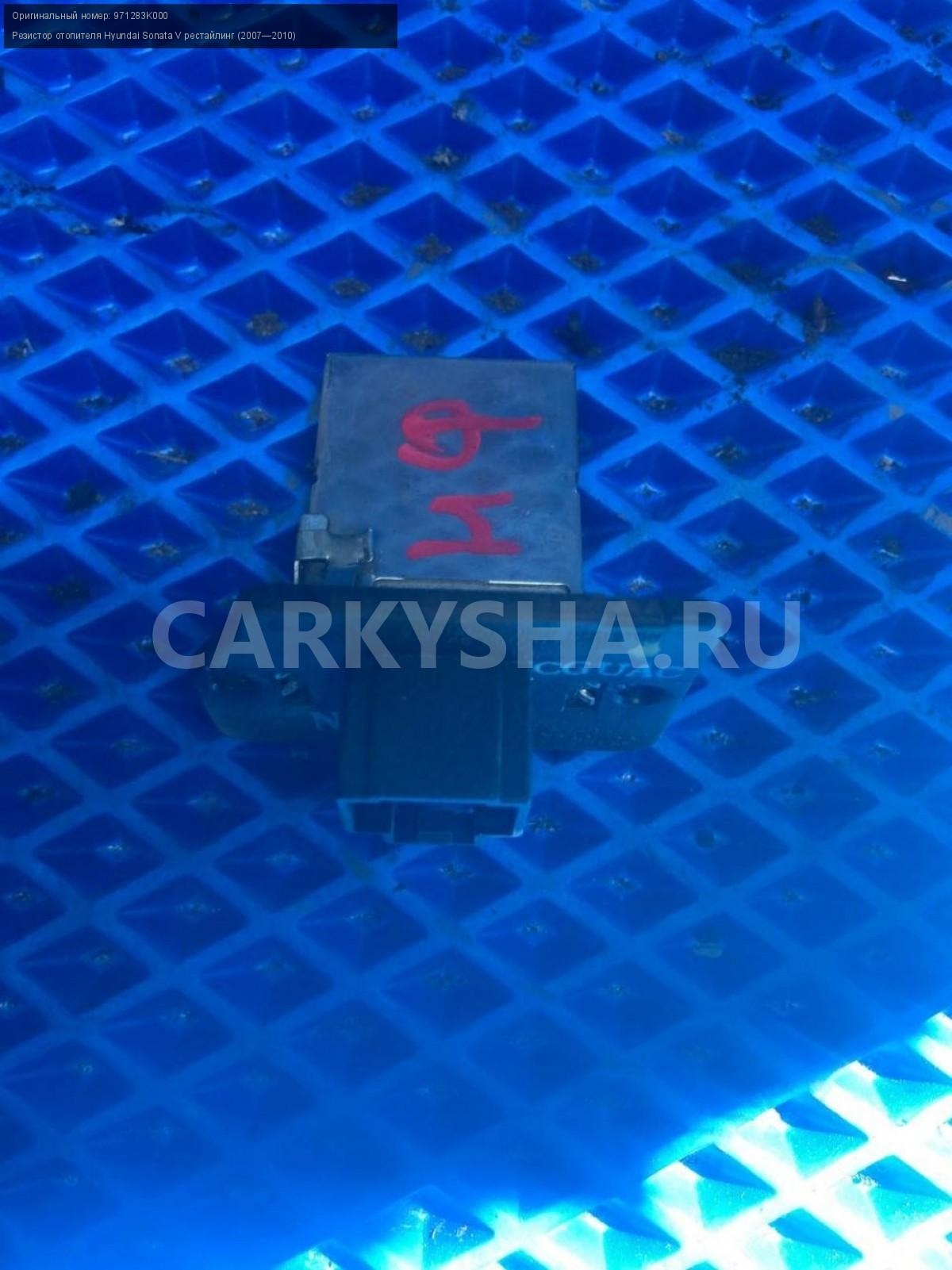 Hyundai Sonata NF, резистор печки.\nАртикул: 7820\n\nОриг. номер: 971283K000\nПроизводитель: Hyundai-KIA\nПримечание:Хендай Соната NF, резистор печки, отопителя, б/у. \n\nМарка: Hyundai\nМодель: Sonata V рестайлинг (2007—2010)\nГод выпуска: 2006\nКузов номер: NF\nКузов тип: Седан\nДвигатель номер: G4KA\nМодель двигателя: инжектор\nОбъем: 2.0\nТопливо: Бензин\nКоробка: Механика\nЦвет: Бордовый\nСовместимости: Hyundai Sonata V рестайлинг (2007—2010) 2.0 MT (152 л.с.)\nСовместимость:
