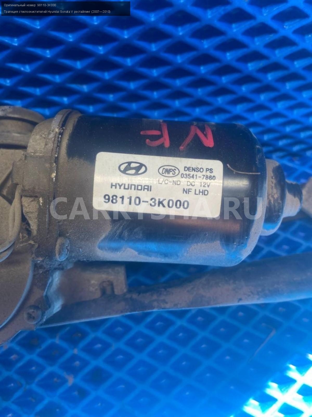 Hyundai Sonata NF, трапеция дворников с моторчиком\nАртикул: 7723\n\nОриг. номер: 98110-3K000\nПроизводитель: Hyundai-KIA\nПримечание:Хендай Соната NF, трапеция дворников с моторчиком, б/у. \n\nМарка: Hyundai\nМодель: Sonata V рестайлинг (2007—2010)\nГод выпуска: 2006\nКузов номер: NF\nКузов тип: Седан\nДвигатель номер: G4KA\nМодель двигателя: инжектор\nОбъем: 2.0\nТопливо: Бензин\nКоробка: Механика\nЦвет: Бордовый\nСовместимости: Hyundai Sonata V рестайлинг (2007—2010) 2.0 MT (152 л.с.)\nСовместимость:
