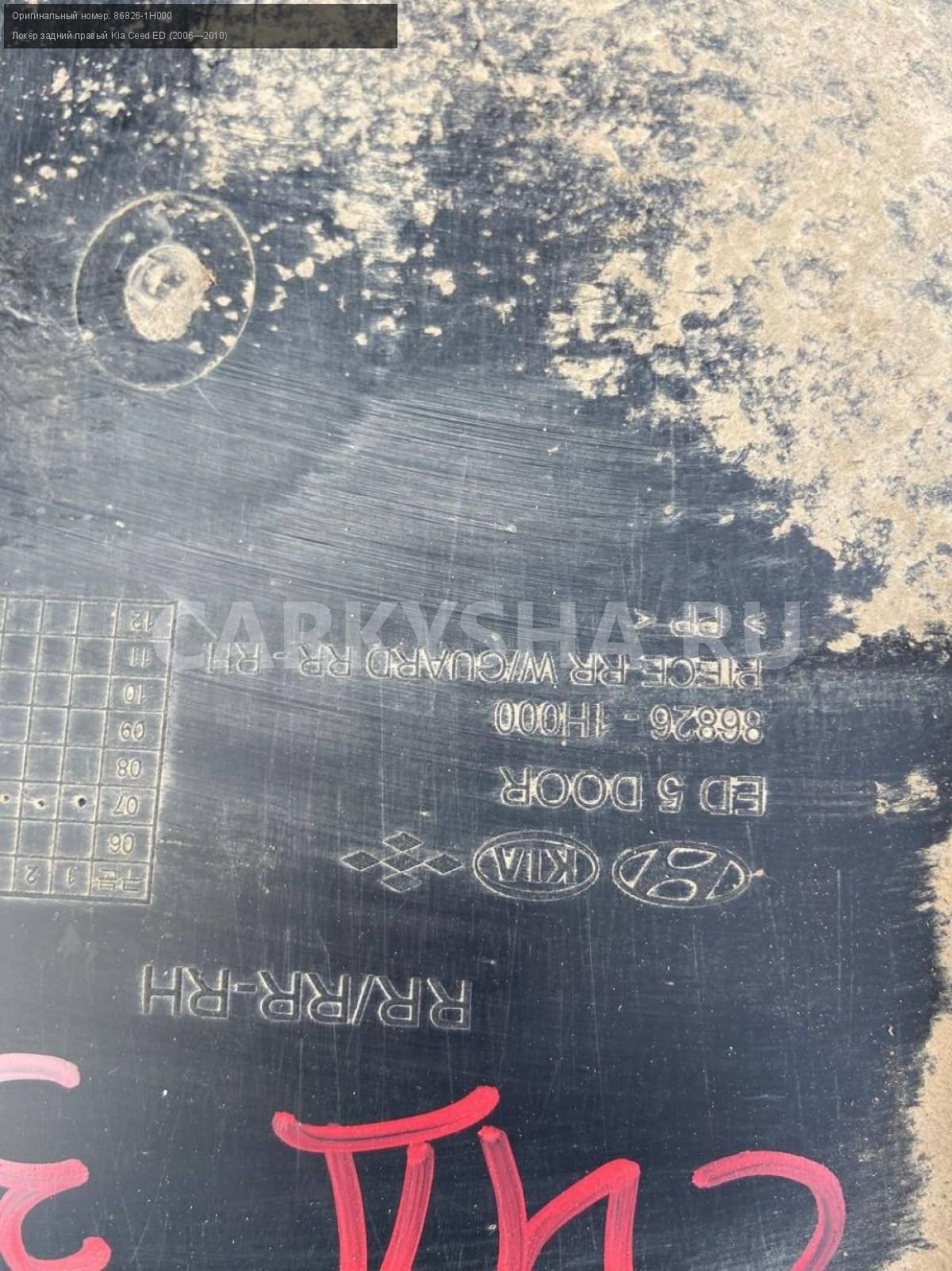 Kia Ceed ED, локер, подкрылок задний правый.\nАртикул: 6847\n\nОриг. номер: 86826-1H000\nПроизводитель: Hyundai-KIA\nПримечание:Киа Сид 1 ED, локер , подкрылок задний правый, б/у. \n\nМарка: Kia\nМодель: Ceed ED (2006—2010)\nГод выпуска: 2007\nКузов тип: Хетчбэк\nДвигатель номер: G4FC\nМодель двигателя: инжектор\nОбъем: 1.6\nТопливо: Бензин\nКоробка: Автомат\nЦвет: Черный\nПраво/Лево: Право\nПеред/Зад: Зад\nСовместимости: Kia Ceed ED (2006—2010) 1.6 AT (122 л.с.)\nСовместимость: