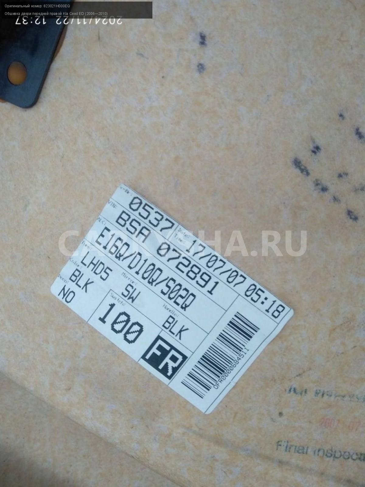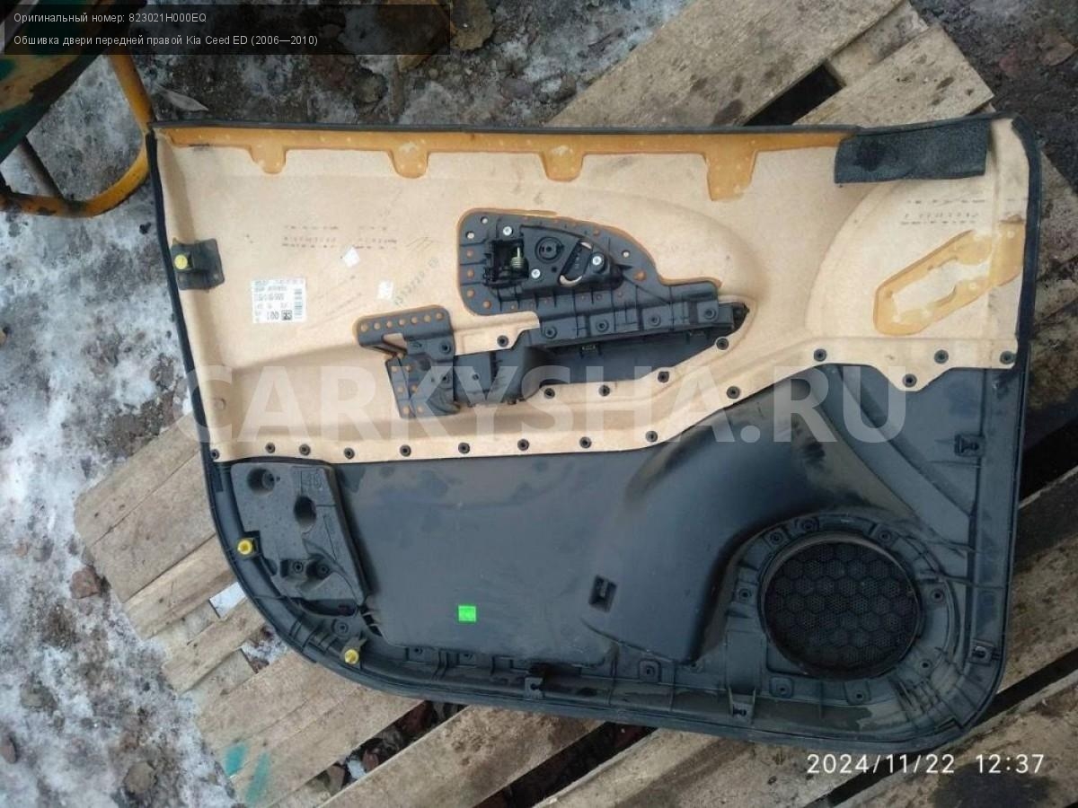 Kia Ceed ED, обшивка двери передней правой.\nАртикул: 6417\n\nОриг. номер: 823021H000EQ\nПроизводитель: Hyundai-KIA\nПримечание:Киа Сид 1 ED, обшивка двери передней правой, б/у. \n\nМарка: Kia\nМодель: Ceed ED (2006—2010)\nГод выпуска: 2007\nКузов тип: Хетчбэк\nДвигатель номер: G4FC\nМодель двигателя: инжектор\nОбъем: 1.6\nТопливо: Бензин\nКоробка: Автомат\nЦвет: Черный\nПраво/Лево: Право\nПеред/Зад: Перед\nСовместимости: Kia Ceed ED (2006—2010) 1.6 AT (122 л.с.)\nСовместимость: