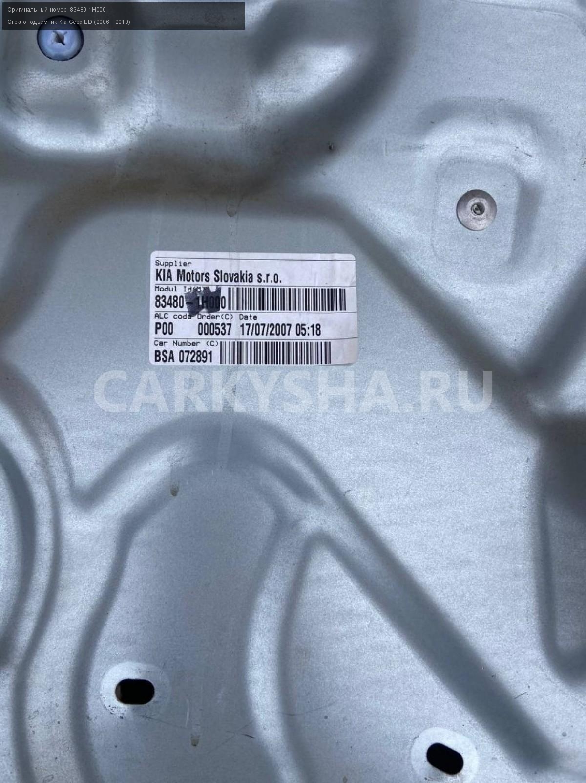 Kia Ceed ED хэтчбек, стеклоподъемник задний правый\nАртикул: 6823\n\nОриг. номер: 83480-1H000\nПроизводитель: Hyundai-KIA\nПримечание:Киа Сид 1 ED, хэтчбек, стеклоподъемник задний правый, б/у. \n\nМарка: Kia\nМодель: Ceed ED (2006—2010)\nГод выпуска: 2007\nКузов тип: Хетчбэк\nДвигатель номер: G4FC\nМодель двигателя: инжектор\nОбъем: 1.6\nТопливо: Бензин\nКоробка: Автомат\nЦвет: Черный\nПраво/Лево: Право\nПеред/Зад: Зад\nСовместимости: Kia Ceed ED (2006—2010) 1.6 AT (122 л.с.)\nСовместимость: