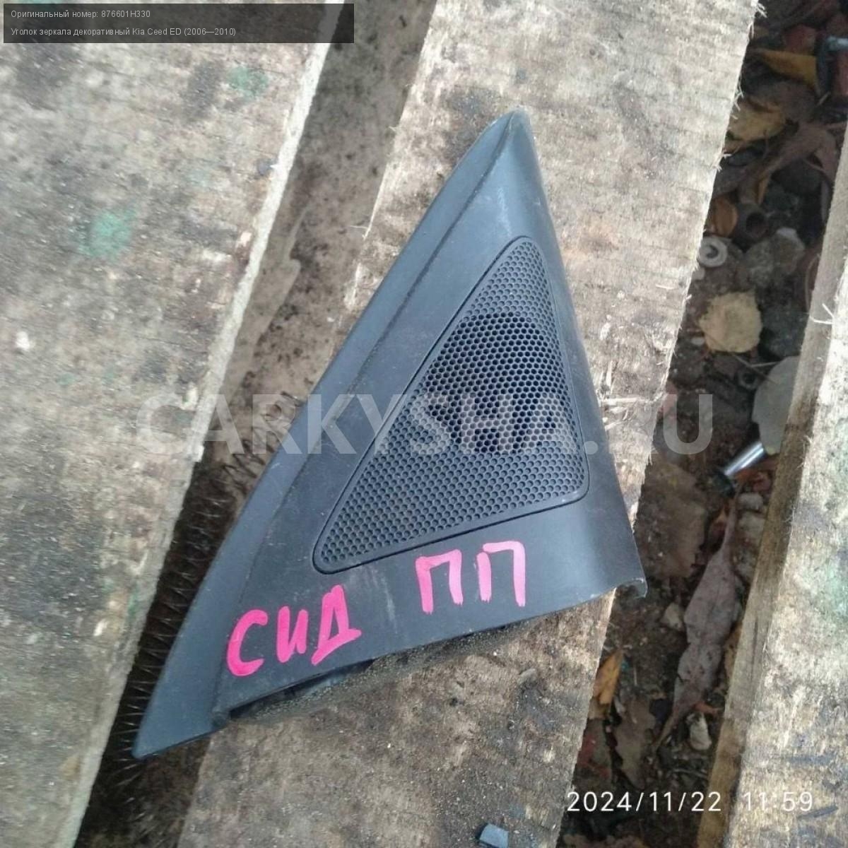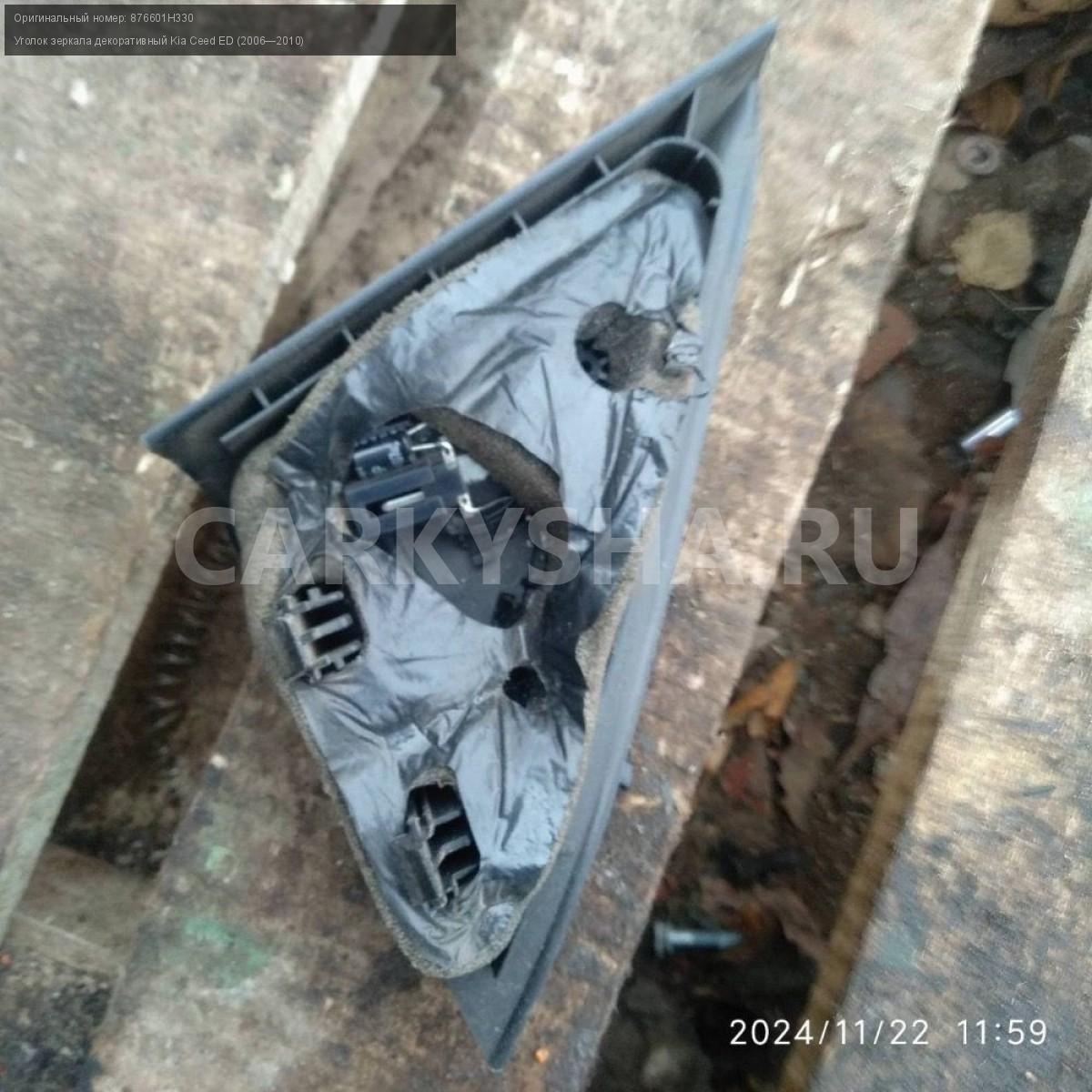 Kia Ceed ED, уголок зеркала правый.\nАртикул: 6434\n\nОриг. номер: 876601H330\nПроизводитель: Hyundai-KIA\nПримечание:Киа Сид 1 ED, уголок зеркала правый, б/у. \n\nМарка: Kia\nМодель: Ceed ED (2006—2010)\nГод выпуска: 2007\nКузов тип: Хетчбэк\nДвигатель номер: G4FC\nМодель двигателя: инжектор\nОбъем: 1.6\nТопливо: Бензин\nКоробка: Автомат\nЦвет: Черный\nПраво/Лево: Право\nСовместимости: Kia Ceed ED (2006—2010) 1.6 AT (122 л.с.)\nСовместимость: