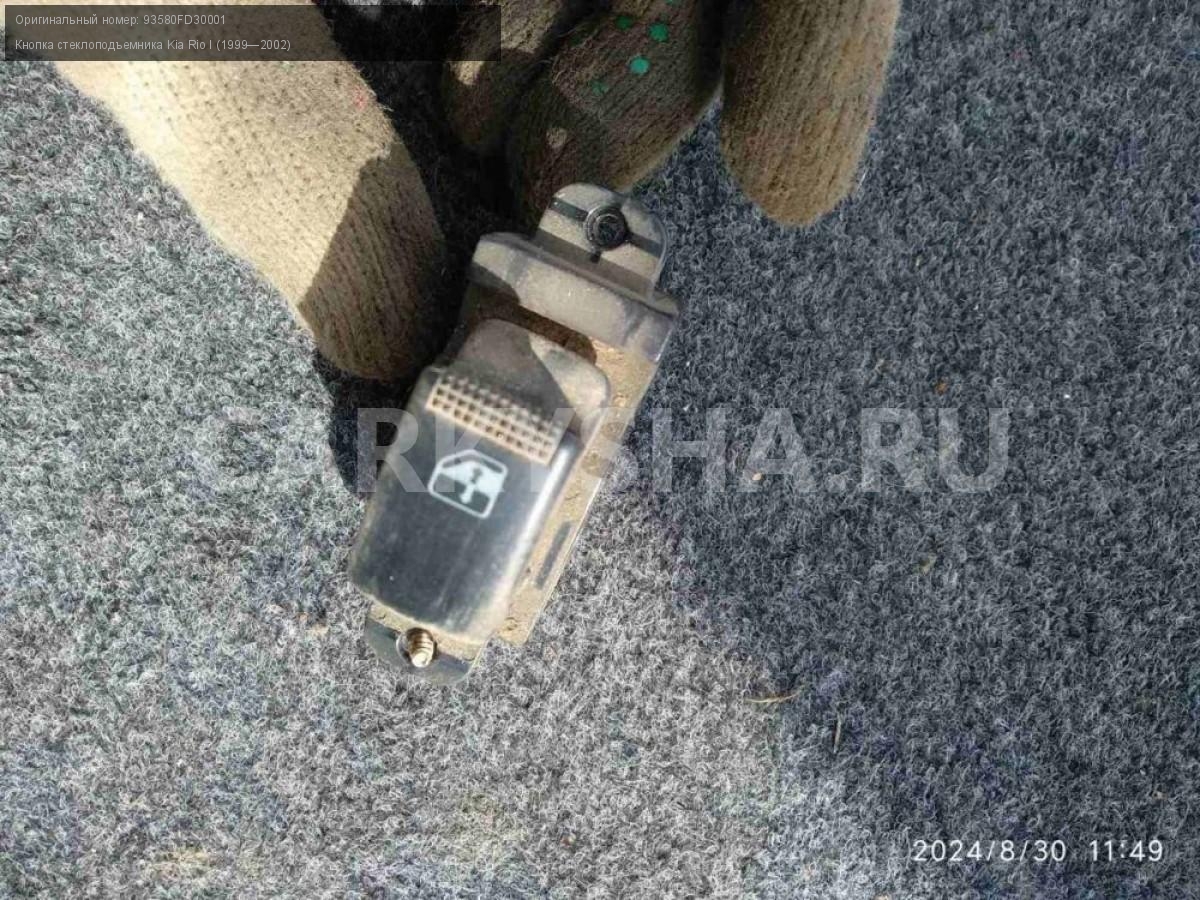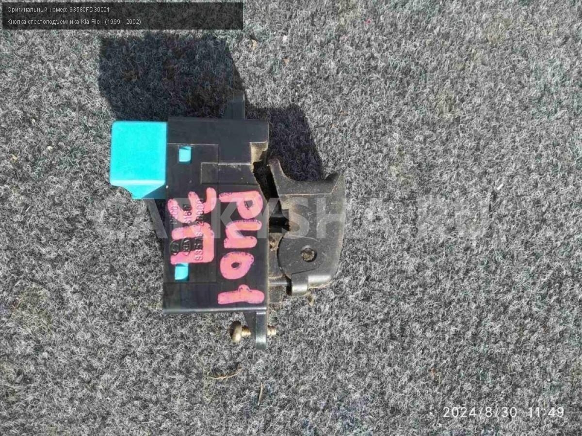 Kia Rio I, кнопка стеклоподъемника задней правой.\nАртикул: 5599\n\nОриг. номер: 93580FD30001\nПроизводитель: Hyundai-KIA\nПримечание:Киа Рио 1, кнопка стеклоподъемника задней правой двери, б/у. \n\nМарка: Kia\nМодель: Rio I (1999—2002)\nПраво/Лево: Право\nПеред/Зад: Зад\nСовместимости: Kia Rio I (1999—2002)\nСовместимость: