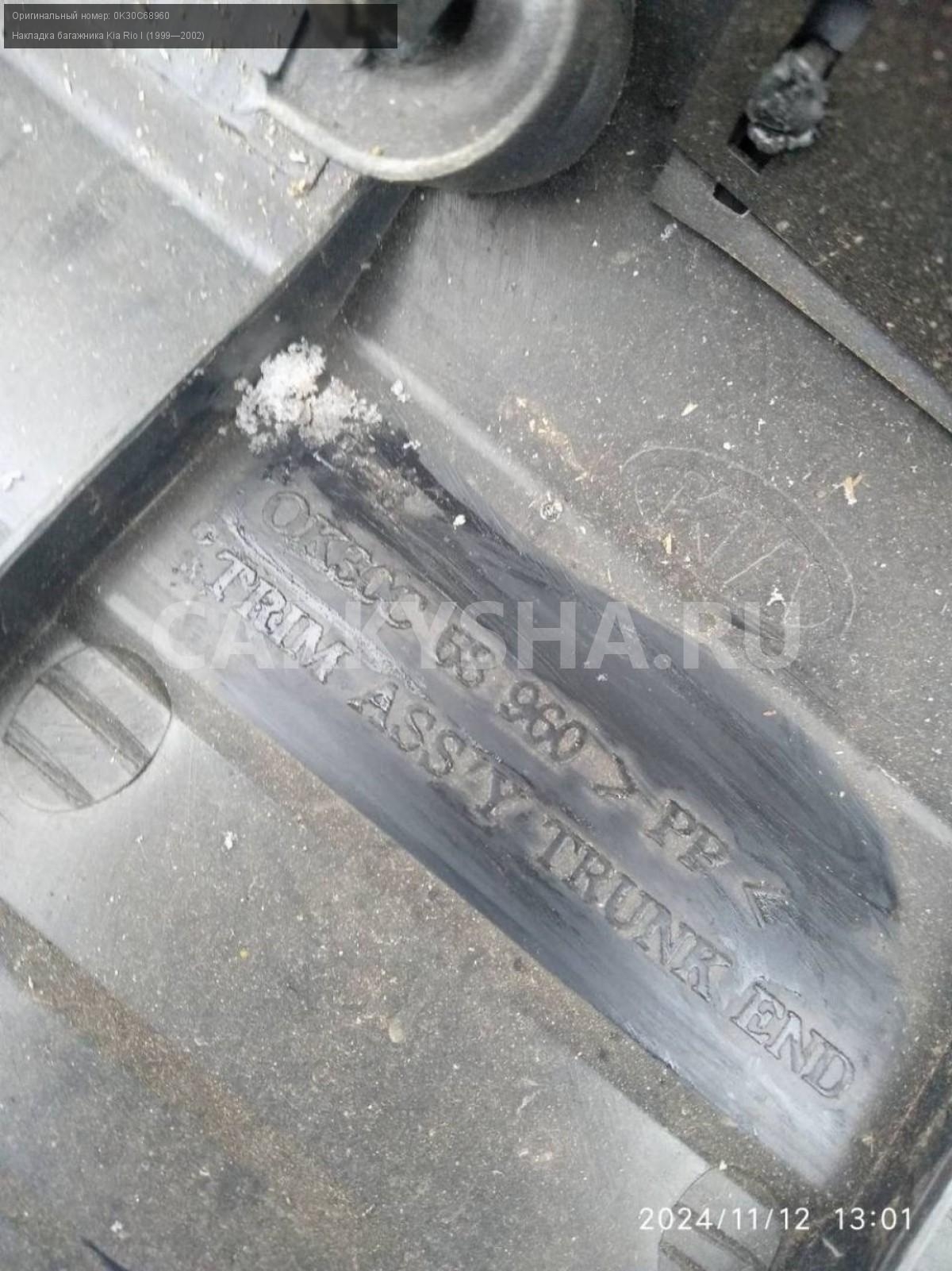 Kia Rio I седан, замковая панель.\nАртикул: 6298\n\nОриг. номер: 0K30C68960\nПроизводитель: Hyundai-KIA\nПримечание:Киа Рио 1 седан, замковая панель (накладка замка багажника) , б/у. \n\nМарка: Kia\nМодель: Rio I (1999—2002)\nСовместимости: Kia Rio I (1999—2002)\nСовместимость: