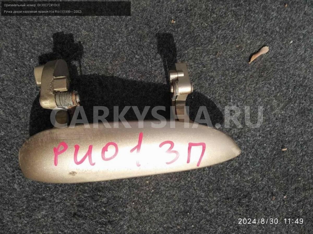 Kia Rio I, наружная ручка задняя правая.\nАртикул: 5603\n\nОриг. номер: 0K30C72410XX\nПроизводитель: Hyundai-KIA\nПримечание:Киа Рио 1, наружная ручка двери задней правой двери, б/у. \n\nМарка: Kia\nМодель: Rio I (1999—2002)\nПраво/Лево: Право\nПеред/Зад: Зад\nСовместимости: Kia Rio I (1999—2002)\nСовместимость:
