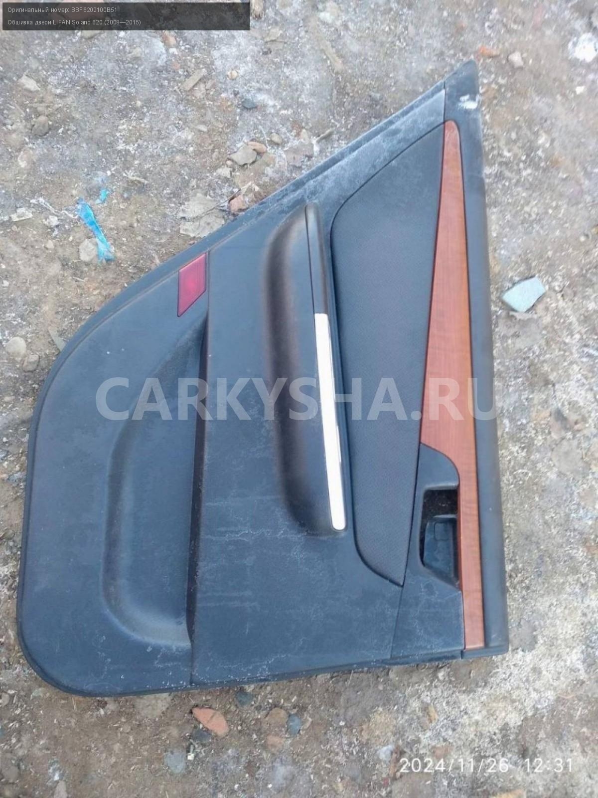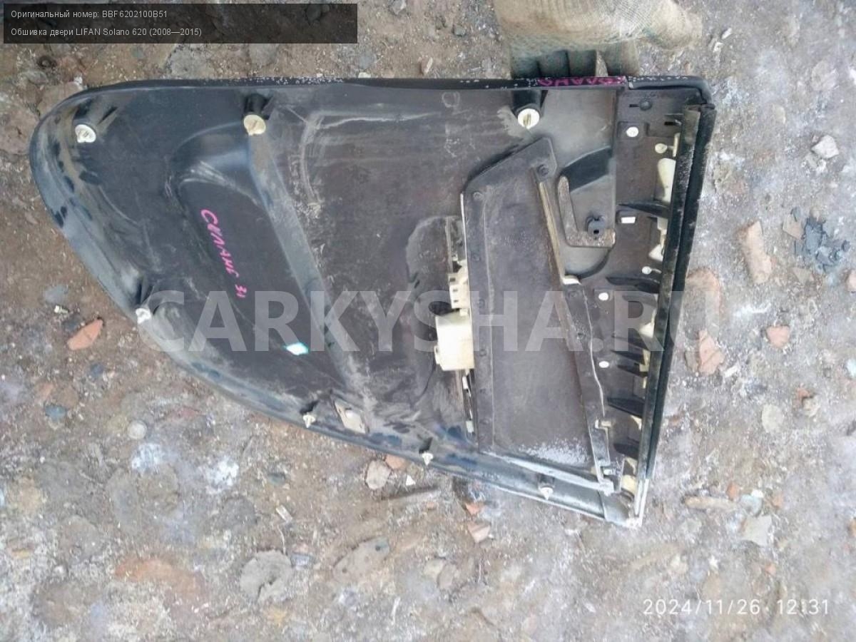 LIFAN Solano, обшивка двери задней левой.\nАртикул: 6453\n\nОриг. номер: BBF6202100B51\nПроизводитель: LIFAN\nПримечание:Лифан Солано, обшивка двери задней левой, б/у. \n\nМарка: LIFAN\nМодель: Solano 620 (2008—2015)\nГод выпуска: 2013\nКузов тип: Седан\nДвигатель номер: LF481Q3\nМодель двигателя: инжектор\nОбъем: 1.6\nТопливо: Бензин\nКоробка: Механика\nЦвет: Черный\nПраво/Лево: Лево\nПеред/Зад: Зад\nСовместимости: LIFAN Solano 620 (2008—2015) 1.6 MT (106 л.с.)\nСовместимость: