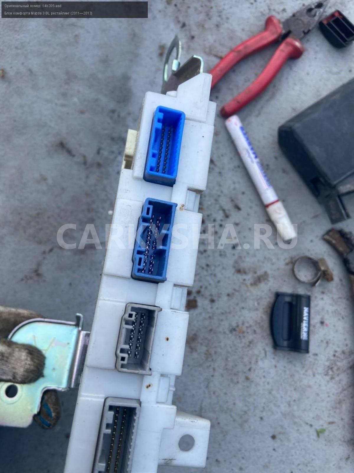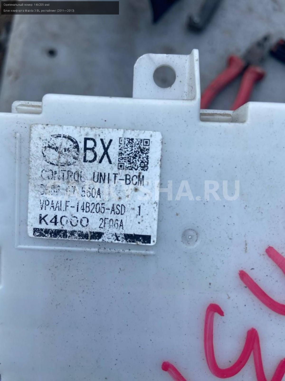 Mazda 3 BL, блок комфорта.\nАртикул: 5460\n\nОриг. номер: 14b205-asd\nПроизводитель: MAZDA\nПримечание:Мазда 3 BL, блок комфорта, б/у. \n\nМарка: Mazda\nМодель: 3 BL рестайлинг (2011—2013)\nГод выпуска: 2012\nКузов тип: Седан\nДвигатель номер: Z6\nМодель двигателя: инжектор\nОбъем: 1.6\nТопливо: Бензин\nКоробка: Автомат\nЦвет: Темно-Сервй\nСовместимости: Mazda 3 BL рестайлинг (2011—2013) 1.6 AT (105 л.с.)\nСовместимость:
