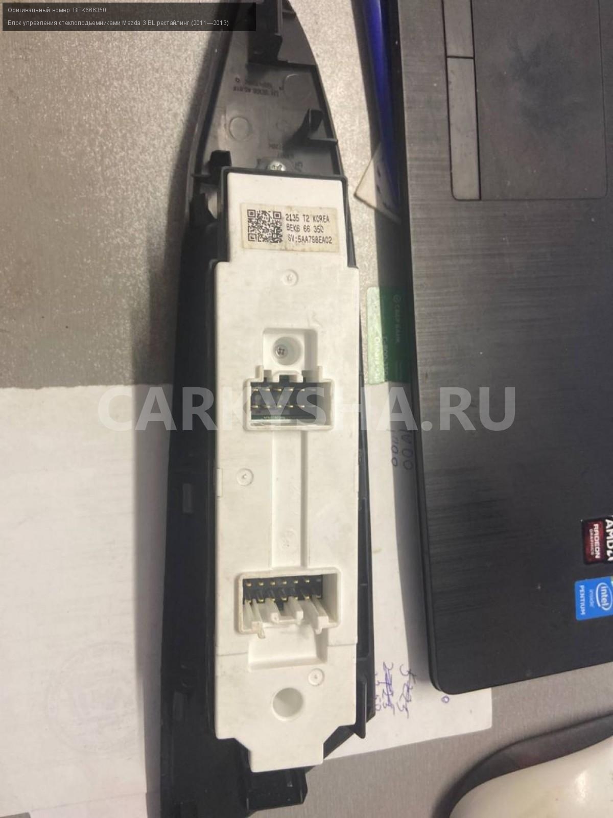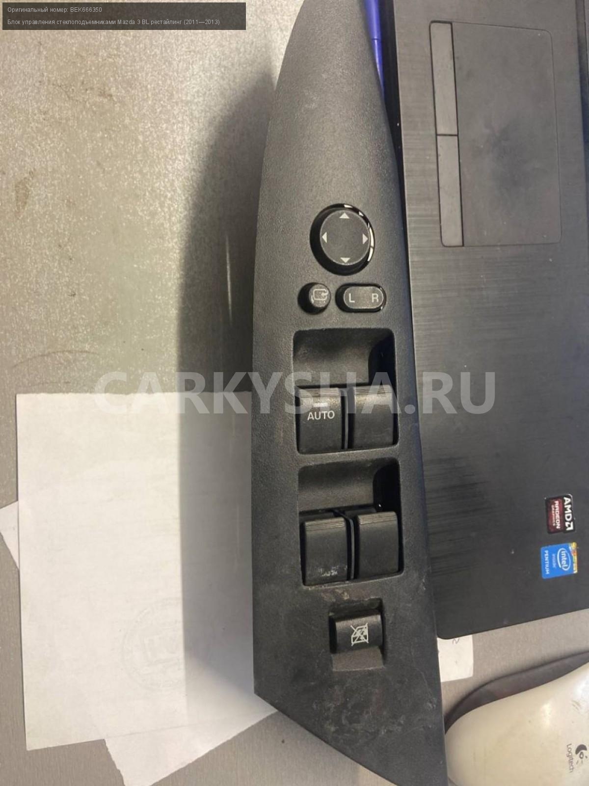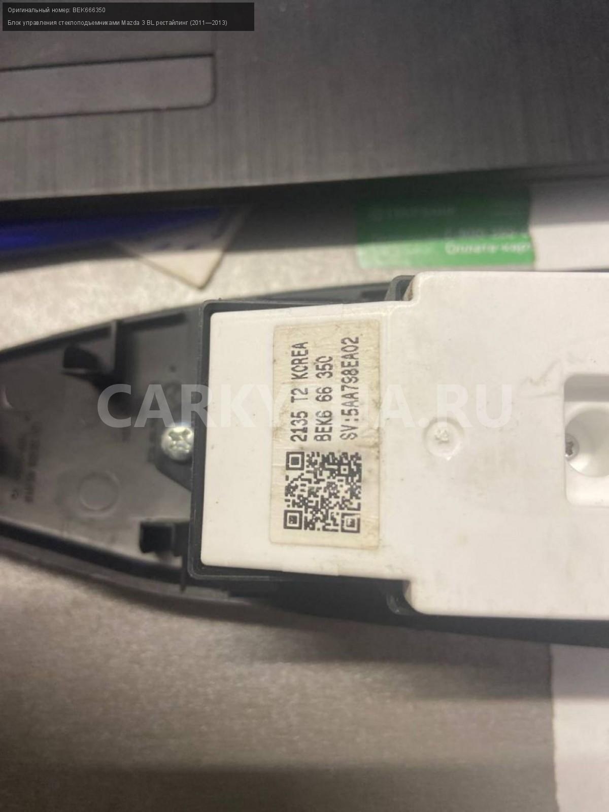 Mazda 3BL рест. блок управления стеклоподъемниками\nАртикул: 5343\n\nОриг. номер: BEK666350\nПроизводитель: MAZDA\nПримечание:Мазда 3 BL рестайлинг, блок управления стеклоподъемниками, левый руль, б/у. \n\nМарка: Mazda\nМодель: 3 BL рестайлинг (2011—2013)\nГод выпуска: 2012\nКузов тип: Седан\nДвигатель номер: Z6\nМодель двигателя: инжектор\nОбъем: 1.6\nТопливо: Бензин\nКоробка: Автомат\nЦвет: Темно-Сервй\nСовместимости: Mazda 3 BL рестайлинг (2011—2013) 1.6 AT (105 л.с.)\nСовместимость: