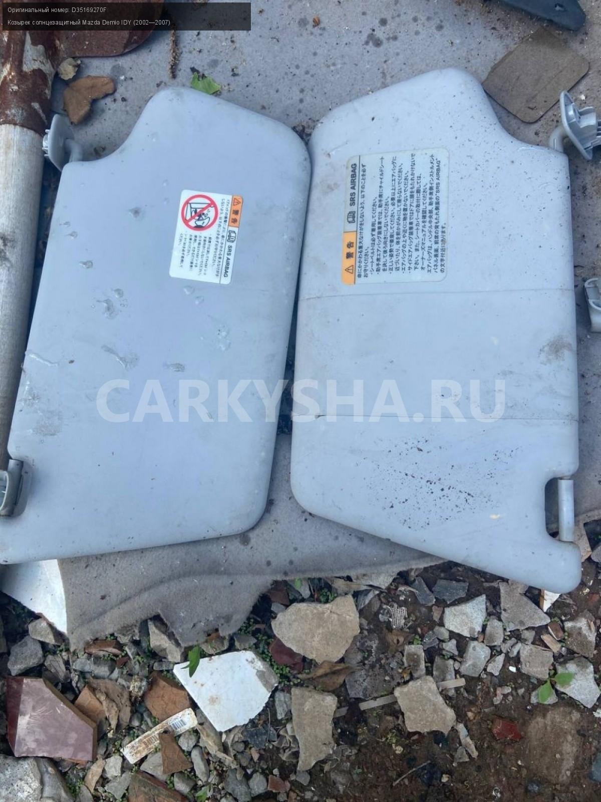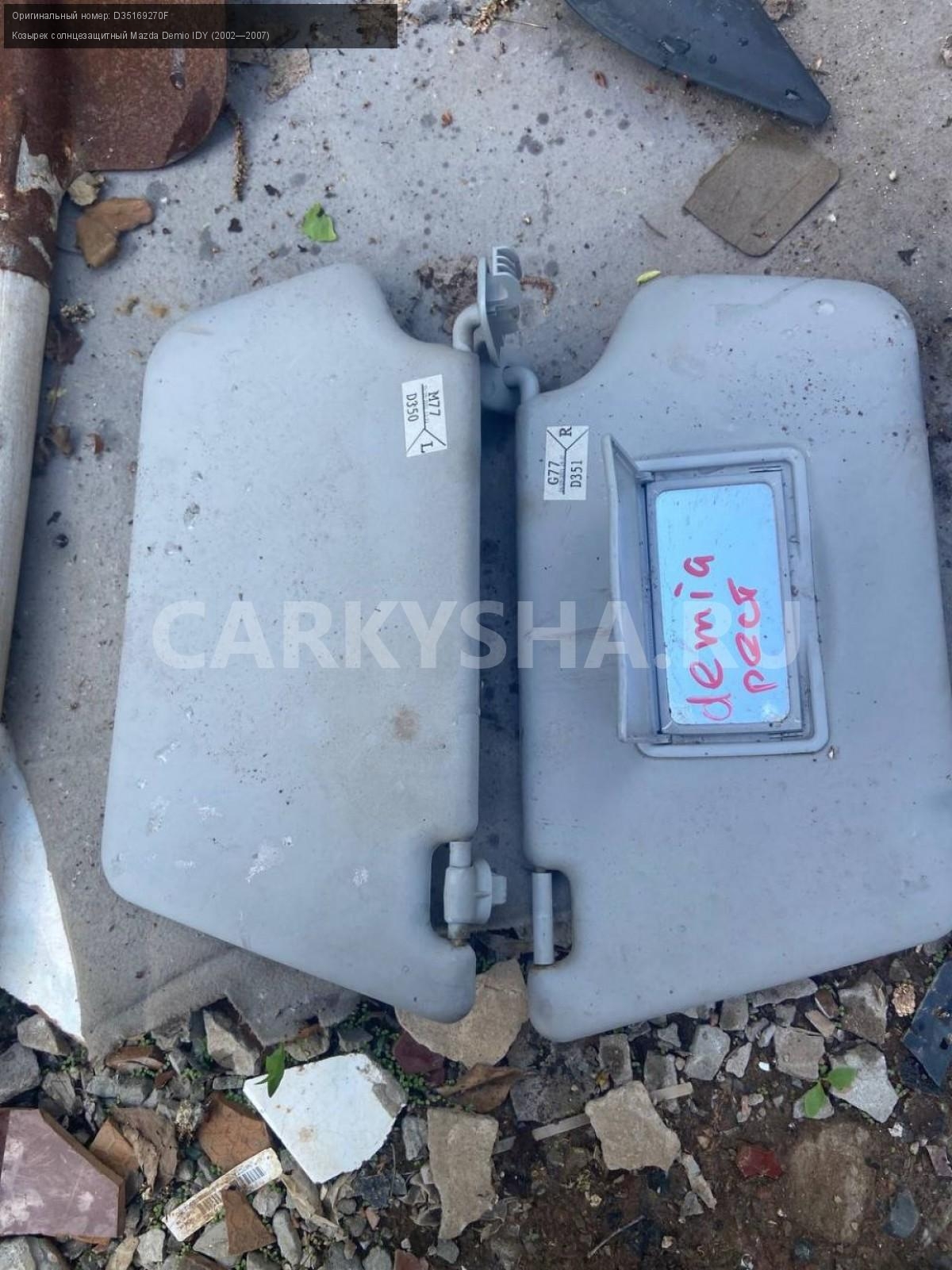 Mazda Demio DY3, козырьки солнцезащитные.\nАртикул: 5100\n\nОриг. номер: D35169270F\nПроизводитель: MAZDA\nПримечание:Мазда Демио DY3, козырьки солнцезащитные, цена за пару, б/у. \n\nМарка: Mazda\nМодель: Demio IDY (2002—2007)\nГод выпуска: 2003\nКузов номер: DY3W254283\nКузов тип: Хетчбэк\nДвигатель номер: DY3\nМодель двигателя: инжектор\nОбъем: 1.4\nТопливо: Бензин\nКоробка: Автомат\nЦвет: Синий\nПраво/Лево: Право/Лево\nСовместимости: Mazda Demio IDY (2002—2007) 1.4 AT (91 л.с.)\nСовместимость: