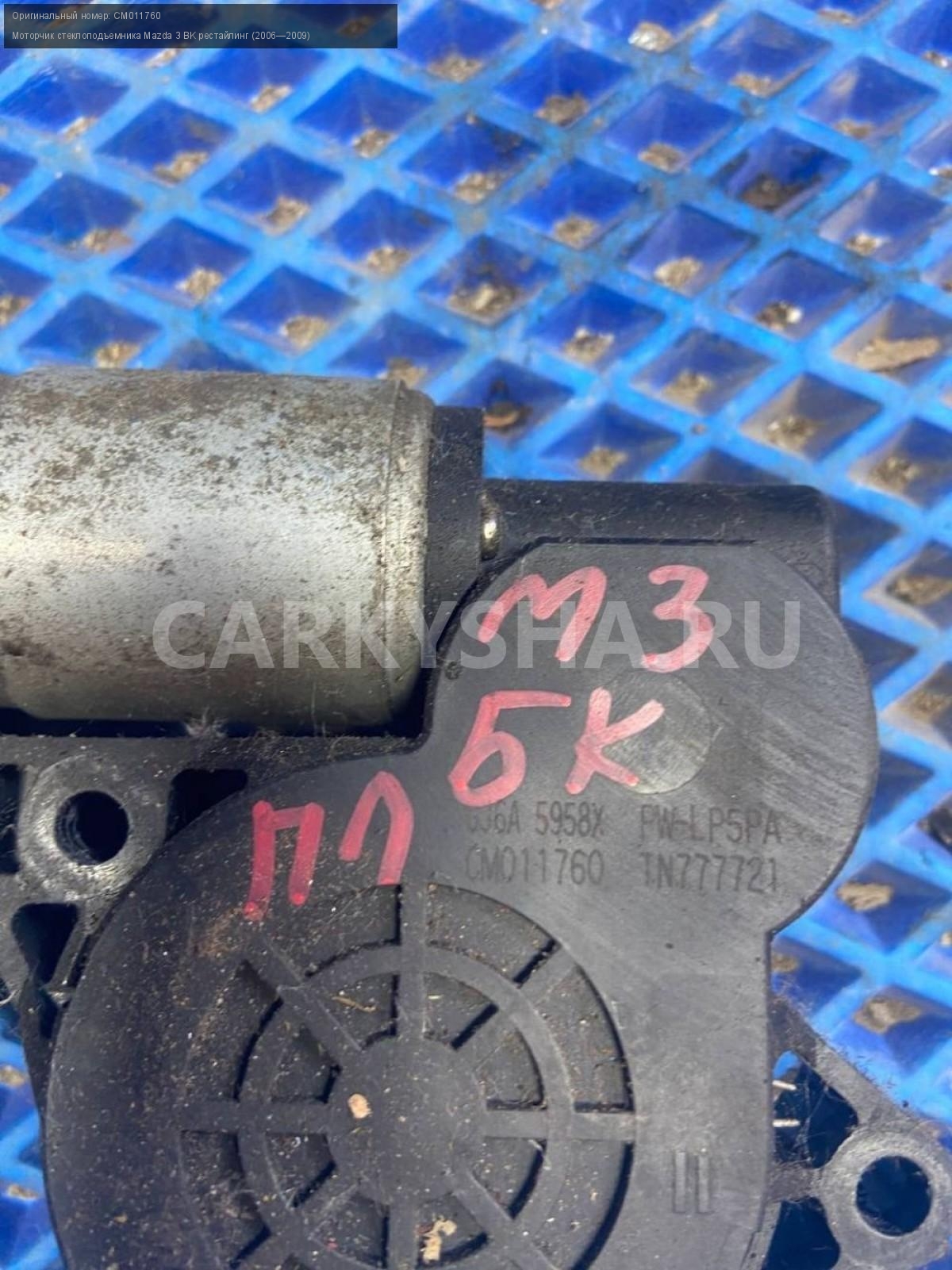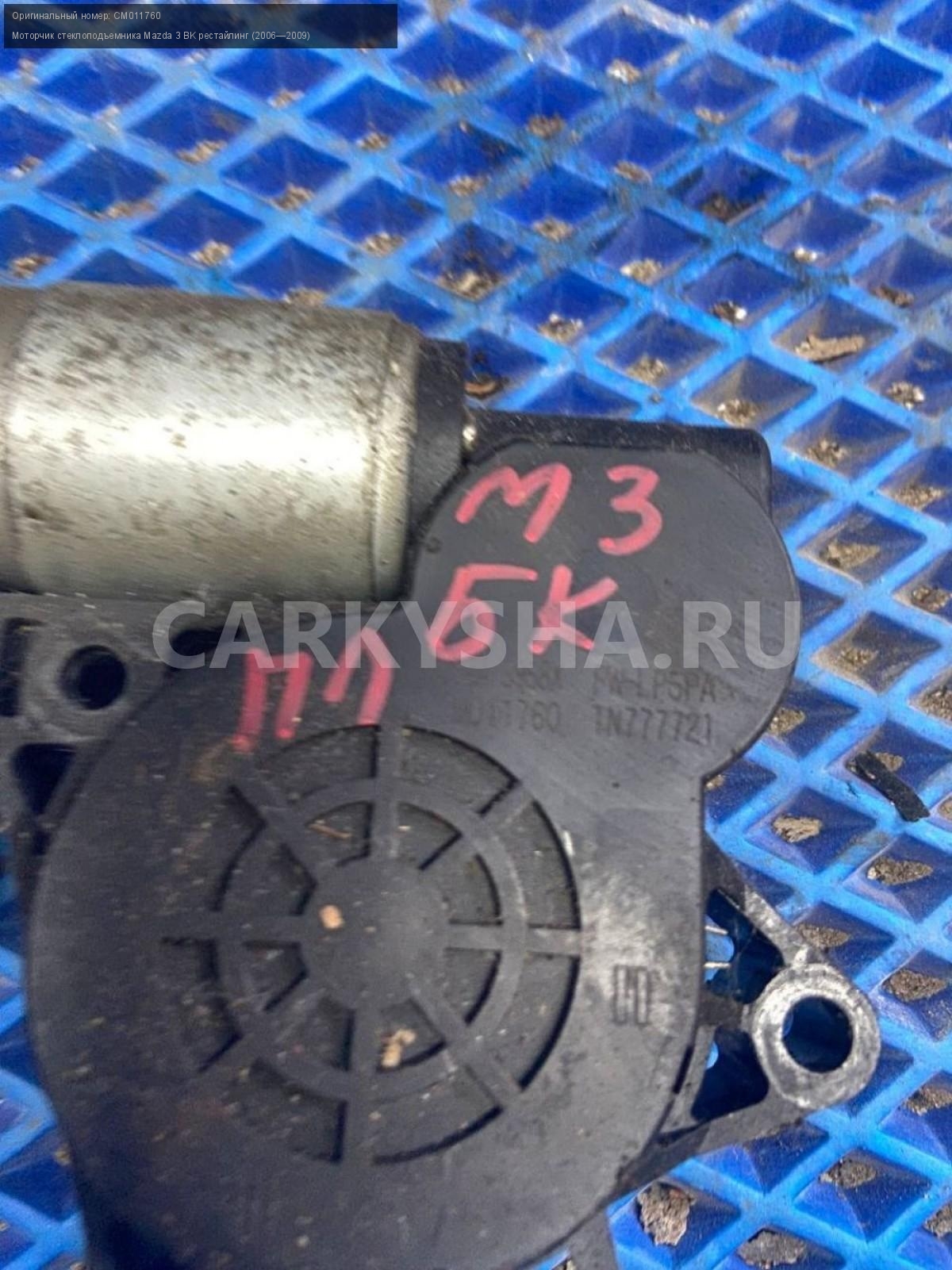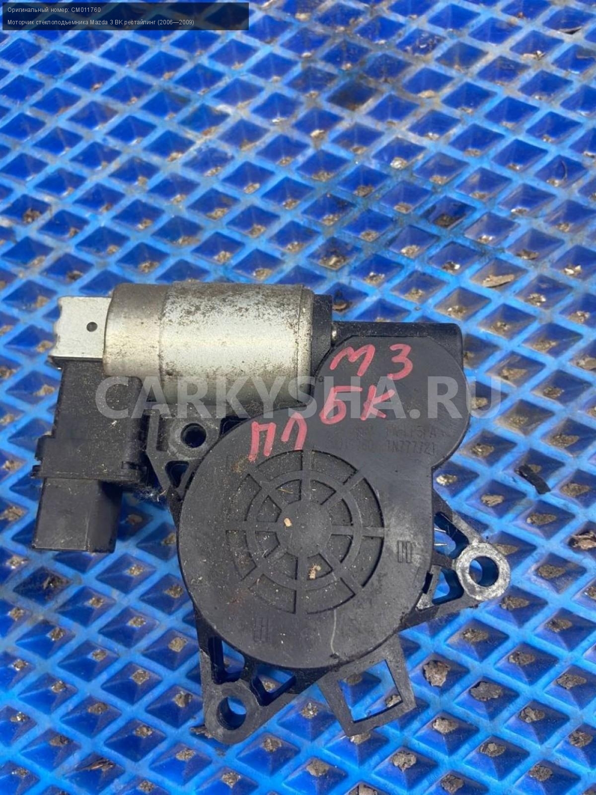 Mazda 3 BK, моторчик переднего левого стеклоподъем\nАртикул: 8189\n\nОриг. номер: CM011760\nПроизводитель: MAZDA\nПримечание:Мазда 3 ВК, моторчик переднего левого стеклоподъемника, б/у. \n\nМарка: Mazda\nМодель: 3 BK рестайлинг (2006—2009)\nГод выпуска: 2007\nКузов тип: Хетчбэк\nДвигатель номер: Z6\nМодель двигателя: инжектор\nОбъем: 1.6\nТопливо: Бензин\nКоробка: Автомат\nЦвет: 34N\nПраво/Лево: Лево\nПеред/Зад: Перед\nСовместимости: Mazda 3 BK рестайлинг (2006—2009) 1.6 AT (105 л.с.)\nСовместимость: