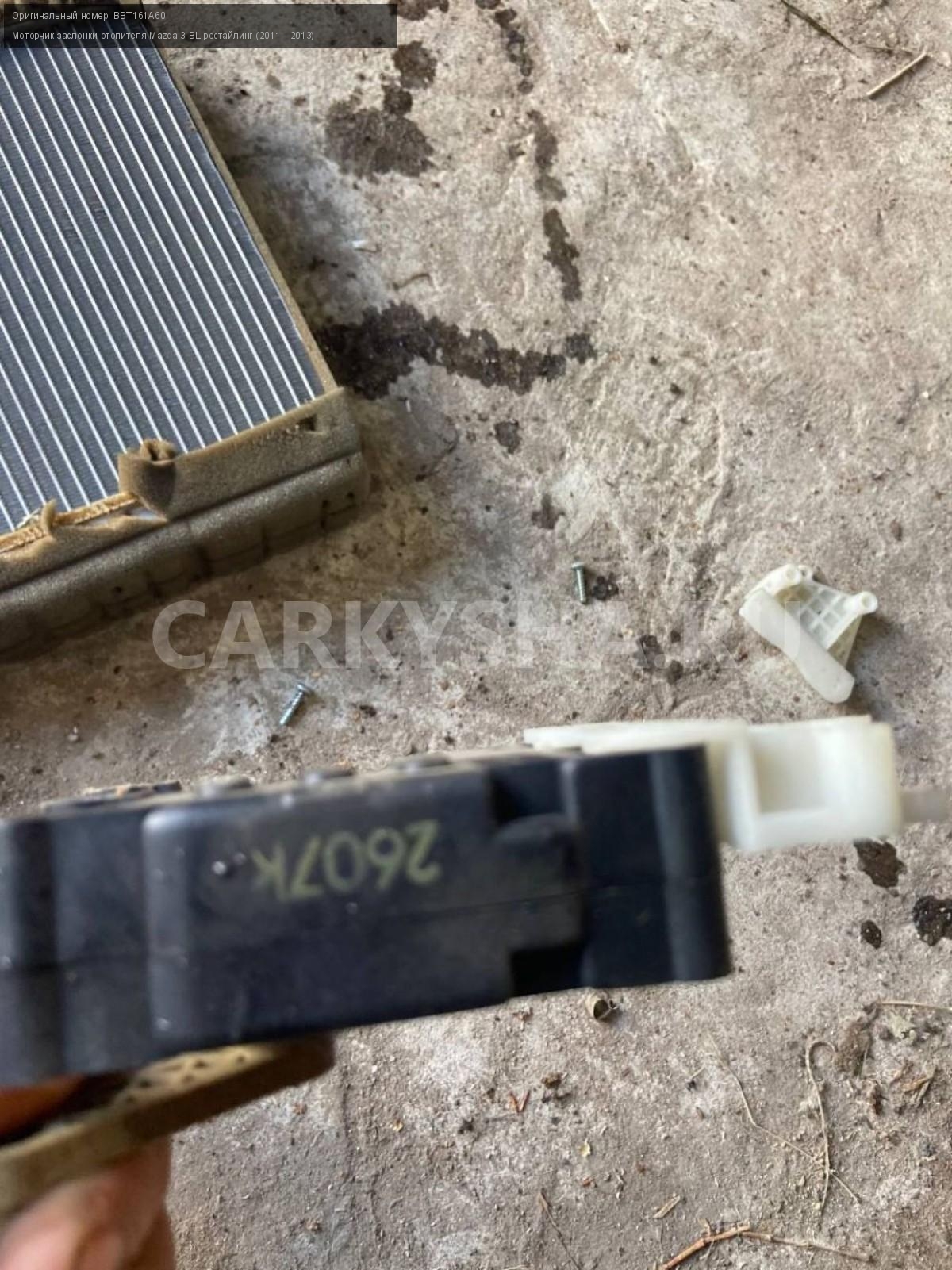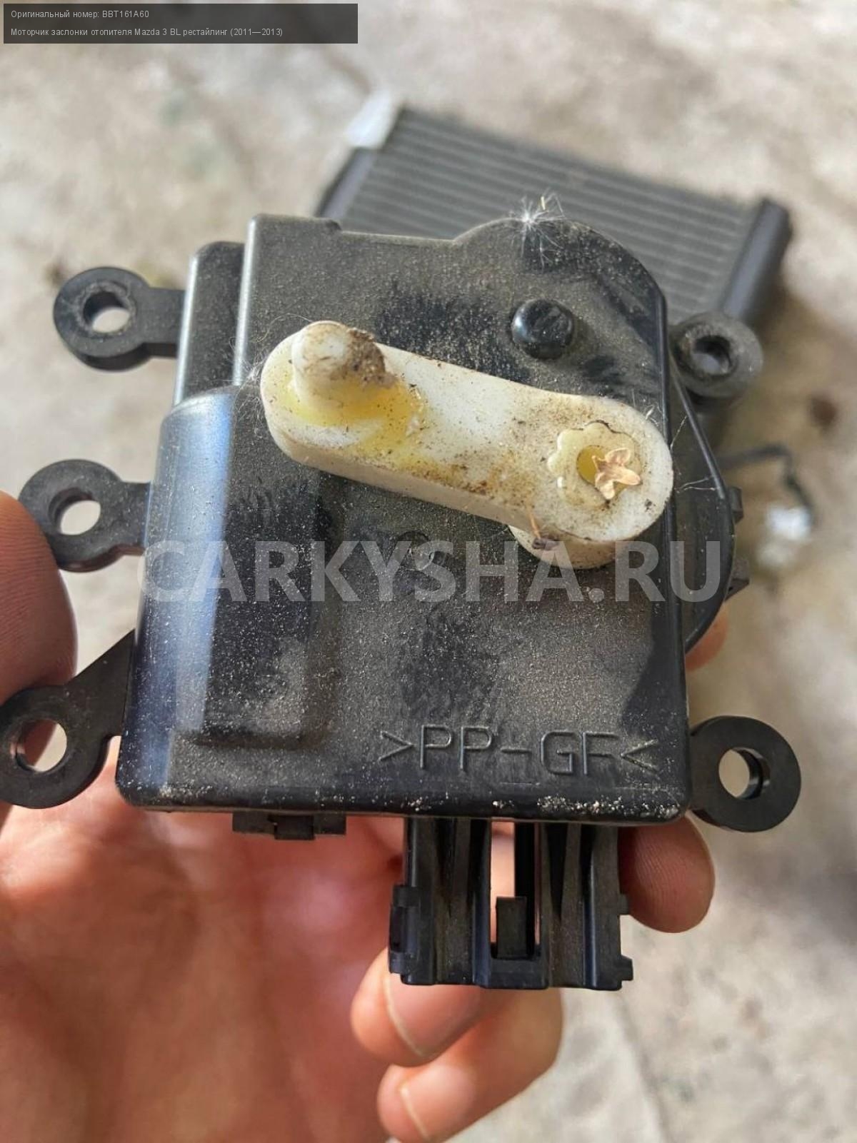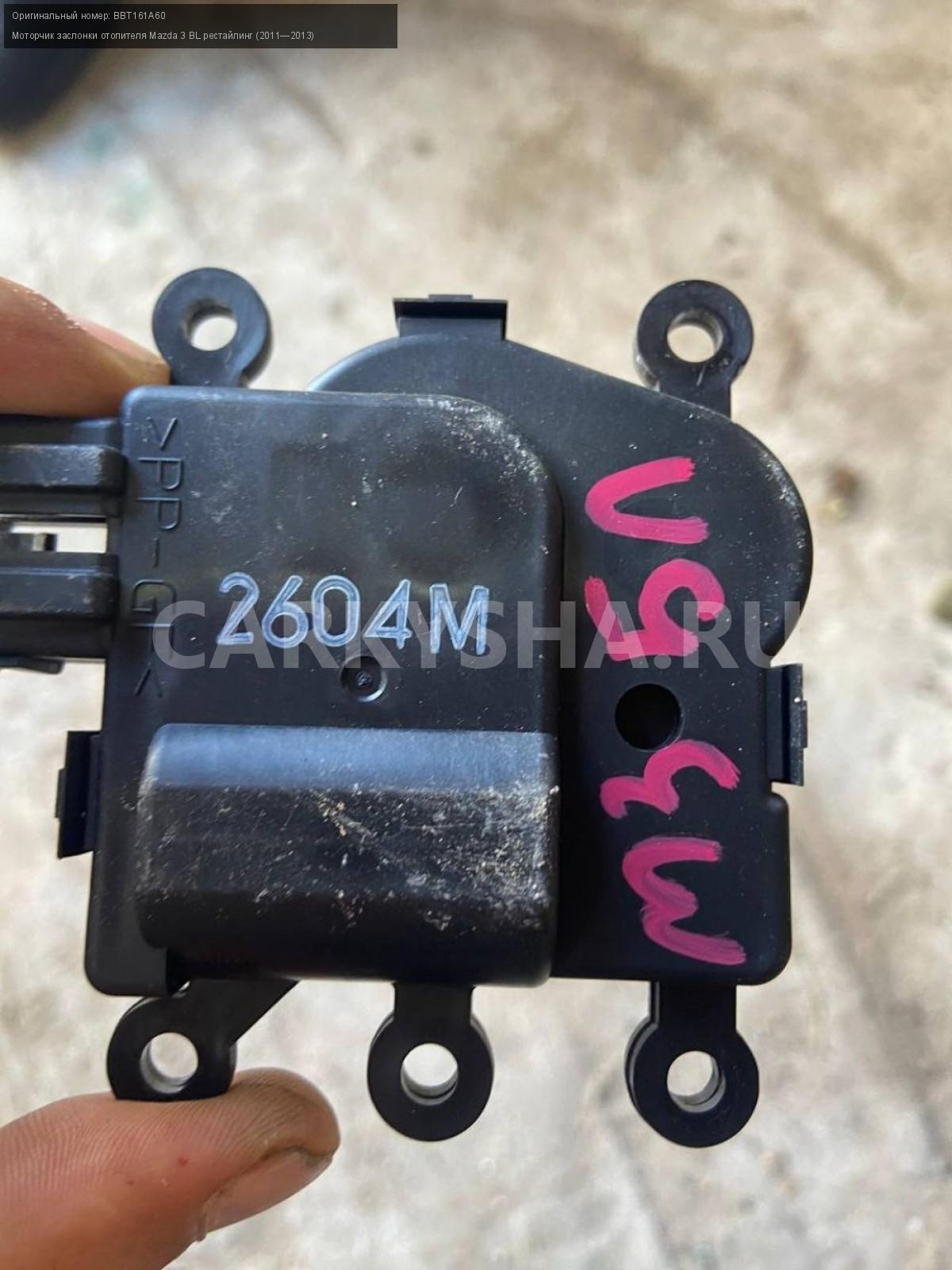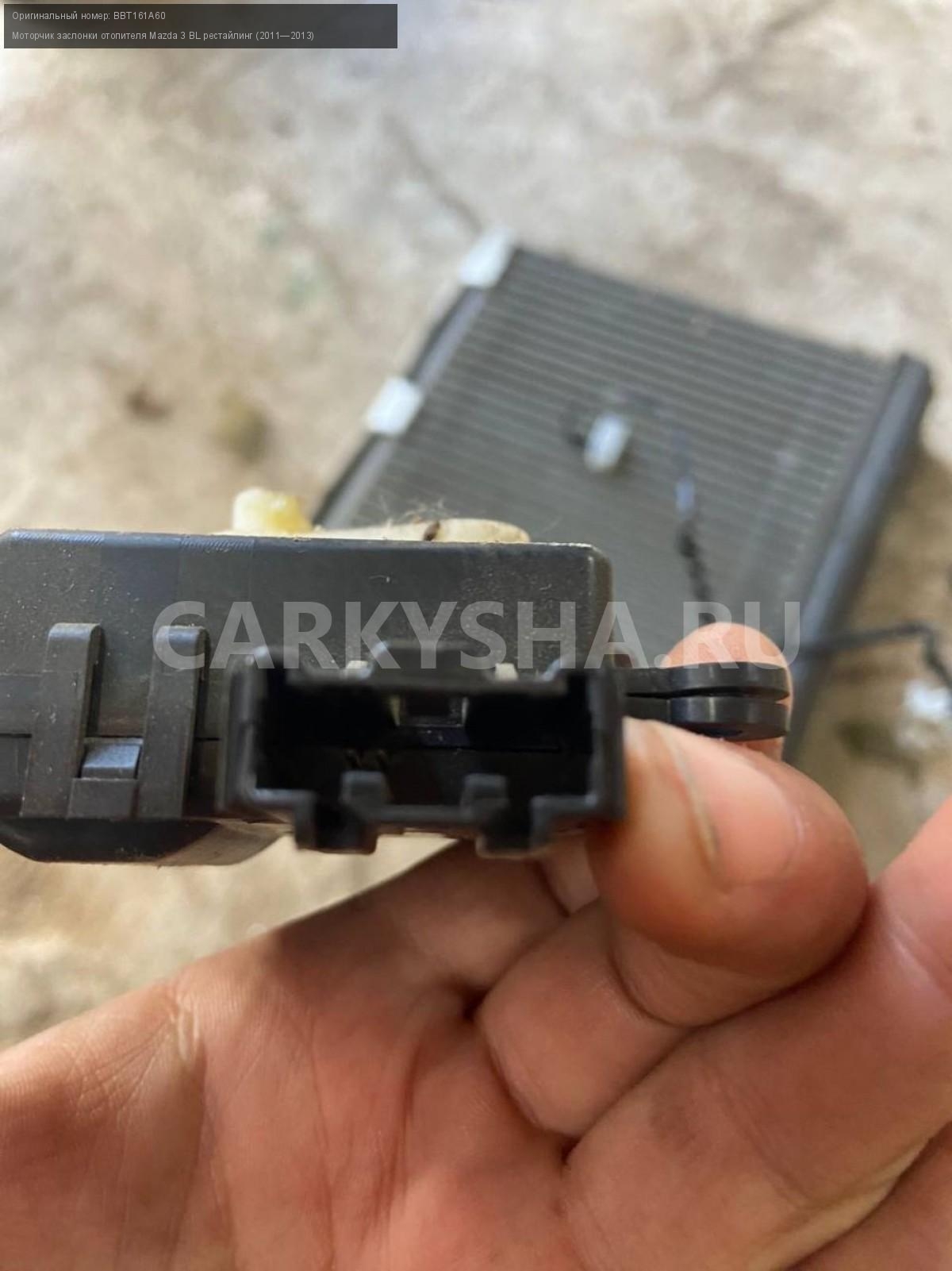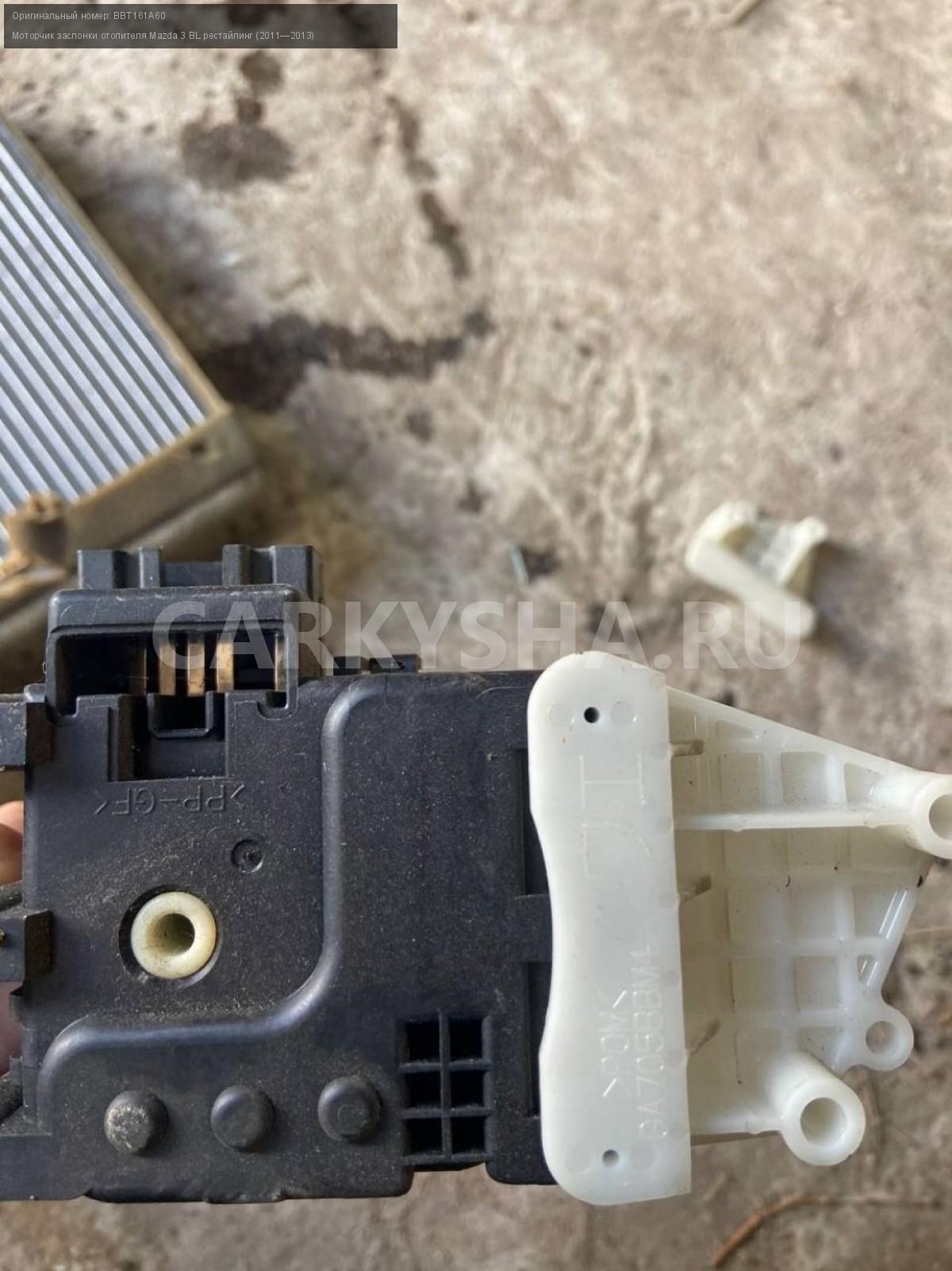 Mazda 3 BL, моторчик заслонки печки.\nАртикул: 5290\n\nОриг. номер: BBT161A60\nПроизводитель: MAZDA\nПримечание:Мазда 3 BL, моторчик заслонки печки, цена за штуку, б/у. \n\nМарка: Mazda\nМодель: 3 BL рестайлинг (2011—2013)\nГод выпуска: 2012\nКузов тип: Седан\nДвигатель номер: Z6\nМодель двигателя: инжектор\nОбъем: 1.6\nТопливо: Бензин\nКоробка: Автомат\nЦвет: Темно-Сервй\nСовместимости: Mazda 3 BL рестайлинг (2011—2013) 1.6 AT (105 л.с.)\nСовместимость: