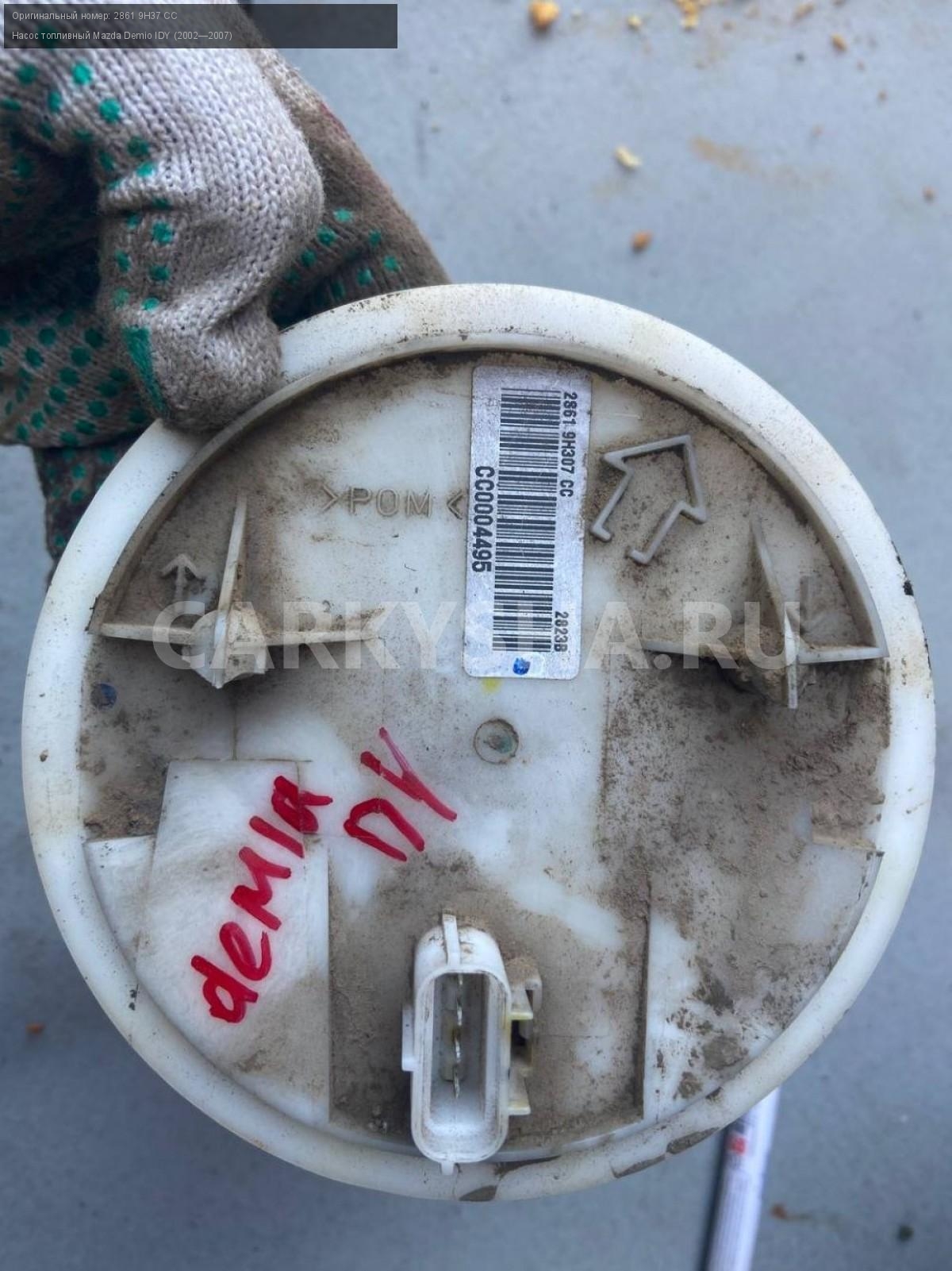 Mazda Demio DY3, насос топливный на запчасти.\nАртикул: 4948\n\nОриг. номер: 2861 9H37 CC\nПроизводитель: MAZDA\nПримечание:Мазда Демио DY3, насос топливный на запчасти ( сломаны штуцера), бу. \n\nМарка: Mazda\nМодель: Demio IDY (2002—2007)\nГод выпуска: 2003\nКузов номер: DY3W254283\nКузов тип: Хетчбэк\nДвигатель номер: DY3\nМодель двигателя: инжектор\nОбъем: 1.4\nТопливо: Бензин\nКоробка: Автомат\nЦвет: Синий\nСовместимости: Mazda Demio IDY (2002—2007) 1.4 AT (91 л.с.)\nСовместимость: