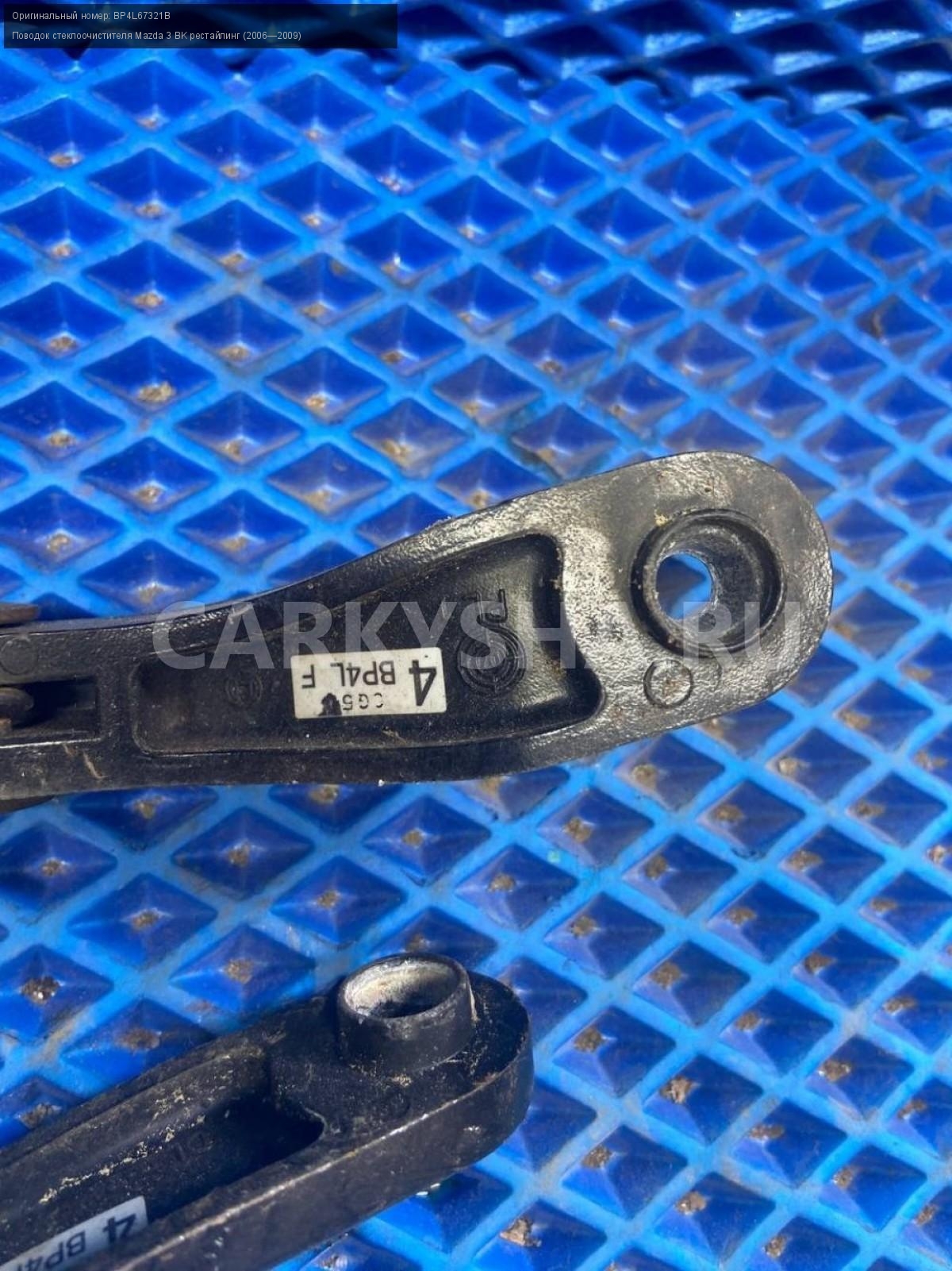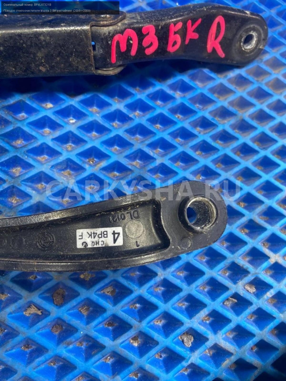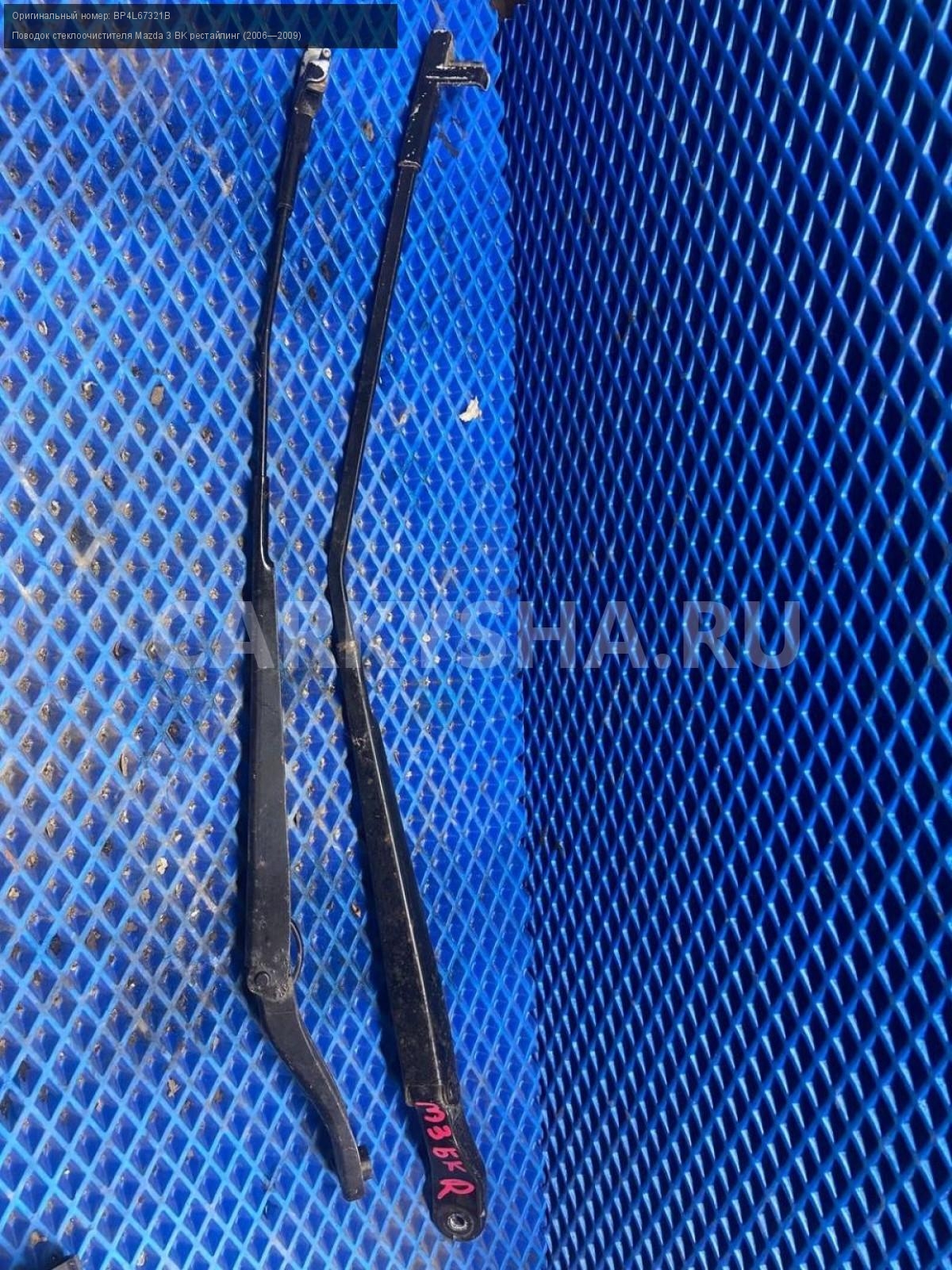 Mazda 3 BK, поводки дворников, пара.\nАртикул: 8192\n\nОриг. номер: BP4L67321B\nПроизводитель: MAZDA\nПримечание:Мазда 3 ВК, поводки дворников, цена за пару, б/у. \n\nМарка: Mazda\nМодель: 3 BK рестайлинг (2006—2009)\nГод выпуска: 2007\nКузов тип: Хетчбэк\nДвигатель номер: Z6\nМодель двигателя: инжектор\nОбъем: 1.6\nТопливо: Бензин\nКоробка: Автомат\nЦвет: 34N\nПраво/Лево: Право/Лево\nПеред/Зад: Перед\nСовместимости: Mazda 3 BK рестайлинг (2006—2009) 1.6 AT (105 л.с.)\nСовместимость: