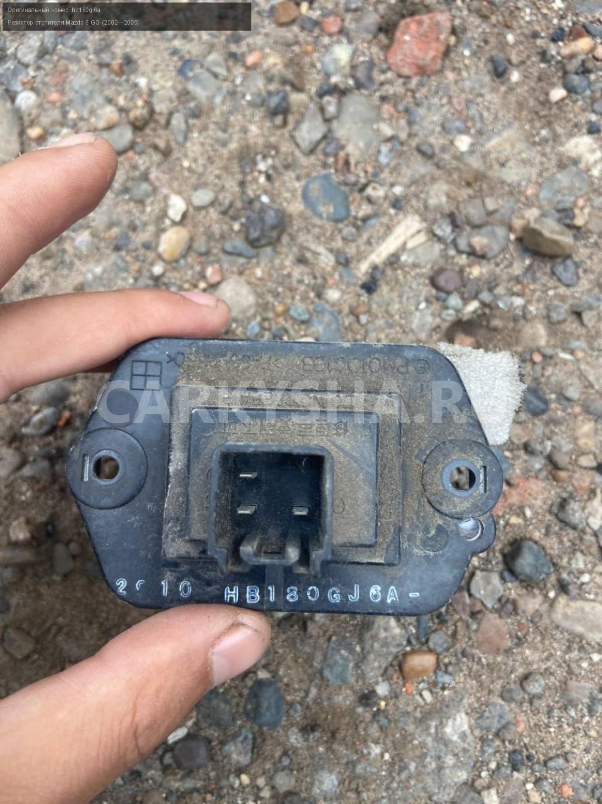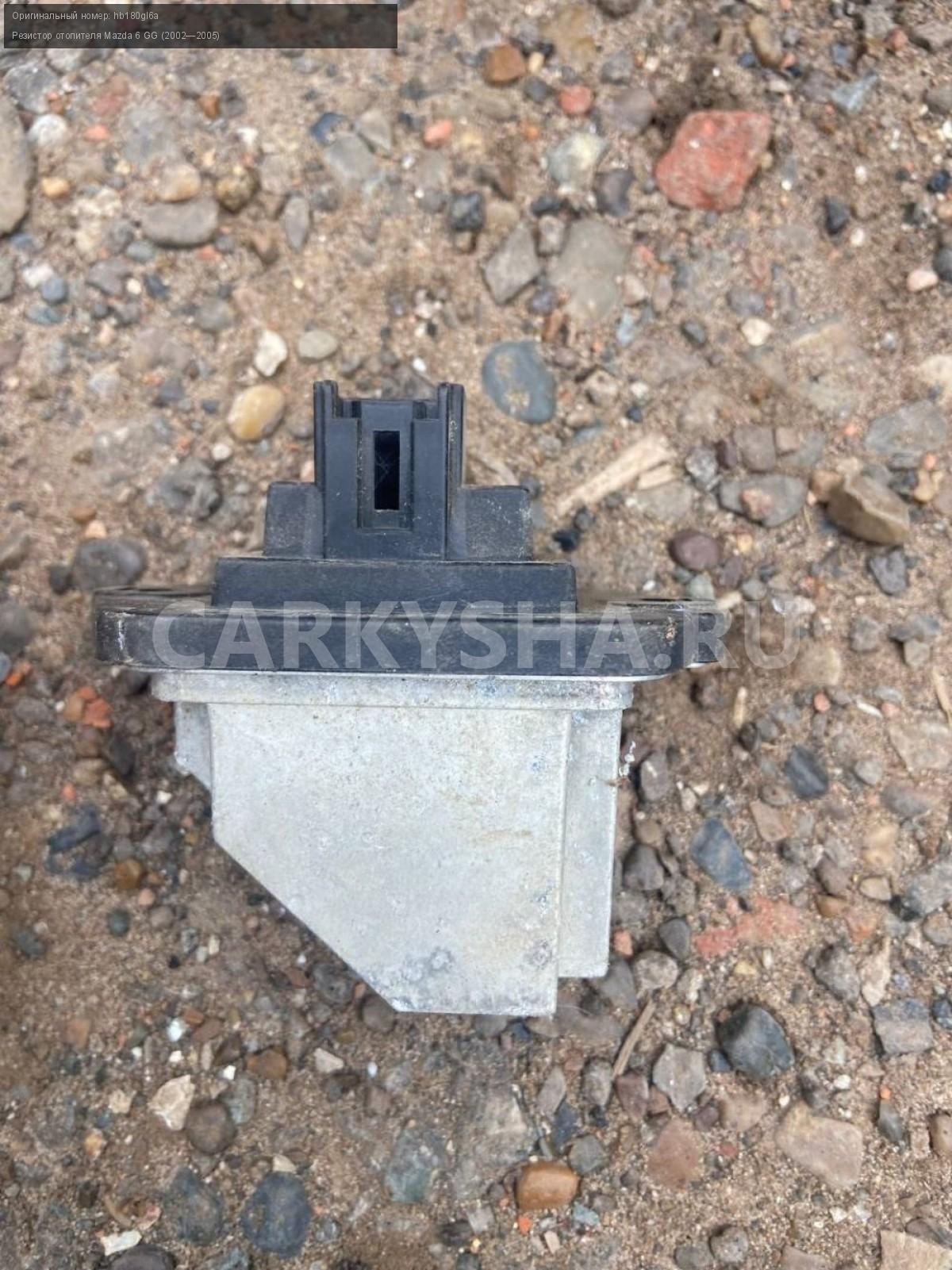 Mazda 6 GG , резистор отопителя.\nАртикул: 5409\n\nОриг. номер: hb180gl6a\nПроизводитель: MAZDA\nПримечание:Мазда 6 GG, резистор отопителя, б/у \n\nМарка: Mazda\nМодель: 6 GG (2002—2005)\nГод выпуска: 2003\nКузов тип: Седан\nДвигатель номер: L3\nМодель двигателя: инжектор\nОбъем: 2.3\nТопливо: Бензин\nКоробка: Автомат\nЦвет: Синий\nСовместимости: Mazda 6 GG (2002—2005) 2.3 AT (166 л.с.)\nСовместимость: