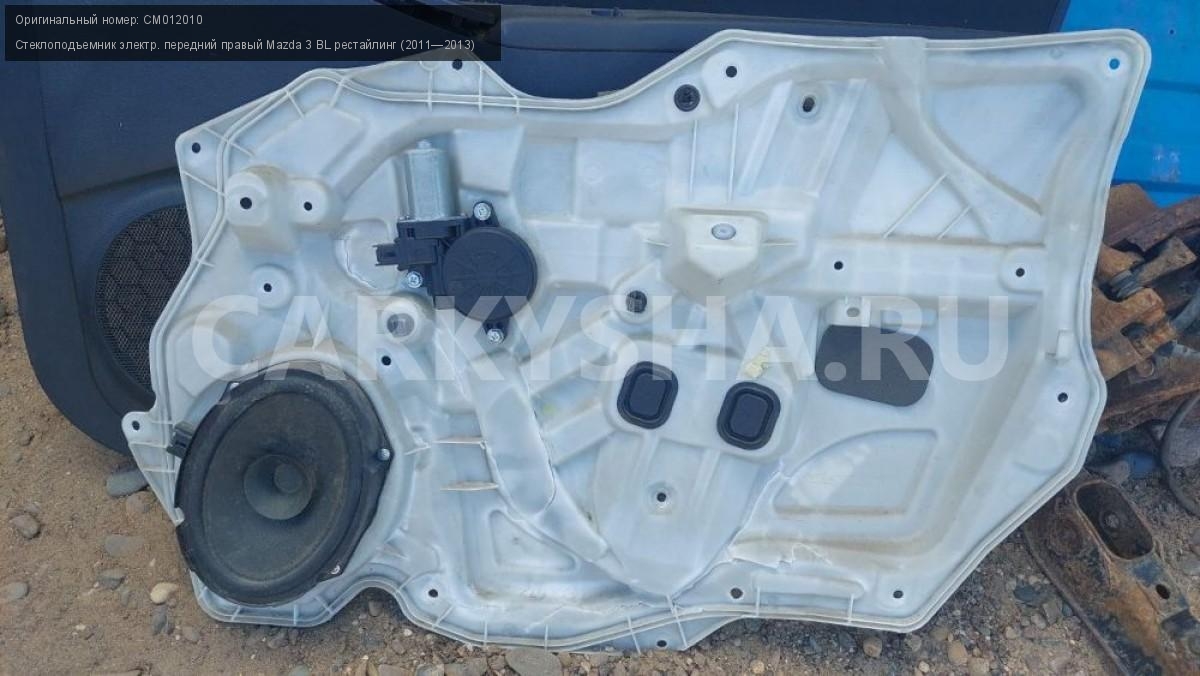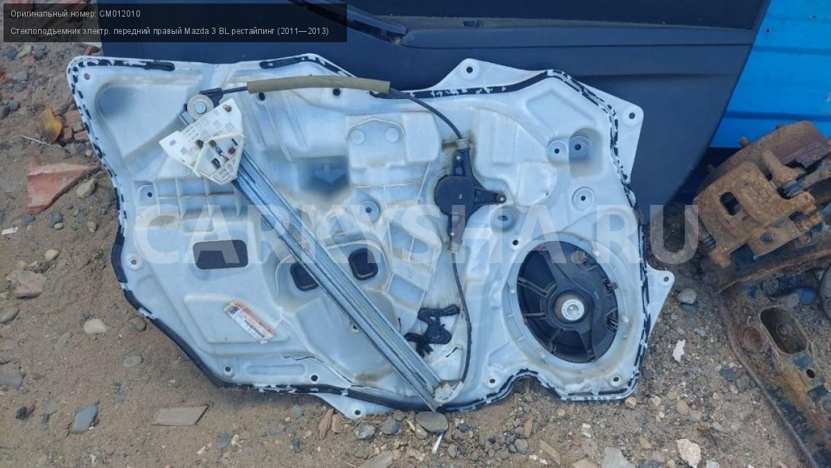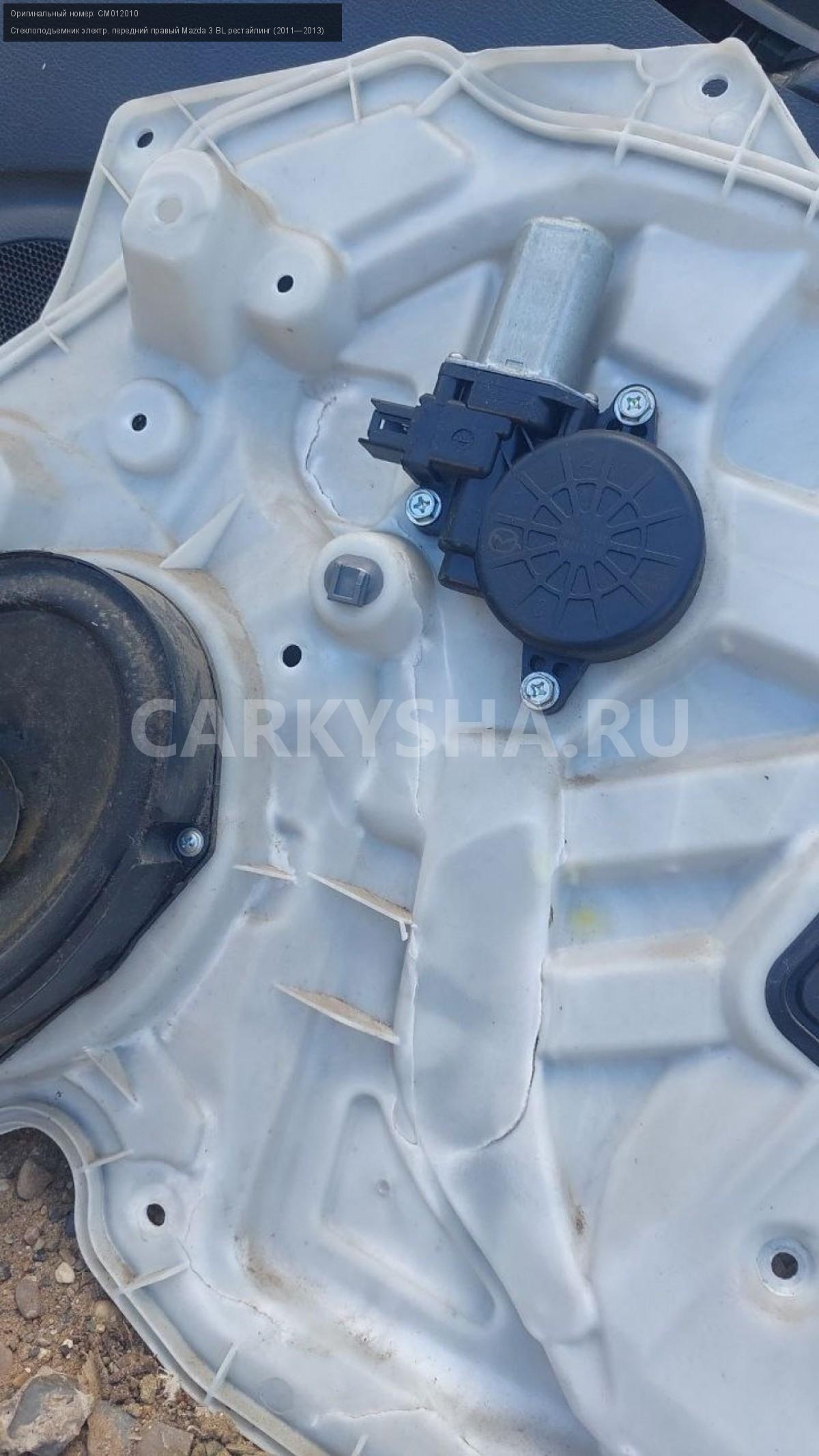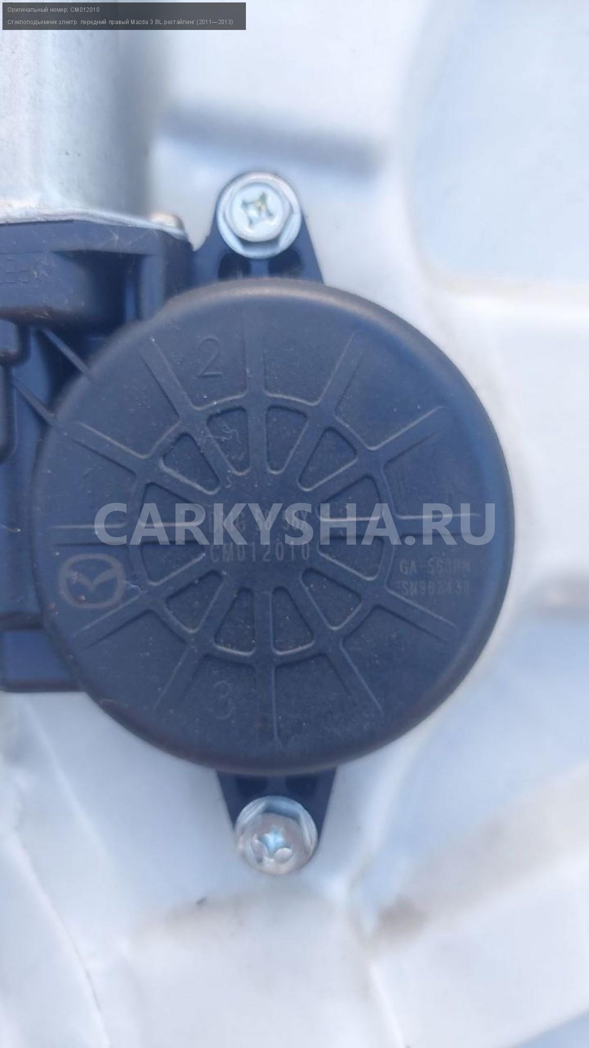 Mazda 3 BL, стеклоподъемник передний правый.\nАртикул: 5237\n\nОриг. номер: CM012010\nПроизводитель: MAZDA\nПримечание:Мазда 3 BL, стеклоподъемник передний правый, дефект, б/у. \n\nМарка: Mazda\nМодель: 3 BL рестайлинг (2011—2013)\nГод выпуска: 2012\nКузов тип: Седан\nДвигатель номер: Z6\nМодель двигателя: инжектор\nОбъем: 1.6\nТопливо: Бензин\nКоробка: Автомат\nЦвет: Темно-Сервй\nСовместимости: Mazda 3 BL рестайлинг (2011—2013) 1.6 AT (105 л.с.)\nСовместимость: