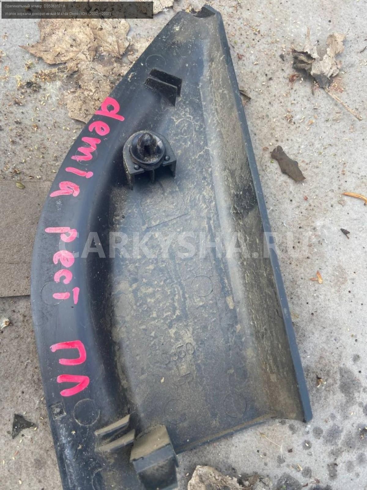 Mazda Demio DY3, уголок зеркала левый.\nАртикул: 5098\n\nОриг. номер: D35069171A\nПроизводитель: MAZDA\nПримечание:Мазда Демио DY3, уголок зеркала левый , б/у. \n\nМарка: Mazda\nМодель: Demio IDY (2002—2007)\nГод выпуска: 2003\nКузов номер: DY3W254283\nКузов тип: Хетчбэк\nДвигатель номер: DY3\nМодель двигателя: инжектор\nОбъем: 1.4\nТопливо: Бензин\nКоробка: Автомат\nЦвет: Синий\nПраво/Лево: Лево\nСовместимости: Mazda Demio IDY (2002—2007) 1.4 AT (91 л.с.)\nСовместимость: