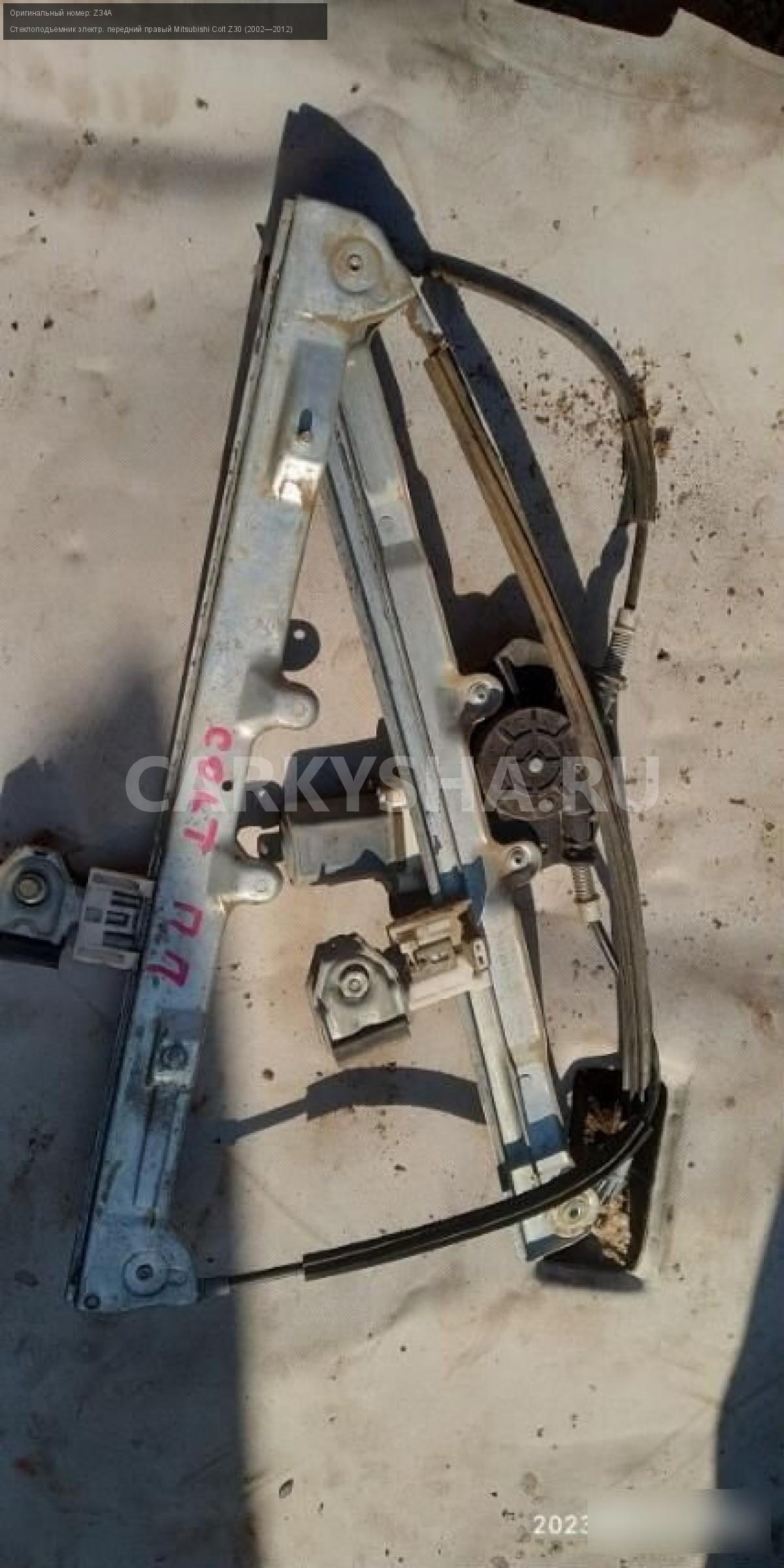 Mitsubishi colt 6 стеклоподъемник передний правый\nАртикул: 726\n\nОриг. номер: Z34A\nПроизводитель: MITSUBISHI\nПримечание:Mitsubishi colt 6 стеклоподъемник передний правый.НАЛИЧИЕ ЗАПЧАСТИ УТОЧНИТЕ ПО ТЕЛЕФОНУ ИЛИ В СООБЩЕНИЯХ,б/у, а так же множество авто в разборе, работаем с регионами отправка тк, выкуп авто после дтп по всей России, отправка тк осуществляется после 100% оплаты, наложенным платежом не работаем, стоимость доставки не рассчитываем\n\nМарка: Mitsubishi\nМодель: Colt Z30 (2002—2012)\nКузов тип: Хетчбэк\nОбъем: 1.3\nТопливо: Бензин\nКоробка: Робот\nСовместимости: Mitsubishi Colt Z30 (2002—2012) 1.3 AMT (95 л.с.)\nСовместимость: